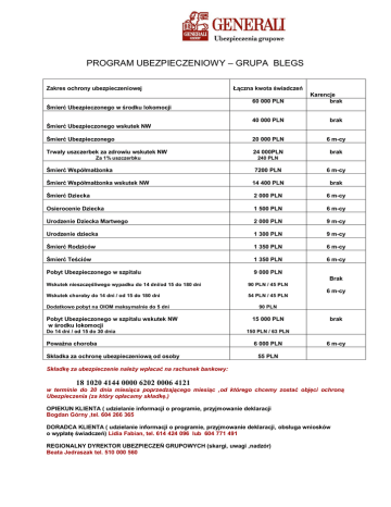 PROGRAM UBEZPIECZENIOWY – GRUPA BLEGS Zakres ochrony ubezpieczeniowej Łączna kwota świadczeń 60 000 PLN Karencje brak 40 000 PLN brak Śmierć Ubezpieczonego 20 000 PLN 6 m-cy Trwały uszczerbek za zdrowiu wskutek NW 24 000PLN brak Śmierć Ubezpieczonego w środku lokomocji Śmierć Ubezpieczonego wskutek NW Za 1% uszczerbku Śmierć Współmałżonka 240 PLN 7200 PLN 6 m-cy Śmierć Współmałżonka wskutek NW 14 400 PLN brak Śmierć Dziecka 2 000 PLN 6 m-cy Osierocenie Dziecka 1 500 PLN 6 m-cy Urodzenie Dziecka Martwego 2 000 PLN 9 m-cy Urodzenie dziecka 1 300 PLN 9 m-cy Śmierć Rodziców 1 350 PLN 6 m-cy Śmierć Teściów 1 350 PLN 6 m-cy Pobyt Ubezpieczonego w szpitalu 9 000 PLN Brak Wskutek nieszczęśliwego wypadku do 14 dni/od 15 do 180 dni 90 PLN / 45 PLN Wskutek choroby do 14 dni / od 15 do 180 dni 54 PLN / 45 PLN Dodatkowo pobyt na OIOM maksymalnie do 5 dni Pobyt Ubezpieczonego w szpitalu wskutek NW w środku lokomocji Do 14 dni / od 15 do 30 dnia Poważna choroba Składka za ochronę ubezpieczeniową od osoby 6 m-cy 90 PLN 15 000 PLN brak 150 PLN / 63 PLN 6 000 PLN 6 m-cy 55 PLN Składkę za ubezpieczenie należy wpłacać na rachunek bankowy: 18 1020 4144 0000 6202 0006 4121 w terminie do 20 dnia miesiąca poprzedzającego miesiąc ,od którego chcemy zostać objęci ochroną Ubezpieczenia (za który opłacamy składkę.) OPIEKUN KLIENTA ( udzielanie informacji o programie, przyjmowanie deklaracji Bogdan Górny ,tel. 604 266 365 DORADCA KLIENTA ( udzielanie informacji o programie, przyjmowanie deklaracji, obsługa wniosków o wypłatę świadczeń) Lidia Fabian, tel. 614 424 096 lub 604 771 491 REGIONALNY DYREKTOR UBEZPIECZEŃ GRUPOWYCH (skargi, uwagi ,nadzór) Beata Jedraszak tel. 510 000 560 Wyciąg z OWU Certum Max. Przystąpienie i wystąpienie z ubezpieczenia Początek odpowiedzialności Karencje (ograniczenie odpowiedzialności ) Katalog Poważnych Chorób Pobyt Ubezpieczonego w szpitalu Pobyt Ubezpieczonego w szpitalu wskutek NW w środku lokomocji Indywidualna Kontynuacja Ważne informacje. Obowiązki Ubezpieczonego Do ubezpieczenia mogą przystępować osoby, które ukończyły 15 rok życia i nie ukończyły 50 roku życia. Ochrona ubezpieczeniowa w stosunku do poszczególnego ubezpieczonego trwa do ukończenia przez Niego 65 roku życia. Ochrona ubezpieczeniowa rozpoczyna się w dniu wskazanym w certyfikacie, nie wcześniej niż od pierwszego dnia miesiąca następującego po miesiącu, w którym została złożona deklaracja przystąpienia i opłacona zostanie składka. Warunkiem objęcia ochroną jest złożenie deklaracji , opłacenie składki i potwierdzenie znajomości OWU Certum Max. Ochrona ubezpieczeniowa kończy się z ostatnim dniem miesiąca , za który została opłacona składka . Osoby przystępujące do ubezpieczenia mają karencje : - pobyt Ubezpieczonego w szpitalu 30 dni, - urodzenie dziecka i urodzenie martwego noworodka 9 miesięcy, - wszystkie pozostałe świadczenia mają 6 miesięcy karencji. Karencję znosi nieszczęśliwy wypadek ( NW). Zawał serca, udar mózgu, nowotwór złośliwy, niewydolność nerek, leczenie operacyjne choroby wieńcowej ( by-pass), przeszczep dużych narządów, utrata wzroku, guzy mózgu, oparzenia, operacja aorty, angioplastyka naczyń wieńcowych ,operacja zastawek serca, anemia plastyczna, choroba CreutzfeldaJakoba, zakażenie wirusem HIV. Odpowiadamy za pobyt w szpitalu trwający min. 4 dni i maksymalnie do 180 dni w roku trwania umowy Ubezpieczenia na terenie RP i całej Unii Europejskiej. Dodatkowo odpowiadamy za pobyt na OIOM maksymalnie do 5 dni. Zakres obejmuje pobyt Ubezpieczonego w szpitalu, który został spowodowany nieszczęśliwym wypadkiem w środku lokomocji, który zaistniał w okresie odpowiedzialności Generali Życie TU S.A. Odpowiadamy za pobyt trwający min. 4 dni i maksymalnie do 30 dni. Prawo do Indywidualnej Kontynuacji Grupowego Ubezpieczenia (IGK) przysługuje Ubezpieczonemu po opłaceniu 12 miesięcy składek w ubezpieczeniu grupowym w Programie …………………………………………………. Termin płatności składki przypada na 20 –ty dzień miesiąca za kolejny miesiąc ( np. 20 sierpnia składka za miesiąc wrzesień). Nieopłacenie składki we wskazanym terminie, opłata składki w niewłaściwej wysokości lub po wskazanym terminie równoznaczne będzie z rezygnacją Ubezpieczonego z ochrony ubezpieczenia. Towarzystwo nie ma obowiązku informowania Ubezpieczonego o wygaśnięciu ochrony ubezpieczeniowa w stosunku do niego. Ewentualna zmiana warunków ubezpieczenia wymaga pisemnego poinformowania Ubezpieczonego o zakresie zmian, natomiast nie wymagana jest pisemna zgoda poszczególnych Ubezpieczonych. Ubezpieczony ma obowiązek informowania o zmianie adresu zamieszkania i adresu do korespondencji; w przypadku braku powiadomienia o zmianie adresu, informację o ewentualnej zmianie warunków ubezpieczenia uznaje się za doręczoną. Ubezpieczonym w tym Programie przysługują dodatkowe zniżki : Ubezpieczenia komunikacyjne: Ubezpieczenie OC w ruchu krajowym – 5% Ubezpieczenie AC i KR – 5 % Ubezpieczenie NNW kierowcy i pasażera pojazdu – 5% Ubezpieczenie Assistance – 5% Ubezpieczenie Ochrony prawnej w ruchu drogowym – 5% Ubezpieczenia majątkowe: Ubezpieczenie Mieszkań i Budynków Mieszkalnych – 10% Ubezpieczenia turystyczne: Ubezpieczenie podróży zagranicznych – 10% Niniejsza ulotka ma charakter wyłącznie informacyjny. Szczegółowe informacje znajdują się w OWU Certum Max Zatwierdzonych Uchwałą Zarządu z dn. 5 grudnia 2007 roku i w Aneksie nr 1z 15 września 2008 roku oraz w Polisie nr………… ( lub umowie ubezpieczenia). Pełna treść wymienionych dokumentów znajduje się u Panstwa Opiekuna , w biurze PW BLEGS oraz w siedzibie Generali w Oddziale Wielkopolskim w Poznaniu ,przy ul. Bednarskiej 1. Oświadczam ,że zapoznałem/(am) się z niniejsza propozycją ubezpieczenia i OWU oraz wyrażam zgodę na przystąpienie do ubezpie