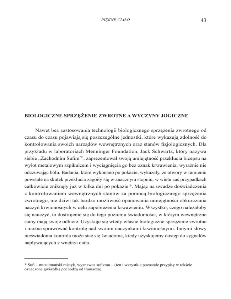 PIĘKNE CIAŁO 43 BIOLOGICZNE SPRZĘŻENIE ZWROTNE A WYCZYNY JOGICZNE Nawet bez zastosowania technologii biologicznego sprzężenia zwrotnego od czasu do czasu pojawiają się poszczególne jednostki, które wykazują zdolność do kontrolowania swoich narządów wewnętrznych oraz stanów fizjologicznych. Dla przykładu w laboratoriach Menninger Foundation, Jack Schwartz, który nazywa siebie „Zachodnim Sufim*”, zaprezentował swoją umiejętność przekłucia bicepsu na wylot metalowym szpikulcem i wyciągnięcia go bez oznak krwawienia, wyraźnie nie odczuwając bólu. Badania, które wykonano po pokazie, wykazały, że otwory w ramieniu powstałe na skutek przekłucia zagoiły się w znacznym stopniu, w wielu zaś przypadkach całkowicie zniknęły już w kilka dni po pokazie19. Mając na uwadze doświadczenia z kontrolowaniem wewnętrznych stanów za pomocą biologicznego sprzężenia zwrotnego, nie dziwi tak bardzo możliwość opanowania umiejętności obkurczania naczyń krwionośnych w celu zapobieżenia krwawieniu. Wszystko, czego należałoby się nauczyć, to dostrojenie się do tego poziomu świadomości, w którym wewnętrzne stany mają swoje odbicie. Uzyskuje się wtedy własne biologiczne sprzężenie zwrotne i można sprawować kontrolę nad swoimi naczynkami krwionośnymi. Innymi słowy nieświadoma kontrola może stać się świadoma, kiedy uzyskujemy dostęp do sygnałów napływających z wnętrza ciała. * Sufi – muzułmański mistyk, wyznawca sufizmu – (ten i wszystkie pozostałe przypisy w tekście oznaczone gwiazdką pochodzą od tłumacza). 44 JOGA I PSYCHOTERAPIA Patrząc z tej perspektywy, aura „magii” otaczająca doniesienia o niezwykłych dokonaniach joginów na polu kontroli ciała zanika, a tego typu wyczyny wydają się znacznie mniej „cudowne”. Prawdą jest, że dyscyplina jogi umożliwia nauczenie się ponownego zestrajania wewnętrznych zakłóceń, skupiania uwagi wewnątrz ciała oraz stanie się świadomym wewnętrznych stanów, a więc, z punktu widzenia tego, co teraz już wiemy, nie byłoby zaskoczeniem, gdyby okazało się, że jogini wykazują godne uwagi zdolności do kontrolowania oddechu, pracy serca czy metabolizmu. Z perspektywy doniesień na temat biologicznego sprzężenia zwrotnego wygląda na to, że wypada spojrzeć świeżym okiem na doniesienia o jogicznych „wyczynach”. „Zatrzymanie akcji serca” jest tym spośród jogicznych wyczynów z obszaru samokontroli, który przykuwa najwięcej uwagi. Był on badany na przestrzeni kilku dekad, począwszy od roku 1935, kiedy to francuska kardiolog Therese Brosse zabrała ze sobą do Indii elektrokardiograf i zapisała z jego pomocą wykresy EKG kilku joginów w trakcie podejmowania przez nich prób kontroli pracy serca. Jeden z opublikowanych przez nią raportów był wielce intrygujący i wzbudził znaczne zainteresowanie. Wykonała ona zapis, który wyraźnie wskazywał, iż poddany badaniu jogin całkowicie zatrzymał swoje serce. W latach 50. pojawił się raport ze szkoły medycznej w Indiach na temat obserwacji praktyk 34-letniego jogina, który nazywał siebie Yogi Ramananda. Badanie fluoroskopowe jego serca wykazało „zanik tętna” w momencie, w którym usiłował on je „zatrzymać”. Autorzy raportu przyznali jednak, że bardziej wnikliwe badanie ukazało „bardzo nieznaczne migotanie wzdłuż krawędzi lewego wierzchołka serca”. W roku 1961 trzej naukowcy z All India Institute of Medical Sciences w New Delhi badali czterech „joginów”, którzy twierdzili, iż potrafią zatrzymać lub spowolnić akcję swojego serca. Jeden z nich, 37-latek, który ćwiczył jogę od lat pięciu, przypadkowo odkrył metodę spowolnienia rytmu swojego serca. Poprzez przyjęcie specjalnej pozycji, którą sam opracował, był on w stanie na krótką chwilę spowolnić ilość uderzeń swojego serca do czterdziestu, pięćdziesięciu uderzeń na minutę. Momentami przerwy między poszczególnymi uderzeniami przeciągały się do trzech sekund. Inny z uczestników eksperymentu wykazał nieznaczne osłabienie pulsu i wyciszenie dźwięku serca słyszalnego w stetoskopie, lecz elektrokardiogram nie wykazał żadnych lub prawie żadnych zmian w rytmie serca. PIĘKNE CIAŁO 45 Trzecim z badanych był Śri T. Krishnamacharia*, ten sam dżentelmen, który „zatrzymał swoje serca” w 1935 w badaniu przeprowadzonym przez dr Brosse. W owych czasach „elektrokardiogramy” wykonywane były za pomocą jednej tylko „diody” lub elektrody podłączanej do ciała. Tym razem zastosowano nowoczesny sprzęt z wieloma diodami. Starszy już dżentelmen powtórzył swoją sztuczkę. Stało się jasne, że jego serce „przesunęło” się po prostu w jamie klatki piersiowej w wyniku skurczu mięśni i że zmiana pozycji spowodowała brak zapisu w elektrodzie numer 1, tej samej która została użyta w badaniu dr Brosse. Jednak pozostałe elektrody nadal zapisywały bicie serca bez zmian. Ostatecznie wywnioskowano, że gdyby dr Brosse dysponowała nowocześniejszym sprzętem, nie zamieściłaby w swoim raporcie doniesienia o zatrzymaniu akcji serca. Czwartym badanym w tym eksperymencie był Yogi Ramananda, którego serce wcześniej obserwowano z pomocą fluoroskopu. Tym razem wykonano elektrokardiogram, który wykazał nieznaczne jedynie i mało znaczące spowolnienie rytmu20. * Śri Trimulai Krishnamacharia (1888-1989) – jeden z pionierów i największych mistrzów współczesnej hatha jogi. Wielki propagator metod jogi na świecie i nauczyciel najwybitniejszych jej indyjskich przedstawicieli (m.in.: B.K.S. Iyengara oraz K.P. Joisa).
