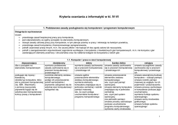 Kryteria oceniania z informatyki w kl. IV-VI 1. Podstawowe zasady posługiwania się komputerem i programem komputerowym Osiągnięcia wychowawcze Uczeń: • przestrzega zasad bezpiecznej pracy przy komputerze, • jest odpowiedzialny za ogólny porządek na stanowisku komputerowym, • stosuje zasady zdrowej pracy przy komputerze, w tym planuje przerwy w pracy i rekreację na świeżym powietrzu, • przestrzega zasad korzystania z licencjonowanego oprogramowania, • potrafi uszanować pracę innych, m.in. nie usuwa plików i nie kopiuje ich bez zgody autora lub nauczyciela, • potrafi z zaangażowaniem argumentować zagrożenia wynikające z korzystania z niewłaściwych gier komputerowych, m.in. nie korzysta z gier zawierających elementy przemocy i okrucieństwa oraz nie nakłania kolegów do korzystania z takich gier. 1.1. Komputer i praca w sieci komputerowej dostateczny dobry bardzo dobry wymienia podstawowe wymienia zasady zachowania omawia zasady zachowania zasady zachowania się w się w pracowni komputerowej się w pracowni komputerowej pracowni komputerowej i i przestrzega ich i przestrzega ich przestrzega ich posługuje się myszą i rozróżnia elementy zestawu omawia ogólne omawia przeznaczenie klawiaturą; komputerowego; przeznaczenie elementów elementów zestawu określa typ komputera, który podaje ich przeznaczenie; zestawu komputerowego; komputerowego; stoi w pracowni komputerowej potrafi samodzielnie i wymienia elementy wie, czym jest pamięć (np. IBM , Macintosh); poprawnie zalogować się do komputera znajdujące się w operacyjna; z pomocą nauczyciela szkolnej sieci komputerowej i jednostce centralnej i nośniki omawia elementy komputera poprawnie loguje się do wylogować się pamięci masowej; znajdujące się w jednostce szkolnej sieci komputerowej i wie, na czym polega centralnej; kończy pracę z komputerem uruchomienie komputera i wie, czym jest system programu komputerowego operacyjny; zna jednostki pamięci; omawia procesy zachodzące podczas uruchamiania programu komputerowego; wymienia cechy środowiska dopuszczający dba o porządek na stanowisku komputerowym celujący omawia szczegółowo zasady zachowania się w pracowni komputerowej i przestrzega ich omawia wewnętrzną budowę komputera – rodzaje pamięci; omawia nośniki pamięci masowej ze względu na ich pojemność i przeznaczenie; omawia procesy zachodzące w komputerze podczas jego uruchamiania; wymienia funkcje systemu operacyjnego; omawia cechy środowiska graficznego; omawia funkcje systemu operacyjnego 1 graficznego; wie, czym jest system operacyjny uruchamia programy z ikony na pulpicie; potrafi poprawnie zakończyć pracę programu; rozróżnia elementy okna programu; pod kierunkiem nauczyciela wykonuje operacje w oknie programu; jest świadom istnienia wirusów komputerowych wymienia przynajmniej trzy zastosowania komputera podaje przykład urządzenia ze swojego otoczenia, opartego na technice komputerowej uruchamia programy z wykazu programów w menu Start; nazywa elementy okna programu; wykonuje niektóre operacje na oknie programu; według wskazówek nauczyciela wykonuje operacje w oknie programu; potrafi omówić ogólne niebezpieczeństwa związane z zarażeniem wirusem komputerowym 1.2. Program komputerowy omawia przeznaczenie elementów okna programu Paint; wykonuje operacje na oknie programu; pod kierunkiem nauczyciela pracuje z dwoma jednocześnie uruchomionymi oknami programów; samodzielnie wykonuje operacje w oknie programu; wymienia sposoby ochrony przed wirusami komputerowymi; stosuje niektóre z nich wie, że nie wolno bezprawnie kopiować programów i kupować ich nielegalnych kopii; wybraną metodą samodzielnie kopiuje pliki na zewnętrzny nośnik danych; samodzielnie pracuje z dwoma jednocześnie uruchomionymi oknami programów; sprawnie korzysta z menu kontekstowego; zna podstawowe skróty klawiaturowe; wie, czym są wirusy komputerowe; potrafi ogólnie omówić ich działanie 1.3. Zastosowania komputera i programów komputerowych podaje przykłady wskazuje zastosowania wskazuje użyteczność zastosowania komputera w komputera w różnych zastosowania komputera do szkole i w domu dziedzinach życia usprawnienia uczenia się; korzysta z programów edukacyjnych podaje przykłady urządzeń ze omawia działanie podaje przykłady swojego otoczenia, opartych przykładowych urządzeń ze zastosowania komputera w na technice komputerowej swojego otoczenia, opartych domu; na technice komputerowej wymienia zagrożenia wynikające z korzystania z niewłaściwych gier komputerowych 1.4. Dokument komputerowy instaluje programy i zna zasady odinstalowywania ich; zna podstawowe rodzaje licencji komputerowych i zasady korzystania z nich; wskazaną metodą samodzielnie kopiuje pliki na zewnętrzne nośniki danych; stosuje skróty klawiaturowe; omawia przeznaczenie elementów okien programów takich, jak: Word, Excel, wybrana przeglądarka internetowa; stosuje sposoby ochrony przed wirusami komputerowymi, np. używa programu antywirusowego dla dysku twardego i dyskietki korzystając z dodatkowych źródeł, odszukuje informacje na temat zastosowań komputera omawia historię komputerów i ich zastosowań; omawia zagrożenia wynikające z korzystania z niewłaściwych gier komputerowych 2 pod kierunkiem nauczyciela zapisuje dokument w pliku, w folderze domyślnym z pomocą nauczyciela odszukuje zapisane pliki i otwiera je do obsługi programów posługuje się głównie myszą (klika wymienione przez nauczyciela elementy: przyciski, ikony, opcje menu) pod kontrolą nauczyciela zapisuje dokument w pliku we wskazanej lokalizacji; pod kierunkiem nauczyciela potrafi wydrukować dokument komputerowy samodzielnie zapisuje dokument w pliku w wybranej lokalizacji; pod kierunkiem nauczyciela zakłada nowy folder; potrafi przygotować dokument komputerowy do druku 1.5. Pliki i foldery wie, do czego służy folder potrafi usuwać wskazane Kosz i potrafi usuwać pliki; pliki; potrafi o