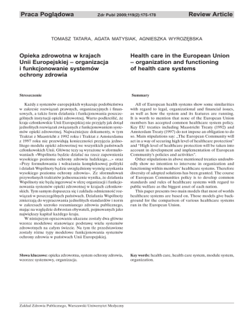Praca Poglądowa Zdr Publ 2009;119(2):175-178 Review Article TOMASZ TATARA, AGATA MATYSIAK, AGNIESZKA WYROZĉBSKA Opieka zdrowotna w krajach Unii Europejskiej – organizacja i funkcjonowanie systemów ochrony zdrowia Health care in the European Union – organization and functioning of health care systems Streszczenie Summary Każdy z systemów europejskich wykazuje podobieństwa w zakresie rozwiązań prawnych, organizacyjnych i finansowych, a także form działania i funkcjonowania poszczególnych instytucji opieki zdrowotnej. Warto podkreślić, że kraje członkowskie Unii Europejskiej nie przyjęły jak dotąd jednolitych rozwiązań związanych z funkcjonowaniem systemów opieki zdrowotnej. Najważniejsze dokumenty, w tym Traktat z Maastricht z 1992 roku i Traktat z Amsterdamu z 1997 roku nie przewidują konieczności przyjęcia jednolitego modelu opieki zdrowotnej we wszystkich państwach członkowskich Unii. Główne tezy są wyrażone w sformułowaniach «Wspólnota będzie działać na rzecz zapewnienia wysokiego poziomu ochrony zdrowia ludzkiego....» oraz «Przy formułowaniu i wdrażaniu kompleksowej polityki i działań Wspólnoty będzie uwzględniony wymóg uzyskania wysokiego poziomu ochrony zdrowia». Ze sformułowań przywołanych traktatów jednoznacznie wynika, że działania Wspólnoty nie będą ingerować w sferę organizacji i funkcjonowania systemów opieki zdrowotnej w krajach członkowskich. Tym samym dopuszcza się i zakłada odmienność rozwiązań w poszczególnych państwach. Działania Wspólnoty zmierzają do wypracowania jednolitych standardów i norm w zakresach szeroko rozumianego zdrowia publicznego, mając na względzie dobrostan obywateli, pojmowanych jako największy kapitał każdego kraju. W niniejszym opracowaniu ukazane zostały dwa główne wzorce modelowe stanowiące podstawę wielu systemów zdrowotnych na całym świecie. Na tym tle przedstawione zostały różne typy modelowe funkcjonowania systemów ochrony zdrowia w państwach Unii Europejskiej. All of European health systems show some similarities with regard to legal, organizational and financial issues, as well as how the system and its features are running. It is worth to mention that none of the European Union members has accepted common healthcare system policy. Key EU treaties including Maastricht Treaty (1992) and Amsterdam Treaty (1997) do not impose an obligation to do so. Main stipulations say: „The European Community will act in a way of securing high level of healthcare protection” and “High level of healthcare protection will be taken into account in development and implementation of European Community’s policies and activities”. Other stipulations in above mentioned treaties undoubtedly show no intention to intervene in organization and functioning within members’ healthcare systems. Therefore diversity of adopted solutions has been granted. The course of European Communities policy is to develop common standards and rules of healthcare systems with regard to public welfare as the biggest asset of each nation. This paper presents two main models that most of worlds healthcare systems are based on. Those models give background for the comparison of various healthcare systems run in the European Union. Słowa kluczowe: opieka zdrowotna, system ochrony zdrowia, wzorzec systemowy, organizacja. Key words: health care, health care system, module system, organization. Zakład Zdrowia Publicznego, Warszawski Uniwersytet Medyczny 176 Tradycyjne modele systemów zdrowotnych traktowane są jako wzorce opisujące pożądany, idealny kształt systemu. Stanowią zbiór potencjalnie możliwych rozwiązań, spośród których można wybierać te, które uznawane są w danych warunkach za najlepsze. Poszczególne kraje dostosowują dany model do własnych uwarunkowań w sposób indywidualny, tzn. decydują się na zastosowanie tylko pewnych elementów z wzorcowych systemów, adekwatnych do sytuacji kraju. Najczęściej stosowanymi, europejskimi modelami systemów zdrowotnych są: • model Bismarckowski (ubezpieczeniowy model finansowania ochrony zdrowia), • model Beveridge’a (zaopatrzeniowy model finansowania ochrony zdrowia), Modele te mają charakter uniwersalny ze względu na możliwość stosowania ich w analizie polityk i systemów zdrowotnych różnych krajów. Jednocześnie wskazują na pewną specyfi kę rozwoju systemów, które przebiegały odmiennie w Wielkiej Brytanii, w Niemczech i w poszczególnych krajach Europy Środkowo-Wschodniej. Inne kraje, zbliżając się mniej lub bardziej do któregoś z tych modeli, przechodziły z kolei własną drogę, w której tradycja i historia odgrywały bardzo istotną rolę [1]. MODEL BISMARCKOWSKI Powstał on z inicjatywy Ottona von Bismarck’a – premiera Prus, kanclerza Rzeszy Niemieckiej, w 1883 roku. W modelu tym proces podejmowania decyzji jest zdecentralizowany. Większość podstawowych rozstrzygnięć jest podejmowana przez instytucje ubezpieczeniowe bez interwencji przedstawicieli państwa, ale przy udziale reprezentantów organizacji lekarzy, aptekarzy, szpitali i lokalnych władz. Jednocześnie struktura samych instytucji ubezpieczeniowych zapewnia uczestnictwo w podejmowaniu decyzji przedstawicieli bezpośrednio zainteresowanych stron, a więc pracodawców i pracowników. Organy państwowe sprawują jedynie ogólny nadzór. Jednocześnie jednak państwo tworzy precyzyjne prawne ramy funkcjonowania całego systemu. Przymus ubezpieczenia obejmuje przede wszystkim pracobiorców i tych, których dochód nie pozwala na spokojne myślenie o przyszłości w razie utraty zdolności do pracy. Dla nich głównie przeznaczony jest system ubezpieczeń społecznych. Osoby osiągające dochód na dostatecznie wysokim poziomie są zwolnione z obowiązku ubezpieczenia, choć mogą do niego przystępować dobrowolnie, albo mogą zawierać ubezpieczenia prywatne, które są naturalnym elementem całego modelu. Cechą chara