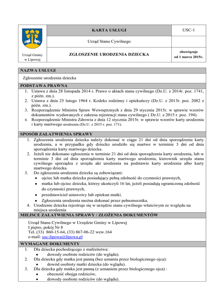KARTA USŁUGI USC-1 Urząd Stanu Cywilnego Urząd Gminy w Lipowej ZGŁOSZENIE URODZENIA DZIECKA obowiązuje od 1 marca 2015r. NAZWA USŁUGI Zgłoszenie urodzenia dziecka PODSTAWA PRAWNA 1. Ustawa z dnia 28 listopada 2014 r. Prawo o aktach stanu cywilnego (Dz.U. z 2014r. poz. 1741, z późn. zm.). 2. Ustawa z dnia 25 lutego 1964 r. Kodeks rodzinny i opiekuńczy (Dz.U. z 2015r. poz. 2082 z późn. zm.). 3. Rozporządzenie Ministra Spraw Wewnętrznych z dnia 29 stycznia 2015r. w sprawie wzorów dokumentów wydawanych z zakresu rejestracji stanu cywilnego ( Dz.U. z 2015 r. poz. 194). 4. Rozporządzenie Ministra Zdrowia z dnia 12 stycznia 2015r. w sprawie wzorów karty urodzenia i karty martwego urodzenia (Dz.U. z 2015 r. poz. 171). SPOSÓB ZAŁATWIENIA SPRAWY 1. Zgłoszenia urodzenia dziecka należy dokonać w ciągu 21 dni od dnia sporządzenia karty urodzenia, a w przypadku gdy dziecko urodziło się martwe w terminie 3 dni od dnia sporządzenia karty martwego dziecka. 2. Jeżeli nie dokonano zgłoszenia w terminie 21 dni od dnia sporządzenia karty urodzenia, lub w terminie 3 dni od dnia sporządzenia karty martwego urodzenia, kierownik urzędu stanu cywilnego sporządza z urzędu akt urodzenia na podstawie karty urodzenia albo karty martwego dziecka. 3. Do zgłoszenia urodzenia dziecka są zobowiązani: ojciec lub matka dziecka posiadający pełną zdolność do czynności prawnych, matka lub ojciec dziecka, którzy ukończyli 16 lat, jeżeli posiadają ograniczoną zdolność do czynności prawnych, przedstawiciel ustawowy lub opiekun matki. Zgłoszenia urodzenia można dokonać przez pełnomocnika. 4. Urodzenie dziecka rejestruje się w urzędzie stanu cywilnego właściwym ze względu na miejsca urodzenia MIEJSCE ZAŁATWIENIA SPRAWY / ZŁOŻENIA DOKUMENTÓW Urząd Stanu Cywilnego w Urzędzie Gminy w Lipowej I piętro, pokój Nr 8 Tel. (33) 860-15-64, (33) 867-06-22 wew.164 e-mail: [email protected] WYMAGANE DOKUMENTY 1. Dla dziecka pochodzącego z małżeństwa: dowody osobiste rodziców (do wglądu). 2. Dla dziecka gdy matka jest panną (bez uznania przez biologicznego ojca): dowód osobisty matki dziecka (do wglądu). 3. Dla dziecka gdy matka jest panną (z uznaniem przez biologicznego ojca) : obecność obojga rodziców, dowody osobiste rodziców (do wglądu). 4. 5. Dla dziecka gdy matka jest osobą rozwiedzioną lub pozostającą w separacji : dowód osobisty matki dziecka (do wglądu). Dla dziecka gdy matka jest wdową : dowód osobisty matki dziecka (do wglądu). Pełnomocnictwo - w przypadku ustanowienia pełnomocnika (oryginał lub urzędowo poświadczony odpis) Ponadto: wskazanie Urzędu Stanu Cywilnego, w którym sporządzono akt małżeństwa, jeśli dziecko pochodzi z małżeństwa, wskazanie Urzędu Stanu Cywilnego, w którym sporządzono akt urodzenia matki, jeśli matka dziecka jest panną, w sytuacji, gdy podczas sporządzenia aktu urodzenia rodzice składają oświadczenie o uznaniu ojcostwa, także wskazanie Urzędu Stanu Cywilnego, w którym sporządzono akt urodzenia ojca, jeśli dziecko nie pochodzi z małżeństwa, a matka dziecka pozostawała poprzednio w związku małżeńskim – wskazanie Urzędu Stanu Cywilnego, w którym sporządzono akt małżeństwa, a w przypadku ustania małżeństwa na skutek zgonu męża, wskazanie Urzędu Stanu Cywilnego, w którym sporządzono akt zgonu. WNIOSKI DO POBRANIA OPŁATY Czynność zwolniona z opłaty skarbowej PRZEWIDYWANY TERMIN ZAŁATWIENIA SPRAWY Od ręki, bezpośrednio przy zgłoszeniu. ( W przypadku konieczności złożenia zlecenia do innego urzędu stanu cywilnego o wprowadzenie do rejestru stanu cywilnego aktów stanu cywilnego, konieczna będzie kolejna wizyta w USC) OSOBY DO KONTAKTU Iwona Talik ( Kierownik USC), tel. (33) 860-15-64, e-mail: [email protected] TRYB ODWOŁAWCZY Od decyzji, odmawiającej dokonania czynności, wydanej przez Kierownika USC, przysługuje odwołanie do Wojewody Śląskiego za pośrednictwem Kierownika USC, w terminie 14 dni od dnia jej doręczenia. UWAGI Podstawę sporządzenia aktu urodzenia stanowi pisemne zgłoszenie urodzenia dziecka, wystawione przez lekarza, położną lub zakład opieki zdrowotnej, potwierdzające fakt urodzenia dziecka oraz datę i miejsce urodzenia. Dziecku można nadać tylko dwa imiona, imię nie może być ośmieszające, zdrobniałe i nie odróżniające płci. Jeżeli rodzice nie dokonają wyboru imienia, wówczas Kierownik USC nada dziecku imię z urzędu. Po sporządzeniu aktu, osobie zgłaszającej urodzenie wydaje się bezpłatnie jeden egzemplarz odpisu skróconego tego aktu. Każdy następny odpis aktu urodzenia podlega opłacie skarbowej.