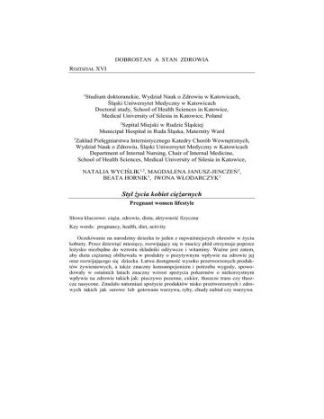 DOBROSTAN A STAN ZDROWIA ROZDZIAŁ XVI Studium doktoranckie, Wydział Nauk o Zdrowiu w Katowicach, Śląski Uniwersytet Medyczny w Katowicach Doctoral study, School of Health Sciences in Katowice, Medical University of Silesia in Katowice, Poland 1 Szpital Miejski w Rudzie Śląskiej Municipal Hospital in Ruda Śląska, Maternity Ward 2 3 Zakład Pielęgniarstwa Internistycznego Katedry Chorób Wewnętrznych, Wydział Nauk o Zdrowiu, Śląski Uniwersytet Medyczny w Katowicach Department of Internal Nursing, Chair of Internal Medicine, School of Health Sciences, Medical University of Silesia in Katowice, NATALIA WYCIŚLIK1,2, MAGDALENA JANUSZ-JENCZEŃ3, BEATA HORNIK3, IWONA WŁODARCZYK3 Styl życia kobiet ciężarnych Pregnant women lifestyle Słowa kluczowe: ciąża, zdrowie, dieta, aktywność fizyczna Key words: pregnancy, health, diet, activity Oczekiwanie na narodziny dziecka to jeden z najważniejszych okresów w życiu kobiety. Przez dziewięć miesięcy, rozwijający się w macicy płód otrzymuje poprzez łożysko niezbędne do wzrostu składniki odżywcze i witaminy. Ważne jest zatem, aby dieta ciężarnej obfitowała w produkty o pozytywnym wpływie na zdrowie jej oraz rozwijającego się dziecka. Łatwa dostępność wysoko przetworzonych produktów żywieniowych, a także znaczny konsumpcjonizm i potrzeba wygody, spowodowały w ostatnich latach znaczny wzrost spożycia pokarmów o niekorzystnym wpływie na zdrowie takich jak: pieczywo pszenne, cukier, tłuszcze trans czy tłuszcze nasycone. Zmalało natomiast spożycie produktów nisko przetworzonych i zdrowych takich jak surowe lub gotowane warzywa, ryby, chudy nabiał czy warzywa DOBROSTAN A STAN ZDROWIA strączkowe. Statystyki są nieubłagane – społeczeństwa ucywilizowane są coraz poważniej zagrożone wystąpieniem cukrzycy typu 2 uwarunkowanej nie tylko genetycznie, ale w głównej mierze czynnikami środowiskowymi. Niewłaściwy styl życia prowadzi nieuchronnie do otyłości, pogorszenia sprawności funkcjonowania organizmu a także obniżenia płodności i poważnych chorób cywilizacyjnych. Udowodniono także, że dzieci matek odżywiających się w niewłaściwy sposób oraz unikających aktywności fizycznej rodzą się z większą liczbą adipocytów podskórnych, co obarcza je ryzykiem otyłości w przyszłości. Ważne jest zatem propagowanie zdrowego stylu życia, właściwej diety oraz regularnej aktywności fizycznej. Wśród kobiet ciężarnych pokutuje mit, jakoby ich odmienny stan dewaluował znaczenie diety i aktywności fizycznej. To mylne przeświadczenie sprawia, iż wiele przyszłych mam, w obawie o zdrowie i życie dziecka rezygnuje z regularnych ćwiczeń a także ulega ciążowym zachciankom, czy napadom łakomstwa. Generowane hormonalnie zmiany łaknienia nie stanowią jednak usprawiedliwienia, ponieważ rozwijający się płód wymaga jak najlepszych składników odżywczych umożliwiających jego wzrost i organogenezę. Regularna aktywność fizyczna przyszłej mamy ułatwia zachowanie korzystnej sylwetki, usprawnia działanie mięśni brzucha, oraz dotlenia organizm wpływając tym samym korzystnie na dobrostan płodu [6]. Prawidłowa dieta, w połączeniu z umiarkowanym planem treningowym to niezbędne elementy zdrowego stylu życia każdej kobiety. W ciągu ostatnich kilku lat odnotowano wzrastający poziom świadomości społeczeństwa dotyczący zdrowych nawyków żywieniowych i znaczenia wysiłku fizycznego na samopoczucie człowieka. Świadomość ta sprawia, iż coraz więcej kobiet decyduje się na opiekę dietetyka czy udział w zorganizowanych zajęciach zarówno przed oraz w trakcie trwania ciąży. Zgodnie z zaleceniami Instytutu Żywności i Żywienia (IŻŻ) na 2016 rok, zaleca się, aby: spożywać posiłki regularnie, co 3-4 godziny owoce i warzywa stanowiły 50% spożywanych pokarmów, z czego ¾ racji żywieniowej powinny stanowić warzywa, ¼ owoce spożywać węglowodany złożone wypijać 2 duże szklanki mleka, jogurt lub kefiru dziennie ograniczyć mięsa czerwone do 0,5 kg tygodniowo w diecie przeważały tłuszcze roślinne nad zwierzęcymi unikać słodyczy, ciastek i cukru nie dosalać potraw na rzecz użycia ziół wypijać minimum 1,5 litra wody dziennie ograniczyć do minimum spożywanie alkoholu. Aby zachować organizm w dobrej kondycji oraz poprawić samopoczucie u podstawy piramidy żywienia zamieszczona jest aktywność fizyczna o umiarkowanej 196 Natalia Wyciślik, Magdalena Janusz-Jenczeń, Beata Hornik, Iwona Włodarczyk Styl życia kobiet ciężarnych intensywności (około 60-70% tętna maksymalnego) której czas trwania powinien wynosić 30 minut. Celem badań była ocena zachowań związanych ze stylem życia kobiet w okresie ciąży. MATERIAŁ I METODA Badaniem o charakterze ankietowym objęto grupę 100 kobiet hospitalizowanych w Oddziale Położniczym Szpitala Miejskiego w Rudzie Śląskiej, w pierwszych dniach połogu. Narzędziem badawczym był autorski kwestionariusz anonimowej ankiety składający się z trzech części: 1. Część pierwsza zawierała dwanaście pytań, które pozwoliły określić preferencje żywieniowe kobiet w okresie ciąży, ich podatność na tzw. ciążowe zachcianki oraz stopień świadomości żywieniowej w kwestiach takich jak: zachowanie właściwych odstępów czasowych między posiłkami, liczba spożywanych posiłków w ciągu dnia, spożywanie dodatkowych przekąsek, stosowanie używek. Elementem tej części badania był szczegółowy wywiad w zakresie preferencji pokarmowych. Respondentki, na podstawie własnych doświadczeń z okresu ciąży, określały ilość spożywanych produktów każdej kategorii. Wyróżniono grupy artykułów spożywczych takie jak: węglowodany (zarówno proste jak i złożone), warzywa gotowane i surowe, warzywa strączkowe, owoce, nabiał, mięso (zarówno tłuste jak i chude), ryby, słodycze, wyroby cukiernicze, tłuszcze (roślinne i zwierzęce), gotowe dania instant. Rozp