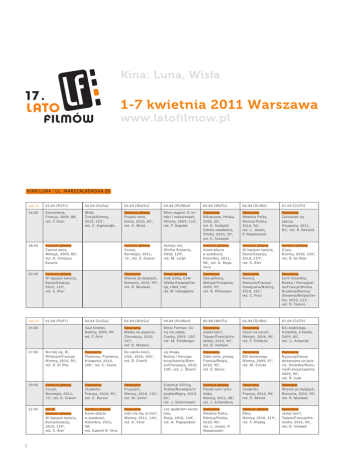 KINO LUNA / UL. MARSZAŁKOWSKA 28 sala A 01.04 [Pt/Fr] 02.04 [So/Sa] 03.04 [Nie/Su] 04.04 [Pn/Mon] 05.04 [Wt/Tu] 06.04 [Śr/We] 07.04 [Cz/Th] 16:00 Schronienie, Francja, 2009, 88’, reż. F. Ozon Miód, Turcja/Niemcy, 2010, 103’, reż. S. Kaplanoğlu Konkurs główny Przytul mnie, Dania, 2010, 80’, reż. K. Munk Mine vaganti. O miłości i makaronach, Włochy, 2009, 110’, reż. F. Ozpetek Panorama Wkręcacze, Polska, 2006, 50’, reż. K. Szołajski Szkoła uwodzenia, Polska, 2010, 50’, reż. K. Szołajski Panorama Weselna Polka, Niemcy/Polska, 2010, 90’, reż. L. Jessen, P. Nowakowski Panorama Cokolwiek się zdarzy, Hiszpania, 2011, 81’, reż. R. Bellsolà 18:00 Konkurs główny Czarna owca, Meksyk, 2009, 85’, reż. H. Hinojosa Ozcariz Konkurs główny Szczyt, Norwegia, 2011, 73’, reż. O. Giæver Kolejny rok, Wielka Brytania, 2010, 129’, reż. M. Leigh Konkurs główny Karen płacze w autobusie, Kolumbia, 2011, 98’, reż. G. Rojas Vera Konkurs główny W lepszym świecie, Dania/Szwecja, 2010, 119’, reż. S. Bier Konkurs główny Cisza, Niemcy, 2010, 120’, reż. B. bo Odar 20:30 Konkurs główny W lepszym świecie, Dania/Szwecja, 2010, 119’, reż. S. Bier Panorama Wtorek po świętach, Rumunia, 2010, 99’, reż. R. Muntean Pokaz specjalny Grek Zorba, USA/ Wielka Brytania/Grecja, 1964, 142’, reż. M. Kakogiannis Panorama Zew północy, Meksyk/Hiszpania, 2009, 95’, reż. R. Pérezcano Panorama Aurora, Rumunia/Francja/ Szwajcaria/Niemcy, 2010, 181’, reż. C. Puiu Panorama Cyrk Columbia, Bośnia i Hercegowina/Francja/Wielka Brytania/Niemcy/ Słowenia/Belgia/Serbia, 2010, 113’, reż. D. Tanovic sala B 01.04 [Pt/Fr] 15:00 1 02.04 [So/Sa] 03.04 [Nie/Su] 04.04 [Pn/Mon] 05.04 [Wt/Tu] 06.04 [Śr/We] 07.04 [Cz/Th] Soul Kitchen, Niemcy, 2009, 99’, reż. F. Akin Panorama Matka na gigancie, Chorwacja, 2010, 107’, reż. D. Matanic Milos Forman: Co cię nie zabije, Czechy, 2009, 100’, reż. M. Šmídmajer Panorama Jesteś tam?, Tajwan/Francja/Holandia, 2010, 90’, reż. D. Verbeek Panorama Sezon na kaczki, Meksyk, 2004, 90’, reż. F. Eimbcke Nic osobistego, Holandia, Irlandia, 2009, 85’, reż. U. Antoniak 17:00 Nie bój się, Bi, Wietnam/Francja/ Niemcy, 2010, 90’, reż. D. Di Pha Panorama Flamenco, Flamenco, Hiszpania, 2010, 100’, reż. C. Saura Do szpiku kości, USA, 2010, 100’, reż. D. Granik Jej droga, Bośnia i Hercegowina/Austria/Niemcy/Chorwacja, 2010, 100’, reż. J. Žbanić Panorama Zabij mnie, proszę, Francja/Belgia, 2010, 95’, reż. O. Barco Panorama Ból fantomowy, Niemcy, 2009, 97’, reż. M. Emcke Panorama Najszczęśliwsza dziewczyna na świecie, Holandia/Rumunia/Francja/Japonia, 2009, 90’, reż. R. Jude 19:00 Konkurs główny Szczyt, Norwegia, 2011, 73’, reż. O. Giæver Panorama Studentki, Francja, 2010, 95’, reż. E. Bercot Panorama Przyjaźń!, Niemcy, 2010, 110’, reż. M. Goller Essential Killing, Polska/Norwegia/Irlandia/Węgry, 2010, 83’, reż. J. Skolimowski Konkurs główny Ponad nami tylko niebo, Niemcy, 2011, 88’, reż. J. Schomburg Panorama Studentki, Francja, 2010, 95’, reż. E. Bercot Panorama Wtorek po świętach, Rumunia, 2010, 99’, reż. R. Muntean 21:00 20:30 Konkurs główny W lepszym świecie, Dania/Szwecja, 2010, 119’, reż. S. Bier Konkurs główny Karen płacze w autobusie, Kolumbia, 2011, 98’, reż. Gabriel R. Vera Panorama Jeśli nie my, to kto?, Niemcy, 2011, 124’, reż. A. Veiel Jak spędziłem koniec lata, Rosja, 2010, 124’, reż. A. Popogrebski Panorama Weselna Polka, Niemcy/Polska, 2010, 90’, reż. L. Jessen, P. Nowakowski Konkurs główny Obca, Niemcy, 2010, 119’, reż. F. Aladag Panorama Jesteś tam?, Tajwan/Francja/Holandia, 2010, 90’, reż. D. Verbeek KINO WISŁA / PL. WILSONA 2 sala A 01.04 [Pt/Fr] 02.04 [So/Sa] 03.04 [Nie/Su] 04.04 [Pn/Mon] 05.04 [Wt/Tu] 06.04 [Śr/We] 07.04 [Cz/Th] 12:00 Ludzie Boga Francja, 2010, 122’, reż. Xavier Beauvois Panorama Jestem z tobą, Włochy, 2010, 103’, reż. Guido Chiesa 14:00 14:15 Panorama Peepli, Indie, 2010, 95’, reż. A. Rizyi, M. Farooqui Panorama Drugie dzieciństwo, Włochy, 2010, 98’, reż. P. Avati Panorama Moskwa, Belgia, Belgia, 2008, 102’, reż. Ch. Van Rompaey Dwa Rembrandty w ogrodzie, Niemcy/ Polska, 2009, 79’, reż. J. Śladkowski Rodzina, Dania, 2010, 102’, reż. P. Fischer Christensen Wszyscy inni, Niemcy, 2009, 119’, reż. M. Ade 16:00 Pewien dżentelmen, Norwegia, 2010, 105’, reż. H. Petter Moland Panorama Cyrk Columbia Bośnia i Hercegowina/ Francja/Wielka Brytania/ Niemcy/Słowenia/Belgia/ Serbia, 2010, 113’, reż. D. Tanovic Panorama Ból fantomowy, Niemcy, 2009, 97’, reż. M. Emcke Panorama Jestem z tobą, Włochy, 2010, 103’, reż. G. Chiesa Panorama Mamas & Papas, Czechy, 2010, 110’, reż. A. Nellis Panorama Cokolwiek się zdarzy, Hiszpania, 2011, 81’, reż. R. Bellsolà Panorama Mali bohaterowie, Szwajcaria, 2010, 92’, reż. M. Schärer 18:00 Panorama Flamenco, Flamenco, Hiszpania, 2010, 100’, reż. C. Saura Konkurs główny Przytul mnie, Dania, 2010, 80’, reż. K. Munk Konkurs główny Amador, Hiszpania, 2010, 112’, reż. F. L. de Aranoa Konkurs główny Cisza, Niemcy, 2010, 120’, reż. B. bo Odar Konkurs główny Obca, Niemcy, 2010, 119’, reż. F. Aladag Konkurs główny Ponad nami tylko niebo, Niemcy, 2011, 88’, reż. J. Schomburg Panorama Zew północy, Meksyk/Hiszpania, 2009, 95’, reż. R. Pérezcano 20:30 Panorama Fryzjerka, Niemcy, 2010, 106’, reż. D. Dörrie Konkurs główny W lepszym świecie, Dania/Szwecja, 2010, 119’, reż. S. Bier Panorama Angele i Tony, Francja, 2010, 87’, reż. A.Delaporte Konkurs główny Czarna owca, Meksyk, 2009, 85’, reż. H. Hinojosa Ozcariz Panorama Erratum, Polska, 2010, 95’, reż. M. Lechki Konkurs główny Amador, Hiszpania, 2010, 112’, reż. F. León de Aranoa Panorama Przyjaźń!, Niemcy, 2010, 110’, reż. M. Goller sala B 01.04 [Pt/Fr] 02.04 [So/Sa] 03.04 [Nie/Su] 04.04 [Pn/Mon] 05.04 [Wt/Tu] 06.04 [