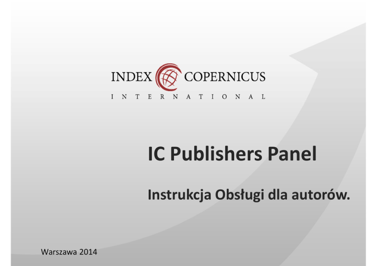 IC Publishers Panel Instrukcja Obsługi dla autorów. Warszawa 2014 O INDEX COPERNICUS Index Copernicus International to międzynarodowa platforma promująca osiągnięcia nauki, a także wspierająca krajową i międzynarodową współpracę pomiędzy naukowcami, wydawnictwami czasopism naukowych oraz jednostkami naukowymi. Szczególnym wyrazem uznania dla naszego doświadczenia jest realizacja w partnerstwie z Ministerstwem Nauki i Szkolnictwa Wyższego Systemu Informacji o Szkolnictwie Wyższym POL-on, w którym eksperci Index Copernicus odpowiedzialni są m.in. za przygotowanie i wspieranie procesu parametryzacji czasopism naukowych oraz dorobku jednostek naukowych. © Copyright by Index Copernicus, wszelkie prawa zastrzeżone. O IC PUBLISHERS PANEL IC Publishers Panel to system do kompleksowego zarządzania procesem edytorskim w czasopismach naukowych. Umożliwia: • Wydawanie wersji on-line czasopisma, znacznie poprawiając jego dostępność, nadając międzynarodowy prestiż oraz umożliwiając zachowanie ciągłości wydawniczej przy zdecydowanie niższych nakładach finansowych. • Zarządzanie wersjami językowymi czasopisma i manuskryptów – między innymi umożliwia wydawanie czasopisma w jednym lub wielu językach kongresowych. • Prowadzenia procesu recenzenckiego, w tym nawiązywanie współpracy z polskimi i zagranicznymi recenzentami. • Analizę statystyk odwiedzin strony internetowej i ilości pobrań zarówno abstraktów jaki i pełnych treści artykułów naukowych, co umożliwia opracowanie strategii rozwoju dla czasopisma. • Prowadzenie procesu wydawniczego, w tym pozyskiwanie manuskryptów. © Copyright by Index Copernicus, wszelkie prawa zastrzeżone. O IC PUBLISHERS PANEL Korzystanie z elektronicznego obiegu dokumentów za pośrednictwem IC Publishers Panel pozwala na: 1. Wprowadzenie wszystkich elementów artykułu: • Słów kluczowych oraz autorów. • Tytułów oraz streszczeń. • Przesłanie do Redakcji artykułu oraz dodatkowych plików. 2. Bieżące sprawdzanie aktualnego statusu artykułu (dodano, przesłano do recenzji, zrecenzowano, zaakceptowano lub odrzucono). 3. Otrzymywanie powiadomień potwierdzających zgłoszenie artykułu oraz informacji o etapach pracy nad artykułem, co wyklucza zbędne nieporozumienia. 4. Sprawną korespondencję i wymianę informacji z Redakcją. © Copyright by Index Copernicus, wszelkie prawa zastrzeżone. STRONY INTERNETOWE Strony internetowe czasopism naukowych, które powstały za pośrednictwem IC Publishers Panel przygotowywane są zgodnie z międzynarodowymi standardami. Układ treści umożliwia odbiorcom szybkie i proste odszukanie niezbędnych informacji. Prosty i przejrzysty układ strony zapewnia jej funkcjonalność i łatwość w nawigacji. © Copyright by Index Copernicus, wszelkie prawa zastrzeżone. REJESTRACJA I LOGOWANIE Autor może zgłaszać swoje artykuły naukowe do czasopism korzystających z rozwiązania IC Publishers Panel za pośrednictwem strony internetowej wybranego periodyku. Do tego celu niezbędna jest rejestracja. Krok 1. „Załóż nowe konto” - tworzenie nowego konta (patrz czerwona strzałka)/Logowanie – wprowadzenie w puste pola nazwy użytkownika (Username) i hasła (Password). Aby zalogować się lub zarejestrować wejdź w zakładkę „Dla autorów”. © Copyright by Index Copernicus, wszelkie prawa zastrzeżone. REJESTRACJA Krok 2. Aby się zarejestrować należy uzupełnić puste pola. Po wybraniu „Dalej” przechodzimy do kolejnego etapu, jakim jest sprawdzenie i potwierdzenie wprowadzonych danych. © Copyright by Index Copernicus, wszelkie prawa zastrzeżone. REJESTRACJA Krok 3. Po wprowadzeniu danych możemy sprawdzić ich poprawność. W przypadku błędu możemy je modyfikować, powracając do poprzedniego etapu wybierając „Wstecz” lub zakończyć proces wybierając „Koniec”. Krok 4. Po zakończeniu procesu rejestracji wybieramy „Zaloguj”, wprowadzając nazwę użytkownika, hasło i logujemy się do systemu. © Copyright by Index Copernicus, wszelkie prawa zastrzeżone. LOGOWANIE Krok 5. Po zalogowaniu się w pionowym menu (po lewej stronie) możemy: • Zmieniać hasło wybierając „Zmień hasło” lub edytować wprowadzone dane w zakładce „Dane osobowe”. • Zgłaszać artykuł do publikacji „Dodaj nowy artykuł” - bez oświadczenia o prawach autorskich i wypełnienia wskazanych pól autor nie może zgłosić swojej pracy do Redakcji. Oświadczenie składa się z elementów określonych przez Redakcję. Wskazuje to na wysoki poziom rzetelności i stosowanych standardów etycznych. • Sprawdzać status zgłoszonych artykułów w zakładce „Moje artykuły” - dzięki zautomatyzowaniu procesu i kompleksowej obsłudze wszystkich działań autor otrzymuje powiadomienie o zmianie statusu artykułu, będąc na bieżąco informowanym o etapie prac na jakim znajduje się artykuł. © Copyright by Index Copernicus, wszelkie prawa zastrzeżone. ZGŁASZANIE ARTYKUŁU DO PUBLIKACJI Aby zgłosić artykuł do wybranej Redakcji należy się zalogować i kolejno: 1. Odznaczyć oświadczenia o prawach autorskich (patrz czerwona strzałka). PAMIĘTAJ: oświadczenie składa się z punktów określonych przez Redakcję. © Copyright by Index Copernicus, wszelkie prawa zastrzeżone. ZGŁASZANIE ARTYKUŁU DO PUBLIKACJI 2. Po zaakceptowaniu oświadczenia o prawach autorskich autor jest zobowiązany do sprecyzowania dziedziny naukowej (z góry określonej przez Redakcję). Kolejno należy wprowadzić minimum 3 słowa kluczowe. © Copyright by Index Copernicus, wszelkie prawa zastrzeżone. ZGŁASZANIE ARTYKUŁU DO PUBLIKACJI 3. W następnym kroku należy podać autorów, w tym minimum jednego autora korespondencyjnego i określić ich wkład w powstanie artykułu, wybierając kolejno „Dodaj do listy autorów”. Po dodaniu wszystkich autorów należy kliknąć „Zachowaj autorów i przejdź dalej” (patrz czerwona strzałka). © Copyright by Ind