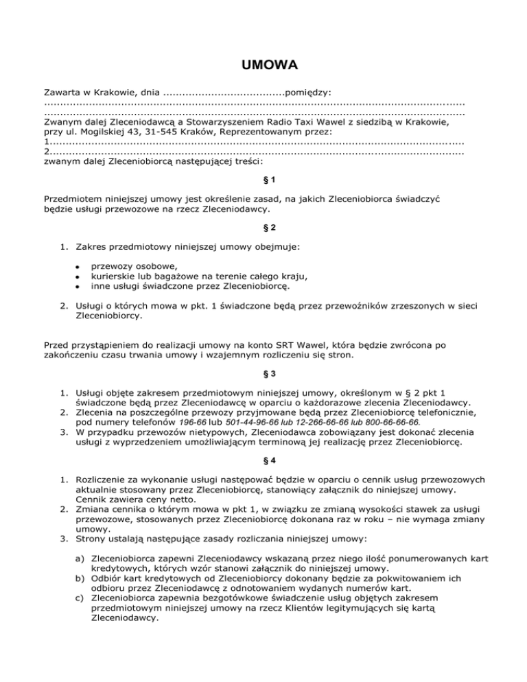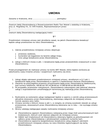 UMOWA Zawarta w Krakowie, dnia ......................................pomiędzy: ................................................................................................................................... ................................................................................................................................... Zwanym dalej Zleceniodawcą a Stowarzyszeniem Radio Taxi Wawel z siedzibą w Krakowie, przy ul. Mogilskiej 43, 31-545 Kraków, Reprezentowanym przez: 1................................................................................................................................. 2................................................................................................................................. zwanym dalej Zleceniobiorcą następującej treści: §1 Przedmiotem niniejszej umowy jest określenie zasad, na jakich Zleceniobiorca świadczyć będzie usługi przewozowe na rzecz Zleceniodawcy. §2 1. Zakres przedmiotowy niniejszej umowy obejmuje: przewozy osobowe, kurierskie lub bagażowe na terenie całego kraju, inne usługi świadczone przez Zleceniobiorcę. 2. Usługi o których mowa w pkt. 1 świadczone będą przez przewoźników zrzeszonych w sieci Zleceniobiorcy. Przed przystąpieniem do realizacji umowy na konto SRT Wawel, która będzie zwrócona po zakończeniu czasu trwania umowy i wzajemnym rozliczeniu się stron. §3 1. Usługi objęte zakresem przedmiotowym niniejszej umowy, określonym w § 2 pkt 1 świadczone będą przez Zleceniodawcę w oparciu o każdorazowe zlecenia Zleceniodawcy. 2. Zlecenia na poszczególne przewozy przyjmowane będą przez Zleceniobiorcę telefonicznie, pod numery telefonów 196-66 lub 501-44-96-66 lub 12-266-66-66 lub 800-66-66-66. 3. W przypadku przewozów nietypowych, Zleceniodawca zobowiązany jest dokonać zlecenia usługi z wyprzedzeniem umożliwiającym terminową jej realizację przez Zleceniobiorcę. §4 1. Rozliczenie za wykonanie usługi następować będzie w oparciu o cennik usług przewozowych aktualnie stosowany przez Zleceniobiorcę, stanowiący załącznik do niniejszej umowy. Cennik zawiera ceny netto. 2. Zmiana cennika o którym mowa w pkt 1, w związku ze zmianą wysokości stawek za usługi przewozowe, stosowanych przez Zleceniobiorcę dokonana raz w roku – nie wymaga zmiany umowy. 3. Strony ustalają następujące zasady rozliczania niniejszej umowy: a) Zleceniobiorca zapewni Zleceniodawcy wskazaną przez niego ilość ponumerowanych kart kredytowych, których wzór stanowi załącznik do niniejszej umowy. b) Odbiór kart kredytowych od Zleceniobiorcy dokonany będzie za pokwitowaniem ich odbioru przez Zleceniodawcę z odnotowaniem wydanych numerów kart. c) Zleceniobiorca zapewnia bezgotówkowe świadczenie usług objętych zakresem przedmiotowym niniejszej umowy na rzecz Klientów legitymujących się kartą Zleceniodawcy. d) Podstawę rozliczania między stronami stanowić będą rachunki kredytowe wystawione przez przewoźników sieci Zleceniobiorcy, zawierające cenę netto usługi. e) Po zakończeniu każdego kursu Klient przekazuje przewoźnikowi kartę kredytową w celu dokonania stosownych wpisów na rachunku. f) Po czytelnym podpisaniu rachunku przez Klienta, przewoźnik Zleceniobiorcy zatrzymuje oryginał rachunku, a kopię wydaje Klientowi. 4. Faktury wystawione przez SRT Wawel dotyczyć będą okresu od 1 do ostatniego dnia każdego miesiąca rozliczeniowego. 5. Wysokość należności z tytułu świadczonych przez Zleceniobiorcę usług ustalana będzie na podstawie zbiorczego zestawienia rachunków indywidualnych przewoźników Zleceniobiorcy. 6. Zapłata należności, o której mowa w pkt 5 następować będzie przelewem na konto bankowe Stowarzyszenia Radio Taxi Wawel w: BPH 45 1060 0076 0000 3200 0129 0577 w terminie 7 dni od daty otrzymania faktury. 7. W przypadku nieterminowej zapłaty naliczane będą odsetki ustawowe oraz wstrzymane będzie wykonywanie usług przez Zleceniobiorcę na rzecz Zleceniodawcy do momentu uregulowania należności. 8. Zleceniodawca gwarantuje Zleceniobiorcy uiszczanie należności zgodnie z wystawionymi fakturami. 9. Kwestionowanie wysokości rachunku nie stanowi podstawy odmowy zapłaty przez Zleceniodawcę za wykonaną usługę. Ewentualne roszczenia Zleceniobiorca będzie kierował oddzielnie na piśmie na adres Zleceniobiorcy. §5 1. Karty kredytowe o których mowa w § 4 pkt 3 stanowią własność Zleceniobiorcy. 2. Przekazane Zleceniodawcy przez Zleceniobiorcę karty kredytowe Zleceniodawca rozprowadza wg własnego uznania. 3. Na żądanie Zleceniodawcy, Zleceniobiorca zapewnia imienne karty. 4. Skutki utraty ( w tym zgubienia lub kradzieży ) przekazanych Zleceniodawcy przez Zleceniobiorcę – kart kredytowych obciążają Zleceniodawcę. 5. W przypadku utraty karty kredytowej, Zleceniodawca zobowiązany jest niezwłocznie powiadomić o tym fakcie Zleceniobiorcę, w celu jej unieważnienia. 6. Koszt wydania Karty pokrywa Zleceniodawca w momencie jej odbioru. §6 Umowę niniejszą zawiera się na czas nieokreślony. Każdej ze stron przysługuje prawo rozwiązania niniejszej umowy z zachowaniem 1 – miesięcznego okresu wypowiedzenia. §7 Wszelkie zmiany niniejszej umowy wymagają zachowania formy pisemnej pod rygorem nieważności. §8 W sprawach nie uregulowanych niniejszą umową zastosowanie mają przepisy kodeksu cywilnego. §9 Spory wynikłe na tle realizacji niniejszej umowy, rozstrzygane będą przez Sądy Powszechne właściwe dla siedziby Zleceniobiorcy. § 10 Umowę niniejszą sporządzono w dwóch jednobrzmiących egzemplarzach, po jednej dla każdej ze stron. ............................................................... ............................................................... Podpis zleceniodawcy Podpis zleceniobiorcy