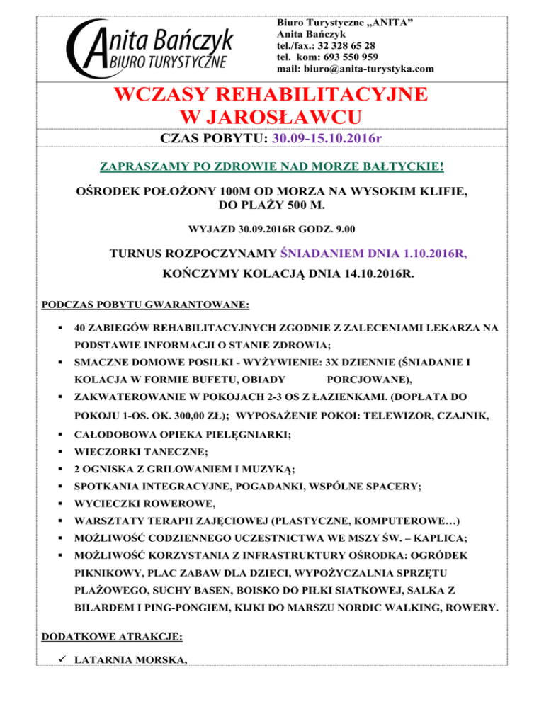 Biuro Turystyczne „ANITA” Anita Bańczyk tel./fax.: 32 328 65 28 tel. kom: 693 550 959 mail: [email protected] WCZASY REHABILITACYJNE W JAROSŁAWCU CZAS POBYTU: 30.09-15.10.2016r ZAPRASZAMY PO ZDROWIE NAD MORZE BAŁTYCKIE! OŚRODEK POŁOŻONY 100M OD MORZA NA WYSOKIM KLIFIE, DO PLAŻY 500 M. WYJAZD 30.09.2016R GODZ. 9.00 TURNUS ROZPOCZYNAMY ŚNIADANIEM DNIA 1.10.2016R, KOŃCZYMY KOLACJĄ DNIA 14.10.2016R. PODCZAS POBYTU GWARANTOWANE: 40 ZABIEGÓW REHABILITACYJNYCH ZGODNIE Z ZALECENIAMI LEKARZA NA PODSTAWIE INFORMACJI O STANIE ZDROWIA; SMACZNE DOMOWE POSIŁKI - WYŻYWIENIE: 3X DZIENNIE (ŚNIADANIE I KOLACJA W FORMIE BUFETU, OBIADY PORCJOWANE), ZAKWATEROWANIE W POKOJACH 2-3 OS Z ŁAZIENKAMI. (DOPŁATA DO POKOJU 1-OS. OK. 300,00 ZŁ); WYPOSAŻENIE POKOI: TELEWIZOR, CZAJNIK, CAŁODOBOWA OPIEKA PIELĘGNIARKI; WIECZORKI TANECZNE; 2 OGNISKA Z GRILOWANIEM I MUZYKĄ; SPOTKANIA INTEGRACYJNE, POGADANKI, WSPÓLNE SPACERY; WYCIECZKI ROWEROWE, WARSZTATY TERAPII ZAJĘCIOWEJ (PLASTYCZNE, KOMPUTEROWE…) MOŻLIWOŚĆ CODZIENNEGO UCZESTNICTWA WE MSZY ŚW. – KAPLICA; MOŻLIWOŚĆ KORZYSTANIA Z INFRASTRUKTURY OŚRODKA: OGRÓDEK PIKNIKOWY, PLAC ZABAW DLA DZIECI, WYPOŻYCZALNIA SPRZĘTU PLAŻOWEGO, SUCHY BASEN, BOISKO DO PIŁKI SIATKOWEJ, SALKA Z BILARDEM I PING-PONGIEM, KIJKI DO MARSZU NORDIC WALKING, ROWERY. DODATKOWE ATRAKCJE: LATARNIA MORSKA, POBLISKIE JEZIORO WICKO, MOŻLIWOŚĆ U CZESTNICZENIA W REJSACH WYCIECZKOWYCH PO MORZU, NOWO WYBUDOWANY AQAPARK „PANORAMA MORSKA” OŚRODEK PRZYJMUJE OSOBY Z NASTĘPUJĄCYMI DYSFUNKCJAMI: Z DYSFUNKCJĄ NARZĄDU RUCHU, ZE SCHORZENIAMI UKŁ. KRĄŻENIA, UKŁ. ODDECHOWEGO, CHOROBAMI UKŁ. POKARMOWEGO, Z CUKRZYCĄ, Z CHOROBAMI UKŁ. KRWIOTWÓRCZEGO, UKŁ. MOCZOWO-PŁCIOWEGO; Z CHOROBAMI NEUROLOGICZNYMI, KOBIETY PO MASTEKTOMII, Z ZABURZENIAMI GŁOSU, MOWY, Z CHOROBAMI PRZEMIANY MATERII, Z EPILEPSJĄ ITD… WYBRANE ZABIEGI REHABILITACYJNE: KĄPIEL PEREŁKOWA, MASAŻ WODNY, WIRÓWKI KOŃCZYN DOLNYCH I KOŃCZYN GÓRNYCH, INHALACJE SOLANKOWE, LAMPA SOLLUX: CZERWONY I NIEBIESKI, GIMNASTYKA OGÓLNOUSPRAWNIAJĄCA, GIMNASTYKA I MASAŻ LIMFATYCZNY DLA AMAZONEK, ROTORY, PRĄDY DIADYNAMICZNE O INTERFERENCYJNE, JONOFOREZA, ULTRADŹWIĘKI, LASER, LASER LEDOWY, KRIOTERAPIA PUNKTOWA, OKŁADY BOROWINOWE. CENA: 1595,00 zł/os REALIZACJA WYJAZDU PRZY GRUPIE MIN. 45 OSÓB. Cena obejmuje: Transport oraz opłaty parkingowe, Opiekę pilota, Noclegi w pokojach 2-3 os. z łazienkami, 40 zabiegów rehabilitacyjnych, Wyżywienie 3x dziennie, Ubezpieczenie NNW, Opłaty klimatyczne, Grill oraz wieczorek integracyjny. ZAPISY DO 31.12.2015R LUB DO WYCZERPANIA MIEJSC. REALIZACJA WYJAZDU PRZY ZEBRANIU MIN. LICZBY UCZESTNIKÓW 45. ZALICZKA W WYSOKOŚCI 200,00 ZŁ/OS PŁATNA DO 15.01.2016 R ISTNIEJE MOŻLIWOŚĆ WPAŁTY POZOSTAŁEJ KWOTY W RATACH. W PRZYPAKU PYTAŃ PROSZĘ O KONTAKT: Halina Oszek kom. 692 581 858
