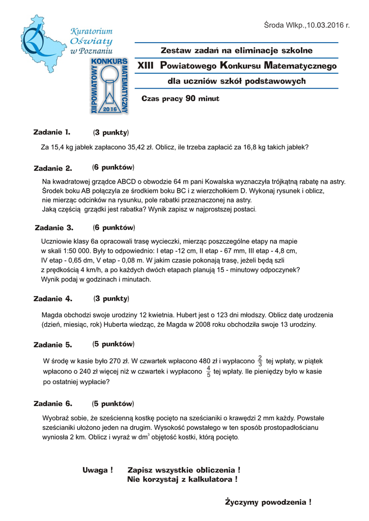 Środa Wlkp.,10.03.2016 r. Zestaw zadań na eliminacje szkolne XIII Powiatowego Konkursu Matematycznego dla uczniów szkół podstawowych Czas pracy 90 minut 20 1 6 Zadanie 1. (3 punkty) Za 15,4 kg jabłek zapłacono 35,42 zł. Oblicz, ile trzeba zapłacić za 16,8 kg takich jabłek? Zadanie 2. (6 punktów) Na kwadratowej grządce ABCD o obwodzie 64 m pani Kowalska wyznaczyła trójkątną rabatę na astry. Środek boku AB połączyla ze środkiem boku BC i z wierzchołkiem D. Wykonaj rysunek i oblicz, nie mierząc odcinków na rysunku, pole rabatki przeznaczonej na astry. Jaką częścią grządki jest rabatka? Wynik zapisz w najprostszej postaci. Zadanie 3. (6 punktów) Uczniowie klasy 6a opracowali trasę wycieczki, mierząc poszczególne etapy na mapie w skali 1:50 000. Były to odpowiednio: I etap -12 cm, II etap - 67 mm, III etap - 4,8 cm, IV etap - 0,65 dm, V etap - 0,08 m. W jakim czasie pokonają trasę, jeżeli będą szli z prędkością 4 km/h, a po każdych dwóch etapach planują 15 - minutowy odpoczynek? Wynik podaj w godzinach i minutach. Zadanie 4. (3 punkty) Magda obchodzi swoje urodziny 12 kwietnia. Hubert jest o 123 dni młodszy. Oblicz datę urodzenia (dzień, miesiąc, rok) Huberta wiedząc, że Magda w 2008 roku obchodziła swoje 13 urodziny. Zadanie 5. (5 punktów) 2 W środę w kasie było 270 zł. W czwartek wpłacono 480 zł i wypłacono 3 tej wpłaty, w piątek 4 wpłacono o 240 zł więcej niż w czwartek i wypłacono 5 tej wpłaty. Ile pieniędzy było w kasie po ostatniej wypłacie? Zadanie 6. (5 punktów) Wyobraź sobie, że sześcienną kostkę pocięto na sześcianiki o krawędzi 2 mm każdy. Powstałe sześcianiki ułożono jeden na drugim. Wysokość powstałego w ten sposób prostopadłościanu wyniosła 2 km. Oblicz i wyraź w dm3 objętość kostki, którą pocięto. Uwaga ! Zapisz wszystkie obliczenia ! Nie korzystaj z kalkulatora ! Życzymy powodzenia !