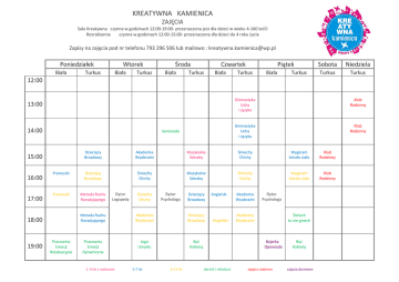 KREATYWNA KAMIENICA ZAJĘCIA Sala Kreatywna czynna w godzinach 12:00-19:00- przeznaczona jest dla dzieci w wieku 4-160 lat Rozrabiarnia czynna w godzinach 12:00-15:00- przeznaczona dla dzieci do 4 roku życia Zapisy na zajęcia pod nr telefonu 793 296 506 lub mailowo : [email protected] Poniedziałek Biała Wtorek Turkus Biała Turkus Środa Biała Czwartek Turkus Biała Piątek Turkus Biała Turkus Sobota Niedziela Turkus Turkus 12:00 13:00 14:00 Seniorada 17:00 Gimnastyka Ucha i Języka Klub Rodzinny Akademia Wyobraźni Muzykalne Szkraby Śmiechy Chichy Wyginam śmiało ciało Klub Rodzinny Francuski Dziecięcy Broadway Śmiechy Chichy Muzykalne Szkraby Śmiechy Chichy Wyginam śmiało ciało Klub Rodzinny Francuski Metoda Ruchu Rozwijającego 18:00 19:00 Klub Rodzinny Dziecięcy Broadway 15:00 16:00 Gimnastyka Ucha i Języka Pracownia Emocji Relaksacyjne Dyżur Logopedy Śmiechy Chichy Dyżur Psychologa Dziecięcy Broadway Metoda Ruchu Rozwijającego Akademia Wyobraźni Dziecięcy Broadway Pracownia Emocji Dynamiczne Joga Umysłu Być Kobietą Angielski Angielski Akademia Wyobraźni Dyżur Psychologa Akademia Wyobraźni Śmiech to nie grzech Bajarka Opowiada Być Kobietą . 1 -4 lat z rodzicami 5-7 lat 8-13 lat dorośli i młodzież zajęcia rodzinne zajęcia darmowe Francuski, Angielski3,2,1.. START! To właśnie dziś rozpocząć może się niesamowita przygoda z językiem francuskim lub angielskim! Jedynym sposobem jego poznawania będzie wspólna zabawa. Będzie do magiczny czas dla dzieci, podczas którego wspólnie wejdziemy w każdy zakątek Francji lub Anglii. Będziemy poznawali ją wszystkimi zmysłami: wzrokiem, dotykiem, węchem, słuchem oraz smakiem. Każda minuta smakowania tych krajów będzie radosną chwilą, podczas której dzieci będą się rozwijać i świetnie bawić! Zapraszamy na niesamowite zajęcia z języka francuskiego i angielskiego i tym samym przekraczanie jakichkolwiek granic kreatywności na zajęciach! :) Dziecięcy Broadway Zawiera on naukę podstawowych elementów baletu klasycznego oraz wprowadzenie do akrobatyki jazzowej. Jest to też świetny sposób do wyrobienia odpowiedniej postawy a także wypracowania plastyczności ruchów ciała. Dzieci poprzez zabawy umuzykalniające i ćwiczenia będą uczyć się podstawowych pozycji i figur baletowych, które będą w przyszłości wykorzystywane do opracowania trudniejszych układów. Przy muzyce ze znanych bajek i filmów będziemy poznawać świat tańca i doskonalić swoje umiejętności. Muzykalne Szkraby "Muzyka jest czymś specyficznym dla ludzkości. Tak jak inne sztuki, jest ona podstawą ludzkiego rozwoju i egzystencji w takim samym stopniu co język". E.E.Gordon Zajęcia umuzykalniające dla dzieci w wieku od 0 do 3 lat, prowadzone w oparciu o teorię uczenia się muzyki prof. Eliasa E.Gordona. Zajęcia polegają na stymulowaniu rozwoju muzycznego dziecka głównie za pomocą śpiewu. Metoda Ruchu Rozwijającego Opracowany przez W. Sherborne system ćwiczeń wywodzi się z naturalnych potrzeb dziecka, zaspokajanych w kontakcie z dorosłymi w trakcie tzw. "baraszkowania". Prostota i naturalność są głównymi walorami metody Weroniki Sherborne i stanowią o jej wartości i powodzeniu. Podstawowe założenia metody, to rozwijanie przez ruch: • świadomości własnego ciała i usprawniania ruchowego, • świadomości przestrzeni i działania w niej, • dzielenia przestrzeni z innymi ludźmi i nawiązywania z nimi bliskiego kontaktu. Dziecko poznaje więc własne ciało i przestrzeń, która je otacza, spotyka w niej innego człowieka, uczy się współpracować, zdobywa zaufanie do siebie i innych, a czując się bezpieczne może stać się twórcze. Ruch jest zabawą, która daje przeżycie radości i dzielenia jej z innymi, co jest bardzo ważne w nawiązywaniu kontaktów społecznych. Akademia Wyobraźni Nie da się ukryć, że dzieci są mistrzami wyobraźni. Jedne dzielą się z otoczeniem swoimi wyobrażeniami, inne zachowują to dla siebie albo dla swoich wymyślonych przyjaciół J Akademia wyobraźni to zajęcia, na których wszystkie te dzieci mogą poznać ciekawe sposoby praktycznego wykorzystania swoich umiejętności. Oprócz kreowania niecodziennych bajek i różnorodnych prac plastycznych, dzieci będą prowadziły fabrykę stworków, wytwórnię dźwięków, czy swój teatrzyk. Ponadto na osobnych zajęciach dzieci w wieku szkolnym będą mogły poznać tajniki praktycznego wykorzystywania wyobraźni w uczeniu się i efektywnym zapamiętywaniu. Śmiechy Chichy Wesołe zajęcia dla dzieci, które chcą się szczerze i zdrowo pośmiać w towarzystwie rówieśników, bądź rodziców. Zajęcia opracowane zostały na podstawie zasad śmiechoterapii i prowadzone są przez pedagoga w komicznym przebraniu Śmiech to zdrowie, więc watro ćwiczyć go od najmłodszych lat! Spotkania ponadto mają na celu utrwalanie w dzieciach pozytywnych nawyków, budowanie pewności siebie i kształtowanie umiejętności społecznych. Gimnastyka Ucha i Języka Zajęcia z logorytmiki dla dzieci w wieku przedszkolnym i wczesnoszkolnym obejmujące : trening słuchowy, ćwiczenia rytmizujące, ćwiczenia relaksacyjne, ćwiczenia muzyczno-ruchowe. Mają one formę zabawy, dzięki której można wykształcić lub usprawnić ruchy całego ciała, a co za tym idzie – pośrednio usprawnić narządy mowy. Wyginam Śmiało Ciało Zajęcia ruchowe oparte na tańcu, które maja na celu rozwijanie sprawności fizycznej oraz mobilizowanie dzieci do tworzenia własnych układów tanecznych. Zabawa w choreografów i tancerzy w jednym! Wszystko w zwariowanym klimacie i z wykorzystaniem największych radiowych przebojów! Joga umysłu Spokojnie! Nie będziemy go wyginać w dziwne kształty;) Joga mózgu, to zajęcia podtrzymujące sprawne funkcjonowanie pamięci. Bardzo często pamięć pogarsza się z braku treningu, dlatego tak ważne jest aby ją nieustannie ćwiczyć. Zajęcia opracowane zostały na podstaw