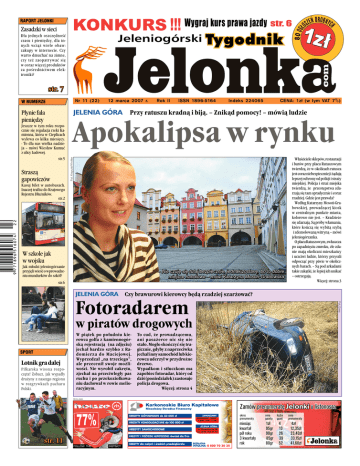 Dla jednych oszczędność czasu i pieniędzy, dla innych wciąż wiele obaw: zakupy w internecie. Czy warto dmuchać na zimne, czy też zaopatrywać się w coraz więcej produktów za pośrednictwem elektroniki? KONKURS !!! Jeleniogórski Tygodnik O S ZE Ń D ROB NY C 1zł H Zasadzki w sieci Wygraj kurs prawa jazdy str. 6 8 0 O GŁ RAPORT JELONKI str. 7 Nr 11 (22) W NUMERZE 12 marca 2007 r. JELENIA GÓRA Jeszcze w tym roku rozpocznie się regulacja rzeki Kamienna, która w Cieplicach wylewa co kilka miesięcy. - To dla nas wielka nadzieja – mówi Wiesław Kumuć z ulicy Ludowej. str.5 Straszą gapowiczów ISSN 1896-5164 Indeks 224065 CENA: 1zł (w tym VAT 7%) Przy ratuszu kradną i biją. – Znikąd pomocy! – mówią ludzie Apokalipsa w rynku Fot. Krzysztof Knitter Płynie fala pieniędzy Rok II Kasuj bilet w autobusach. Inaczej trafisz do Krajowego Rejestru Dłużników. str.2 W szkole jak w wojsku Jak młodzi jeleniogórzanie przyjęli wieść o wprowadzeniu mundurków do szkół? – Nie czuję się tutaj bezpiecznie, jednak zostanę, bo to dobre miejsce handlowe – mówi Katarzyna Mosoń-Grabowska str.6 JELENIA GÓRA Właściciele sklepów, restauracji i barów przy placu Ratuszowym twierdzą, że w okolicach ratusza jest coraz niebezpieczniej i żądają lepszej ochrony od policji i straży miejskiej. Policja i straż miejska twierdzą, że przestępstwa zdarzają się tam spradycznie i coraz rzadziej. Gdzie jest prawda? Według Katarzyny Mosoń-Grabowskiej, prowadzącej kiosk w centralnym punkcie miasta, kolorowo nie jest. – Kradzieże się zdarzają. Są próby włamania, które kończą się wybitą szybą i zdemolowaną witryną – mówi jeleniogórzanka. O placu Ratuszowym, zwłaszcza po zapadnięciu zmroku, złe zdanie mają okoliczni mieszkańcy i uczciwi ludzie, którzy przyszli odpocząć przy piwie w okolicznych barach. – Są pod arkadami takie zakątki, że lepiej ich unikać – ostrzegają. Więcej: strona 3 Czy brawurowi kierowcy będą rzadziej szarżować? Fot. Emis Fotoradarem w piratów drogowych SPORT Lotnik gra dalej Piłkarska wiosna rozpoczęta! Zobacz, jak wypadły drużyny z naszego regionu w rozgrywkach pucharu Polski. W piątek po południu kierowca golfa z kamiennogórską rejestracją (na zdjęciu) jechał bardzo szybko z Radomierza do Maciejowej. Wyprzedzał „na trzeciego”, ale przecenił swoje możliwości. Nie wyrobił zakrętu, zjechał na przeciwległy pas ruchu i po przekoziołkowaniu dachował w rowie melioracyjnym. To cud, że prowadzącemu, ani pasażerce nic się nie stało. Mogło skończyć się tragicznie, gdyby z naprzeciwka jechał inny samochód lub kierowca uderzył w przydrożne drzewo. Wypadkom i stłuczkom ma zapobiec fotoradar, który od dziś (poniedziałek) zastosuje policja drogowa. Więcej: strona 4 REKLAMA Zamów prenumeratę Jelonki u listonosza 77% str. 11 FOLLOW THE INSTINCT okres prenumeraty cena gazety miesiąc kwartał pół roku 3 kwartały rok 1zł 95gr 90gr 85gr 80gr liczba gazet cena prenumeraty 4 13 26 39 52 4zł 12,35zł 23,40zł 33,15zł 41,60zł w poniedzia³ek w gazecie, codziennie w internecie 12 marca 2007 r. WIADOMOŒCI JELENIA GÓRA Bohaterska akcja kościelnego VIP NUMERY SAD OKRÊGOWY W J. GÓRZE 64 15 100 PROKURATURA REJONOWA W J. GÓRZE 64 28 400 PROKURATURA OKRÊGOWA W J. GÓRZE 64 28 400 DOM GERHARTA HAUPTMANNA 75 53 286 POCZTA G£ÓWNA 75 243 90 SANEPID 75 24 906 WOJEWÓDZKI KONSERWATOR ZABYTKÓW 75 26 865 ZAK£AD UBEZPIECZEÑ SPO£ECZNYCH 64 68 400 KURATORIUM OŒWIATY 64 24 810 WYDZIA£ PASZPORTOWY 76 47 711 lub 722 Złapał włamywacza Damian Konieczny schwytał złodzieja, który próbował okraść kościół garnizonowy. . Grz ywac z – Wieczorem świątynię zamknął inny kościelny – opowiada Damian Konieczny, kościelny i zarazem bohater zdarzenia. – Złodziej wcześniej schował się w zachrystii. Ja z księdzem Piotrem Filipkiem poszedłem około godziny 21.10 przygotować kościół do porannej mszy w niedzielę. Zobaczyliśmy, że w środku jest wszystko powywracane. Złodziej przygotował sobie DVD i kielichy mszalne do wyniesienia. Wyszedłem z kościoła żeby zadzwonić do księdza proboszcza i na policję. W tym czasie ksiądz Piotr zobaczył, że złodziej rusza się za filarem i zdemaskował go. Usłyszałem krzyk. Złodziej zaczął uciekać, popchnął mnie i wybiegł na zewnątrz. Początkowo goniliśmy go z księdzem Piotrem, ale nie można było zostawić otwartej za- Fot. A POLICJA 997 STRA¯ PO¯ARNA 998 POGOTOWIE 999 GOPR 985 POG. ENERGETYCZNE 991 POG. GAZOWE 992 POG. WODOCI¥GOWE 994 Komenda Miejska Policji 75 26 938 ul. Nowowiejska Komisariat Policji 75 20 464 Plac Piastowski (Cieplice) Komisariat Policji 75 20 150 ul. Armii Krajowej Szpital Wojewódzki 75 37 100 Stra¯ Miejska 75 251 62 KMP Stra¯y Po¯arnej 76 47 450 Pogotowie Ratunkowe 75 23 636 Górskie Ochotnicze Pogotowie Ratunkowe 75 24 734 UrZ¥d Miasta Jelenia Góra 75 46 100 Pl RatuszowY Urz¥d Miasta 75 46 200 MOPS 75 23 951 Powiatowy Urz¥d Pracy 64 73 160 Pogotowie Ratunkowe 75 23 636 Urz¥d Skarbowy 64 73 500 Urz¥d Celny 75 53 043 NARODOWY FUNDUSZ ZDROWIA 64 58 709 Kuratorium OŒwiaty 64 24 810 Rzecznik Praw Konsumenta 75 46 110 Centrum Informacji Turystycznej 76 76 935 Teatr Jeleniogórski 64 28 110 Filharmonia DolnoŒl¥ska 75 38 160 JELENIOGÓRSKIE CENTR. KULT. 64 238 81 Osiedlowy Dom Kultury 75 41 090 M£odzie¯owy Dom Kultury 64 24 460 Miejski Dom Kultury „Muflon” 75 53 626 Miejski Zak£ad Komunikacji 76 48 736 Info. PKP 75 29 327 InFO. PKS 0 300 300 137 0 708 308 000 *720 81 37 KINA LOT 76 76 370 MARYSIEÑKA 76 76 380 GRAND 75 223 78 – Włamywacz mi groził, ale na szczęście, nic nie zrobił – mówi Damian Konieczny chrystii, więc ksiądz Piotr musiał wrócić. Złodziej uciekał w kierunku ulicy Wincentego Pola, przebiegł przez tory i wybiegł na ulicę Drzymały. – Tam udało mi się go dogonić – mówi kościelny. – Szarpaliśmy się chwilę. Na szczęście utrz