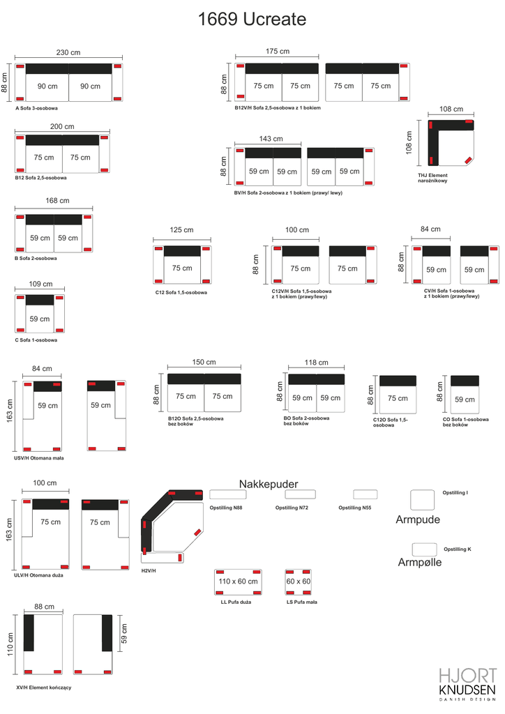 1669 Ucreate 175 cm 230 cm 90 cm 75 cm 90 cm 75 cm 75 cm 75 cm B12V/H Sofa 2,5-osobowa z 1 bokiem A Sofa 3-osobowa 108 cm 200 cm 143 cm 75 cm 75 cm 59 cm 59 cm 59 cm 59 cm THJ Element narożnikowy B12 Sofa 2,5-osobowa BV/H Sofa 2-osobowa z 1 bokiem (prawy/ lewy) 168 cm 59 cm 84 cm 125 cm 100 cm 75 cm 75 cm C12 Sofa 1,5-osobowa C12V/H Sofa 1,5-osobowa z 1 bokiem (prawy/lewy) 59 cm B Sofa 2-osobowa 75 cm 59 cm 59 cm 109 cm CV/H Sofa 1-osobowa z 1 bokiem (prawy/lewy) 59 cm C Sofa 1-osobowa 150 cm 84 cm 75 cm 59 cm 118 cm 75 cm 59 cm 59 cm 59 cm BO Sofa 2-osobowa bez boków B12O Sofa 2,5-osobowa bez boków 75 cm C12O Sofa 1,5osobowa 59 cm CO Sofa 1-osobowa bez boków USV/H Otomana mała Nakkepuder 100 cm Opstilling I Opstilling N88 75 cm Opstilling N72 Opstilling N55 Armpude 75 cm Opstilling K Armpølle ULV/H Otomana duża H2V/H 110 x 60 cm 88 cm XV/H Element kończący LL Pufa duża 60 x 60 LS Pufa mała