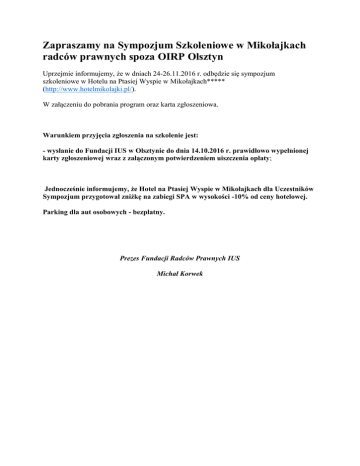 Zapraszamy na Sympozjum Szkoleniowe w Mikołajkach radców prawnych spoza OIRP Olsztyn Uprzejmie informujemy, że w dniach 24-26.11.2016 r. odbędzie się sympozjum szkoleniowe w Hotelu na Ptasiej Wyspie w Mikołajkach***** (http://www.hotelmikolajki.pl/). W załączeniu do pobrania program oraz karta zgłoszeniowa. Warunkiem przyjęcia zgłoszenia na szkolenie jest: - wysłanie do Fundacji IUS w Olsztynie do dnia 14.10.2016 r. prawidłowo wypełnionej karty zgłoszeniowej wraz z załączonym potwierdzeniem uiszczenia opłaty; Jednocześnie informujemy, że Hotel na Ptasiej Wyspie w Mikołajkach dla Uczestników Sympozjum przygotował zniżkę na zabiegi SPA w wysokości -10% od ceny hotelowej. Parking dla aut osobowych - bezpłatny. Prezes Fundacji Radców Prawnych IUS Michał Korwek