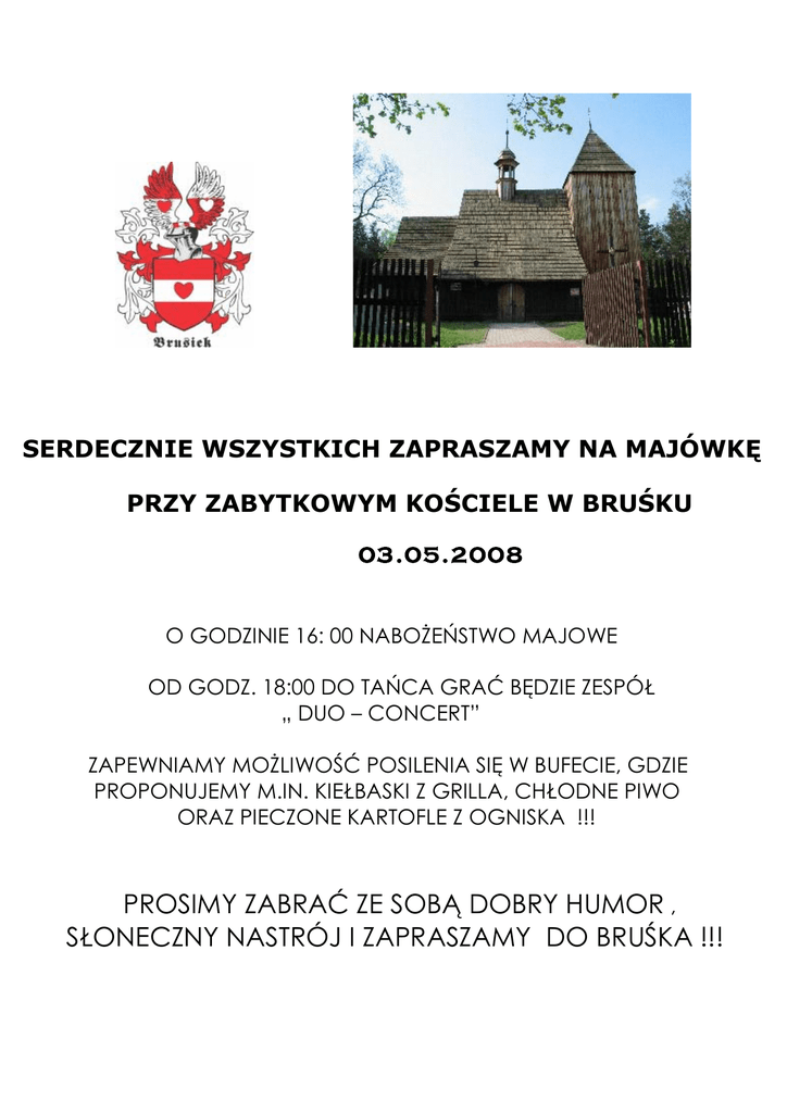 SERDECZNIE WSZYSTKICH ZAPRASZAMY NA MAJÓWKĘ PRZY ZABYTKOWYM KOŚCIELE W BRUŚKU 03.05.2008 O GODZINIE 16: 00 NABOŻEŃSTWO MAJOWE OD GODZ. 18:00 DO TAŃCA GRAĆ BĘDZIE ZESPÓŁ „ DUO – CONCERT” ZAPEWNIAMY MOŻLIWOŚĆ POSILENIA SIĘ W BUFECIE, GDZIE PROPONUJEMY M.IN. KIEŁBASKI Z GRILLA, CHŁODNE PIWO ORAZ PIECZONE KARTOFLE Z OGNISKA !!! PROSIMY ZABRAĆ ZE SOBĄ DOBRY HUMOR , SŁONECZNY NASTRÓJ I ZAPRASZAMY DO BRUŚKA !!!