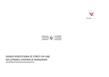 ZASADY KORZYSTANIA ZE STREFY VIP LINE NA LOTNISKU CHOPINA W WARSZAWIE DEDYKOWANE KLIENTOM INDYWIDUALNYM 8. W przypadku odwołania rejsu statku powietrznego z przyczyn niezależnych od Lotniska Chopina w Warszawie, osoba, która skorzystała ze Strefy VIP Line jest zobowiązana do uiszczenia stosownej opłaty, zgodnie z cennikiem. ZASADY KORZYSTANIA ZE STREFY VIP LINE NA LOTNISKU CHOPINA W WARSZAWIE DEDYKOWANE KLIENTOM INDYWIDUALNYM 9. Zakres usługi VIP Line świadczonej w Strefie VIP Line jest określony w Załączniku nr 1 do niniejszych Zasad. 10. Obsługa Strefy VIP Line zastrzega sobie prawo odmowy przyjęcia zgłoszenia w przypadku stwierdzenia nieprawidłowości danych na formularzu zgłoszeniowym. ZASADY REZERWACJI ORAZ REGULAMIN KORZYSTANIA 1. Usługa świadczona w Strefie VIP Line (zwana dalej „usługą VIP Line”) świadczona jest na podstawie złożonej rezerwacji dokonanej w formie zgłoszenia przesłanego najpóźniej na 4 godziny przed planowanym odlotem/przylotem. ZASADY ZAMÓWIENIA IMIENNEJ KARTY OKRESOWEJ 1. W celu zamówienia imiennej karty okresowej, uprawniającej do nielimitowanej ilości przejść przez Strefę VIP Line przez wskazany okres, należy wypełnić druk „Potwierdzenie zamówienia Imiennej Karty okresowej”, który stanowi Załącznik nr 4 do niniejszych Zasad i odesłać go na adres [email protected] 2. Wypełniony formularz zgłoszeniowy, którego wzór stanowi Załącznik nr 3 do niniejszych Zasad, należy przesłać na adres e-mail: [email protected]. 3. Zgłoszenia przyjmowane są w godzinach 05:00 – 23:00. CENNIK ORAZ WARUNKI PŁATNOŚCI 4. Anulowanie rezerwacji możliwe jest nie później niż na 1 godzinę przed planowanym odlotem/przylotem. 1. 5. Osoby odlatujące mogą przybyć do Strefy VIP Line najwcześniej na 2 godziny, ale nie później niż na 40 minut przed planowanym czasem odlotu, zaś w przypadku rejsów transatlantyckich nie później niż na godzinę przed planowanym czasem odlotu. 2. Do dnia ukończenia 12 roku życia, dzieci korzystają ze Strefy VIP Line bezpłatnie. Opłata za korzystanie ze Strefy VIP Line jest pobierana zgodnie z cennikiem, który stanowi Załącznik nr 2 do niniejszych Zasad. 3. Jeżeli rezerwacja nie zostanie odwołana na mniej niż 1 godzinę przed planowanym skorzystaniem ze Strefy VIP Line , a pasażer nie zgłosi się do Strefy VIP Line, zostanie on obciążany jak za skorzystanie ze Strefy VIP Line zgodnie z obowiązującym cennikiem. 6. Osoby witające mogą zgłaszać się do Strefy VIP Line nie wcześniej, niż na 30 minut przed planowanym przylotem statku powietrznego. 7. Do dnia ukończenia 12 roku życia, Dzieci mogą korzystać ze Strefy VIP Line wyłącznie jeśli towarzyszą w podróży osobie dorosłej. 4. Płatność za skorzystanie ze Strefy VIP Line można dokonać gotówką i kartą kredytową w Strefie VIP Line lub przelewem. -1- Lista załączników: 5. Za usługi VIP Line zrealizowane w danym miesiącu, PPL wystawiać będzie fakturę zgodnie z cennikiem, w terminie do 15 dnia miesiąca następującego po miesiącu rozliczeniowym, w którym świadczona była usługa lub w terminie do 7 dni od daty dokonania płatności, w przypadku jeśli płatność została dokonana gotówką lub kartą kredytową. Zamawiający upoważnia Przedsiębiorstwo Państwowe „Porty Lotnicze” do wystawienia faktury VAT bez jego podpisu. Załącznik nr 1 - Zakres usług świadczonych w Strefie VIP Line na Lotnisku Chopina w Warszawie oferowanych w ramach obsługi Załącznik nr 2 - Cennik Załącznik nr 3 – Wzór wniosku na skorzystanie ze Strefy VIP Line na Lotnisku Chopina w Warszawie Załącznik nr 4 - Potwierdzenie zamówienia imiennej rocznej karty VIP upoważniającej do korzystania ze Strefy VIP Line na Lotnisku Chopina w Warszawie 6. W przypadku, gdy płatność będzie dokonywana przelewem, należy jej dokonać na podstawie otrzymanej faktury, w terminie wskazanym na fakturze, na numer rachunku bankowego wskazany na fakturze. 7. Terminem spełnienia świadczenia jest data uznania ww. rachunku bankowego wymaganą należnością. 8. Wszelkie dodatkowe informacje można uzyskać w Zespole Obsługi VIP Portu Lotniczego im. Fryderyka Chopina w Warszawie pod niżej wymienonymi numerami telefonów kontaktowych. 9. Załączniki stanowią integralną część Zasad. KONTAKT Obsługa pasażerów/rezerwacja/anulowanie rezerwacji Zespół Obsługi Pasażerów VIP Line tel: 22 650 45 69, 22 650 45 65 e mail: [email protected] Obsługa umów/warunki współpracy Biuro Handlowe Lotniska Chopina w Warszawie tel: 22 650 18 30. -1- Załącznik nr 1 Osoby posiadające imienne roczne karty VIP, w ramach uiszczonej opłaty za wydanie tej karty, mają możliwość korzystania z parkingu VIP, zlokalizowanego przy wejściu do Salonów VIP bez limitu czasu. ZAKRES USŁUG ŚWIADCZONYCH W STREFIE VIP LINE NA LOTNISKU CHOPINA W WARSZAWIE W ramach usługi VIP Line dostępne są: 1. Wydzielona droga dojazdowa bezpośrednio pod Salony VIP Line, 2. Natychmiastowa i dyskretna odprawa paszportowa, biletowo-bagażowa, celna oraz kontrola bezpieczeństwa zgodnie z aktualnie obowiązującymi przepisami, 3. Indywidualną asysta Stewarda Salonów VIP Line, 4. Poczęstunek (przekąski zimne, dania gorące, napoje alkoholowe i bezalkoholowe) 5. Dostęp do prasy oraz magazynów, 6. W przypadku korzystania podczas odlotu – transport limuzyną bezpośrednio do samolotu tuż przed planowanym odlotem, 7. W przypadku korzystania podczas przylotu – transport limuzyną bezpośrednio z samolotu oraz dostarczenie bagażu do samochodu Pasażera. 8. Na dodatkowe życzenie Obsługa Salonów VIP Line zapewni: a) rezerwację hotelu; b) przywołanie taksówki; c) pomoc w uzyskaniu informacji lotniczej, autobusowej oraz kolejowej, d) obsługę minikonferencji i spotkań biznesowych wraz z poczęstunkiem w ramach oferowanych w strefie VIP Line artykułów konsumpcyjnych. W Salonach VIP Line dostępny jest bezpłatny Internet stacjonarny oraz 