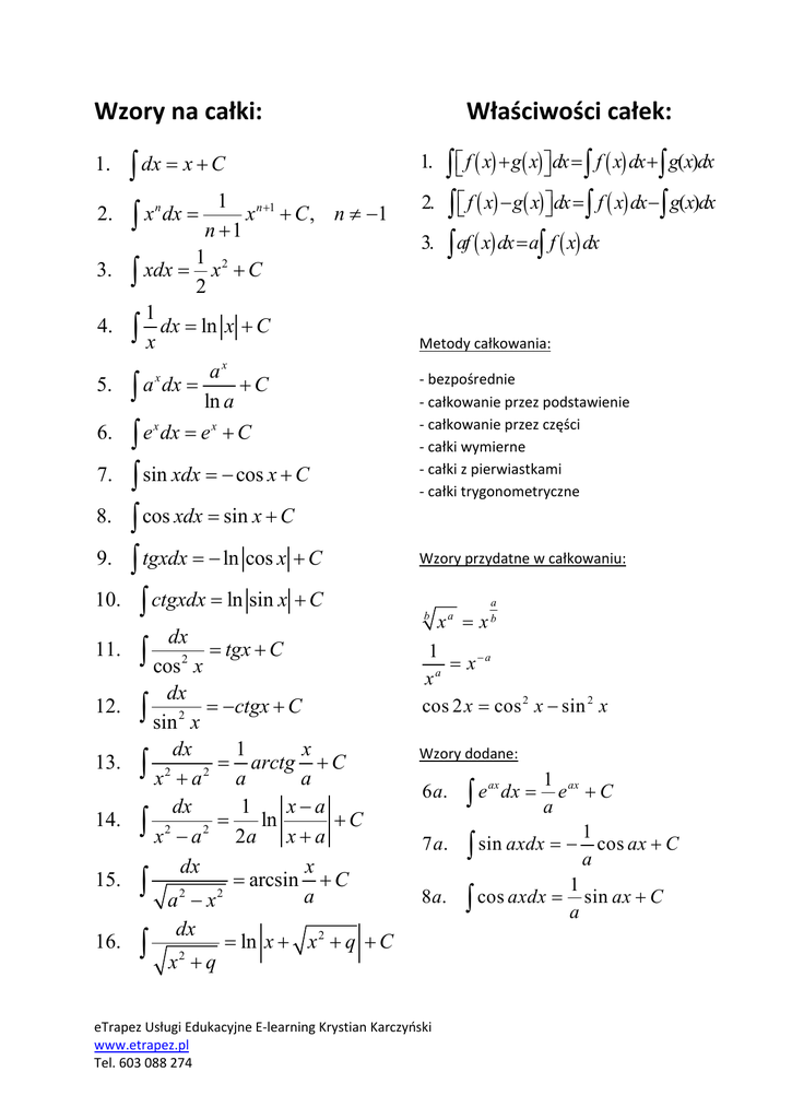 Wzory na całki: 1. ∫ dx = x + C 2. ∫ x dx = n + 1 x 1 n Właściwości całek: 1. n +1 + C , n ≠ −1 1 3. ∫ xdx = x 2 + C 2 1 4. ∫ dx = ln x + C x ax x +C 5. ∫ a dx = ln a 6. 7. 8. 9. 10. 11. 12. 13. 14. 15. 16. x x e dx e = +C ∫ ∫ sin xdx = − cos x + C ∫ cos xdx = sin x + C ∫ tgxdx = − ln cos x + C ∫ ctgxdx = ln sin x + C dx ∫ cos 2 x = tgx + C dx ∫ sin 2 x = −ctgx + C 1 dx x = +C arctg 2 2 ∫ x +a a a 1 dx x−a ln = ∫ x 2 − a 2 2a x + a + C dx x arcsin = +C ∫ a2 − x2 a ∫ dx x2 + q 2. 3. ∫ f ( x) + g( x) dx = ∫ f ( x) dx + ∫ g(x)dx ∫ f ( x) − g( x) dx = ∫ f ( x) dx −∫ g(x)dx ∫af ( x) dx = a∫ f ( x) dx Metody całkowania: - bezpośrednie - całkowanie przez podstawienie - całkowanie przez części - całki wymierne - całki z pierwiastkami - całki trygonometryczne Wzory przydatne w całkowaniu: a b x =x 1 = x−a a x cos 2 x = cos 2 x − sin 2 x b a Wzory dodane: 1 ax e +C a 1 7 a. ∫ sin axdx = − cos ax + C a 1 8 a. ∫ cos axdx = sin ax + C a 6 a. = ln x + x 2 + q + C eTrapez Usługi Edukacyjne E-learning Krystian Karczyński www.etrapez.pl Tel. 603 088 274 ax ∫ e dx =