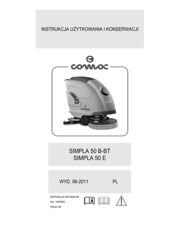 INSTRUKCJA UŻYTKOWANIA I KONSERWACJI SIMPLA 50 B-BT SIMPLA 50 E WYD. 06-2011 INSTRUKCJE ORYGINALNE Dok. 10026263 Wersja AB PL Informacje zawarte w niniejszej instrukcji nie mają charakteru wiążącego. Producent zastrzega sobie prawo do wprowadzania w dowolnym momencie ewentualnych zmian elementów, detali, dostarczanych akcesoriów, które uzna za konieczne w celu udoskonalenia produktu lub spełnienia wymogów technicznych lub handlowych. Powielanie, również częściowe, tekstów i rysunków zawartych w niniejszej instrukcji jest zabronione. Producent zastrzega sobie prawo do wprowadzania zmian technicznych i/lub zmian dołączonego wyposażenia. Rysunki mają charakter informacyjny i nie są wiążące w zakresie wyglądu i wyposażenia urządzenia. Symbole stosowane w instrukcji Symbol otwartej książki z literą i: Oznacza konieczność przeczytania instrukcji użytkownika Symbol ostrzeżenia Należy uważnie przeczytać akapity poprzedzone tym symbolem i stosować się ściśle do wszystkich wskazówek, w celu zapewnienia bezpieczeństwa operatorowi i maszynie Symbol otwartej książki: Oznacza konieczność przeczytania instrukcji użytkownika przed użytkowaniem maszyny Symbol ostrzeżenia Niebezpieczeństwo wyziewów gazu i wycieku płynów korozyjnych Symbol ostrzeżenia Niebezpieczeństwo pożaru. Nie zbliżać się z otwartym ogniem Symbol ostrzeżenia Oznacza transportowanie opakowanego produktu podnośników zgodnych z obowiązującymi przepisami za pomocą SPIS TREŚCI ODBIÓR MASZYNY ..................................................................................................................................................................................................................... 5 TABLICZKA ZNAMIONOWA ....................................................................................................................................................................................................... 5 WSTĘP.......................................................................................................................................................................................................................................... 5 PRZEWIDZIANE UŻYTKOWANIE MASZYNY............................................................................................................................................................................. 5 DANE TECHNICZNE .................................................................................................................................................................................................................... 6 SYMBOLE UMIESZCZONE NA MASZYNIE................................................................................................................................................................................ 7 OGÓLNE NORMY BEZPIECZEŃSTWA...................................................................................................................................................................................... 9 PRZYGOTOWANIE MASZYNY.................................................................................................................................................................................................. 10 1. PRZENOSZENIE OPAKOWANEJ MASZYNY................................................................................................................................................................... 10 2. USUWANIE OPAKOWANIA MASZYNY ............................................................................................................................................................................ 10 3. TRANSPORTOWANIE MASZYNY .................................................................................................................................................................................... 10 4. WKŁADANIE/PODŁĄCZANIE AKUMULATORÓW (TYLKO WERSJE B-BT) ................................................................................................................... 11 5. TYP AKUMULATORA (TYLKO WERSJE B-BT)................................................................................................................................................................ 12 6. KONSERWACJA I UTYLIZACJA AKUMULATORA (TYLKO WERSJE B-BT) .................................................................................................................. 12 7. ŁADOWANIE AKUMULATORÓW ZA POMOCĄ ZEWNĘTRZNEJ ŁADOWARKI (WERSJE BEZ CB) ...................................................................................... 12 8. PODŁĄCZENIE ZŁĄCZA INSTALACJI ELEKTRYCZNEJ (TYLKO WERSJE B-BT) ........................................................................................................ 13 9. ŁADOWANIE AKUMULATORÓW ZA POMOCĄ WEWNĘTRZNEJ ŁADOWARKI (WERSJE Z CB) ................................................................................... 13 10. SYGNALIZATOR POZIOMU NAŁADOWANIA AKUMULATORA (TYLKO WERSJE B-BT) ........................................................................................... 14 11. ELEMENTY TABLICY STEROWNICZEJ......................................................................................................................................................................... 14 12. ELEMENTY TYLNE.......................................................................................................................................................................................................... 15 13. ELEMENTY BOCZNE ...................................................................................................................................................................................................... 15 14. MONTAŻ WYCIERACZKI ............................................................................................................................................................................