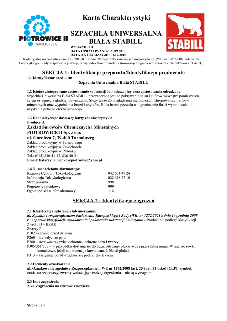 Karta Charakterystyki SZPACHLA UNIWERSALNA BIAŁA STABILL WYDANIE III DATA OPRACOWANIA: 23.09.2013 DATA AKTUALIZACJII: 02.12.2015 Karta zgodna rozporządzeniem (UE) 2015/830 z dnia 28 maja 2015 zmieniające rozporządzenie (WE) nr 1907/2006 Parlamentu Europejskiego i Rady w sprawie rejestracji, oceny, udzielania zezwoleń i stosowanych ograniczeń w zakresie chemikaliów (REACH). SEKCJA 1: Identyfikacja preparatu/Identyfikacja producenta 1.1 Identyfikator produktu: Szpachla Uniwersalna Biała STABILL 1.2 Istotne zintegrowane zastosowanie substancji lub mieszaniny oraz zastosowania odradzane: Szpachla Uniwersalna Biała STABILL, przeznaczona jest do pokrywania ścian i sufitów wewnątrz pomieszczeń, celem osiągnięcia gładkiej powierzchni. Służy także do wygładzania nierówności i chropowatości tynków mineralnych oraz wypełniania bruzd i ubytków. Biała barwa pozwala na ograniczenie ilości wymalowań, do uzyskania pełnego efektu barwnego. 1.3 Dane dotyczące dostawcy karty charakterystyki: Producent: Zakład Surowców Chemicznych i Mineralnych PIOTROWICE II Sp. z o.o. ul. Górnicza 7, 39-400 Tarnobrzeg Zakład produkcyjny w Tarnobrzegu Zakład produkcyjny w Zawichoście Zakład produkcyjny w Rybniku Tel.: (015) 836-41-42, 836-40-21 Email: [email protected] 1.4 Numer telefonu alarmowego: Krajowe Centrum Toksykologiczne Informacja Toksykologiczna Straż pożarna Pogotowie ratunkowe Ogólnopolski telefon alarmowy 042 631 47 24 022 618 77 10 998 999 112 SEKCJA 2 : Identyfikacja zagrożeń 2.1 Klasyfikacja substancji lub mieszaniny a). Zgodnie z rozporządzeniem Parlamentu Europejskiego i Rady (WE) nr 1272/2008 z dnia 16 grudnia 2008 r. w sprawie klasyfikacji, oznakowania i pakowania substancji i mieszanin - Produkt nie podlega klasyfikacji Zwroty H – BRAK Zwroty P: P102 - chronić przed dziećmi P260 – nie wdychać pyłu P280 – stosować rękawice ochronne, ochronę oczu I twarzy P305/351/338 – w przypadku dostania się do oczu: ostrożnie płukać wodą przez kilka minut. Wyjąć soczewki kontaktowe, jeżeli są i można je łatwo usunąć. Nadal płukać. P313 – zasięgnąć porady/ zgłosić się pod opiekę lekarza 2.2 Elementy oznakowania a). Oznakowanie zgodnie z Rozporządzeniem WE nr 1272/2008 (art. 25 i art. 32 ust.6) [CLP]: symbol, znak ostrzegawczy, zwroty wskazujące rodzaj zagrożenia – nie są wymagane 2.3 Inne zagrożenia 2.3.1 Zagrożenia na zdrowie człowieka Strona 1 z 9 Karta Charakterystyki SZPACHLA UNIWERSALNA BIAŁA STABILL WYDANIE III DATA OPRACOWANIA: 23.09.2013 DATA AKTUALIZACJII: 02.12.2015 Karta zgodna rozporządzeniem (UE) 2015/830 z dnia 28 maja 2015 zmieniające rozporządzenie (WE) nr 1907/2006 Parlamentu Europejskiego i Rady w sprawie rejestracji, oceny, udzielania zezwoleń i stosowanych ograniczeń w zakresie chemikaliów (REACH). Przewlekły kontakt ze skórą może powodować odłuszczenie, podrażnienie, zaczerwienienie, podrażnienia mechaniczne oczu i układu oddechowego. 2.3.2 Zagrożenie z środowisko Brak informacji 2.3.3 Cena właściwości PBT i vPvB Nie dotyczy SEKCJA 3: Skład/informacja o składnikach 3.1 Substancja Nie dotyczy 3.2 Mieszanina Mieszanka naturalnego spoiwa gipsowego, wypełniacza mineralnego i dodatków modyfikujących <1%. Lp Składnik Nr WE Zawartość [%] Klasyfikacja wg Nr CAS 1272/2008/WE 1 Dolomit Nr WE (EINECS) 240-440-2 < 75 % Nie podlega klasyfikacji < 30 % Nie podlega klasyfikacji Nr CAS 16389-88-1 2 Siarczan Wapnia Nr WE (EINECS) 231-900-3 Nr CAS 7778-18-9 Zgodnie z klasyfikacją substancji chemicznych żadna z substancji wchodzących w skład mieszaniny nie jest klasyfikowana jako niebezpieczna. W przypadku substancji zaklasyfikowanej jako niebezpieczne, końcowe stężenia ich w produkcie są mniejsze od wartości granicznych i nie wpływają na ostateczną klasyfikację produktu. Producent dysponuje kartami charakterystyki każdej substancji wchodzącej w skład produktu. SEKCJA 4: Środki pierwszej pomocy Uwaga:, Jeżeli nastąpią jakiekolwiek niepokojące objawy należy natychmiast skonsultować się z lekarzem. Przy długotrwałym kontakcie istnieje możliwość podrażnienia oczu i skóry. 4.1 Opis środków pierwszej pomocy Wdychanie: Wynieść poszkodowanego z miejsca narażenia na świeże powietrze, zapewnić spokój, okryć kocem. Jeżeli wystąpią jakiekolwiek niepokojące objawy (np. trudności w oddychaniu, kaszel, świszczący oddech) wezwać lekarza. Kontakt ze skórą: Zdjąć całą zanieczyszczoną odzież i buty. Skórę zmyć dużą ilością świeżej wody. Uprać odzież przed ponownym założeniem. Kontakt z oczami: Strona 2 z 9 Karta Charakterystyki SZPACHLA UNIWERSALNA BIAŁA STABILL WYDANIE III DATA OPRACOWANIA: 23.09.2013 DATA AKTUALIZACJII: 02.12.2015 Karta zgodna rozporządzeniem (UE) 2015/830 z dnia 28 maja 2015 zmieniające rozporządzenie (WE) nr 1907/2006 Parlamentu Europejskiego i Rady w sprawie rejestracji, oceny, udzielania zezwoleń i stosowanych ograniczeń w zakresie chemikaliów (REACH). Natychmiast płukać dużą ilością wody, przez przynajmniej 15 minut, trzymając powieki szeroko rozwarte. Jeżeli wystąpi podrażnienie oczu, pieczenie lub łzawienie, skonsultować się z lekarzem. Połknięcie: Nie wywoływać wymiotów. Przepłukać jamę ustną dużą ilością wody, nie połykać. Bezwzględnie nie podawać nic do picia osobie nieprzytomnej. Skonsultować się z lekarzem – pokazać opakowanie na etykiecie. 4.2 Najważniejsze ostre i opóźnione objawy oraz skutki narażenia Wdychanie: Kaszel, podrażnienie błon śluzowych oraz dróg oddechowych, uczucie senności i zawroty głowy. Kontakt ze skórą: Zaczerwienienie, pieczenie, podrażnienie skóry oraz błony śluzowych. Powtarzający się kontakt produktu ze skórą powoduje nadmierne wysuszenie oraz pękanie skóry. Kontakt z oczami: Zaczerwienienie, łzawienie, obrzęk, ból. Połknięcie: Nudności, wymioty. 4.3 Wskazania dotyczące wszelkiej natychmiastowej pomocy lekarskiej i szcze