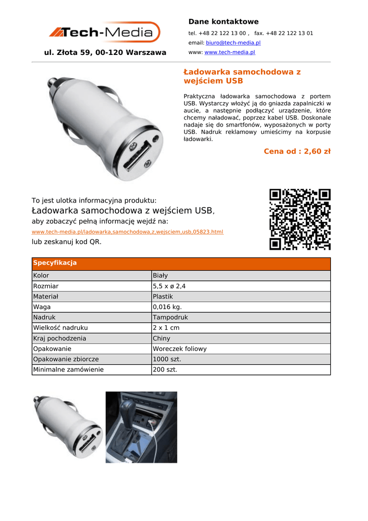 Dane kontaktowe tel. +48 22 122 13 00 , fax. +48 22 122 13 01 email: [email protected] ul. Złota 59, 00-120 Warszawa www: www.tech-media.pl Ładowarka samochodowa z wejściem USB Praktyczna ładowarka samochodowa z portem USB. Wystarczy włożyć ją do gniazda zapalniczki w aucie, a następnie podłączyć urządzenie, które chcemy naładować, poprzez kabel USB. Doskonale nadaje się do smartfonów, wyposażonych w porty USB. Nadruk reklamowy umieścimy na korpusie ładowarki. Cena od : 2,60 zł To jest ulotka informacyjna produktu: Ładowarka samochodowa z wejściem USB , aby zobaczyć pełną informację wejdź na: www.tech-media.pl/ladowarka,samochodowa,z,wejsciem,usb,05823.html lub zeskanuj kod QR. Specyfikacja Kolor Biały Rozmiar 5,5 x ø 2,4 Materiał Plastik Waga 0,016 kg. Nadruk Tampodruk Wielkość nadruku 2 x 1 cm Kraj pochodzenia Chiny Opakowanie Woreczek foliowy Opakowanie zbiorcze 1000 szt. Minimalne zamówienie 200 szt.