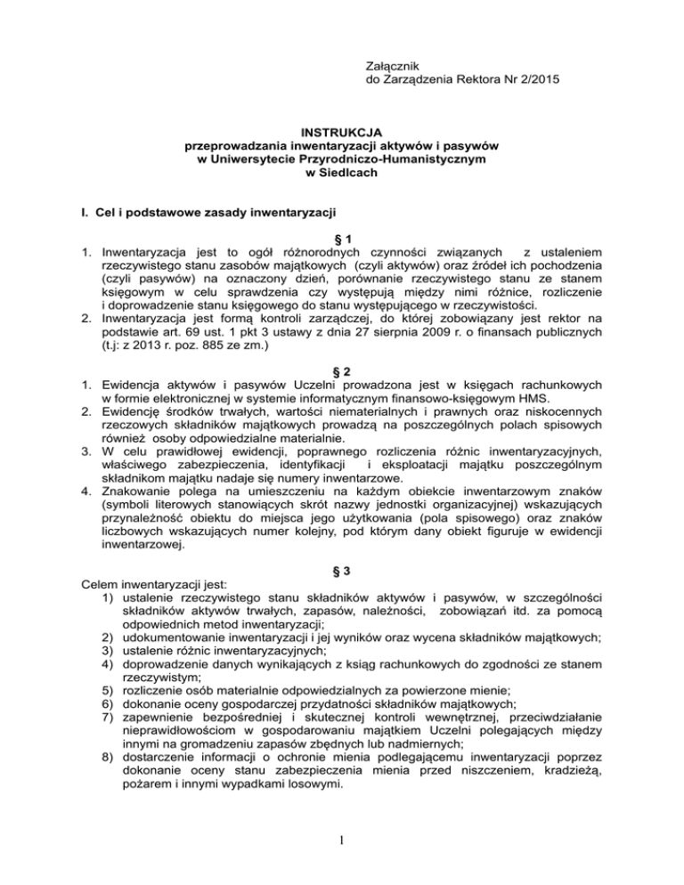 Załącznik do Zarządzenia Rektora Nr 2/2015 INSTRUKCJA przeprowadzania inwentaryzacji aktywów i pasywów w Uniwersytecie Przyrodniczo-Humanistycznym w Siedlcach I. Cel i podstawowe zasady inwentaryzacji §1 1. Inwentaryzacja jest to ogół różnorodnych czynności związanych z ustaleniem rzeczywistego stanu zasobów majątkowych (czyli aktywów) oraz źródeł ich pochodzenia (czyli pasywów) na oznaczony dzień, porównanie rzeczywistego stanu ze stanem księgowym w celu sprawdzenia czy występują między nimi różnice, rozliczenie i doprowadzenie stanu księgowego do stanu występującego w rzeczywistości. 2. Inwentaryzacja jest formą kontroli zarządczej, do której zobowiązany jest rektor na podstawie art. 69 ust. 1 pkt 3 ustawy z dnia 27 sierpnia 2009 r. o finansach publicznych (t.j: z 2013 r. poz. 885 ze zm.) §2 1. Ewidencja aktywów i pasywów Uczelni prowadzona jest w księgach rachunkowych w formie elektronicznej w systemie informatycznym finansowo-księgowym HMS. 2. Ewidencję środków trwałych, wartości niematerialnych i prawnych oraz niskocennych rzeczowych składników majątkowych prowadzą na poszczególnych polach spisowych również osoby odpowiedzialne materialnie. 3. W celu prawidłowej ewidencji, poprawnego rozliczenia różnic inwentaryzacyjnych, właściwego zabezpieczenia, identyfikacji i eksploatacji majątku poszczególnym składnikom majątku nadaje się numery inwentarzowe. 4. Znakowanie polega na umieszczeniu na każdym obiekcie inwentarzowym znaków (symboli literowych stanowiących skrót nazwy jednostki organizacyjnej) wskazujących przynależność obiektu do miejsca jego użytkowania (pola spisowego) oraz znaków liczbowych wskazujących numer kolejny, pod którym dany obiekt figuruje w ewidencji inwentarzowej. §3 Celem inwentaryzacji jest: 1) ustalenie rzeczywistego stanu składników aktywów i pasywów, w szczególności składników aktywów trwałych, zapasów, należności, zobowiązań itd. za pomocą odpowiednich metod inwentaryzacji; 2) udokumentowanie inwentaryzacji i jej wyników oraz wycena składników majątkowych; 3) ustalenie różnic inwentaryzacyjnych; 4) doprowadzenie danych wynikających z ksiąg rachunkowych do zgodności ze stanem rzeczywistym; 5) rozliczenie osób materialnie odpowiedzialnych za powierzone mienie; 6) dokonanie oceny gospodarczej przydatności składników majątkowych; 7) zapewnienie bezpośredniej i skutecznej kontroli wewnętrznej, przeciwdziałanie nieprawidłowościom w gospodarowaniu majątkiem Uczelni polegających między innymi na gromadzeniu zapasów zbędnych lub nadmiernych; 8) dostarczenie informacji o ochronie mienia podlegającemu inwentaryzacji poprzez dokonanie oceny stanu zabezpieczenia mienia przed niszczeniem, kradzieżą, pożarem i innymi wypadkami losowymi. 1 §4 W celu przeprowadzenia prawidłowej, rzetelnej i wiarygodnej inwentaryzacji należy przestrzegać niżej wymienionych zasad: 1) zasady terminowości i częstotliwości – polegającej na przeprowadzeniu inwentaryzacji w terminach zgodnych z planem i z zachowaniem częstotliwości wymaganej ustawą o rachunkowości, umożliwiających w sposób harmonijny przygotowanie rocznego zamknięcia ksiąg rachunkowych; 2) zasady podwójnej kontroli – polegającej na pomiarze składników majątkowych przez dwie osoby w celu wyeliminowania ewentualnych niedokładności w liczeniu i uzyskaniu pewności, że składniki majątkowe zostały policzone zgodnie ze stanem faktycznym; 3) zasady tzw. „zamkniętych drzwi” – polegającej na dokonywaniu spisu, o ile to możliwe, przy zamkniętych drzwiach, co oznacza, że w czasie inwentaryzacji nie dokonuje się obrotu magazynowego; 4) zasady kompletności i kompleksowości – polegającej na objęciu spisem wszystkich składników majątkowych, objętych ewidencją bilansową, jak i nieobjętych tą ewidencją, a będących na stanie. Ma ona zastosowanie szczególnie w czasie inwentaryzacji zdawczo-odbiorczych; 5) zasady kolejnych czynności – polegającej na określeniu kolejnych prac w czasie inwentaryzacji, co przyczynia się do usprawnienia spisu i skrócenia go w czasie; 6) zasady uczestnictwa w spisie osoby materialnie odpowiedzialnej; 7) zasady komisyjności – polegającej na przeprowadzaniu spisów z natury przez co najmniej dwie osoby, co zwiększa wiarygodność i niepodważalność spisów. II. Metody (sposoby) przeprowadzania inwentaryzacji §5 W zależności od charakteru składników aktywów i pasywów inwentaryzację przeprowadza się następującymi metodami (sposobami): 1) spisu z natury: a) ręcznie na arkuszach spisowych, b) drogą elektronicznej identyfikacji - przy użyciu czytnika kodów kreskowych; 2) uzgodnienia sald z bankami, dostawcami, odbiorcami oraz innymi kontrahentami; 3) weryfikacji danych polegającej na porównaniu stanu wynikającego z ksiąg rachunkowych z danymi wynikającymi z dokumentów. §6 1. Spis z natury dokonywany jest na podstawie bezpośredniego, naocznego stwierdzenia przez zespół spisowy fizycznego istnienia ilości spisywanych składników w drodze ich przeliczenia, przeważenia, przemierzenia, obliczenia technicznego lub oszacowania. Tak stwierdzona w dniu spisu ilość składników jest wpisana przez członka zespołu spisowego do arkusza spisowego. 2. Metodą spisu z natury ustala się stan następujących składników aktywów: 1) papierów wartościowych w postaci materialnej tj. weksli, bonów, czeków i innych papierów wartościowych; 2) rzeczowych składników aktywów obrotowych tj. materiałów w magazynach, gotowych produktów (wydawnictwa własne), druków ścisłego zarachowania znajdujących się na składach, materiałów w przerobie itp.; 3) nieruchomości zaliczanych do środków trwałych oraz inwestycji (budynki, budowle); 4) środków trwałych oraz maszyn i urządzeń wchodzących w skład „środków trwałych w budowie” z wyjątkiem środków trwałych, do których dostęp jest znacznie utrudniony; 5