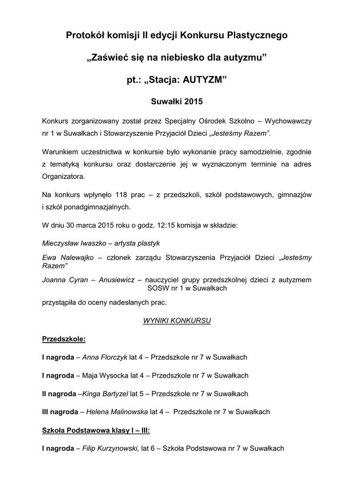 Protokół komisji II edycji Konkursu Plastycznego „Zaświeć się na niebiesko dla autyzmu” pt.: „Stacja: AUTYZM” Suwałki 2015 Konkurs zorganizowany został przez Specjalny Ośrodek Szkolno – Wychowawczy nr 1 w Suwałkach i Stowarzyszenie Przyjaciół Dzieci „Jesteśmy Razem”. Warunkiem uczestnictwa w konkursie było wykonanie pracy samodzielnie, zgodnie z tematyką konkursu oraz dostarczenie jej w wyznaczonym terminie na adres Organizatora. Na konkurs wpłynęło 118 prac – z przedszkoli, szkół podstawowych, gimnazjów i szkół ponadgimnazjalnych. W dniu 30 marca 2015 roku o godz. 12:15 komisja w składzie: Mieczysław Iwaszko – artysta plastyk Ewa Nalewajko – członek zarządu Stowarzyszenia Przyjaciół Dzieci „Jesteśmy Razem” Joanna Cyran – Anusiewicz – nauczyciel grupy przedszkolnej dzieci z autyzmem SOSW nr 1 w Suwałkach przystąpiła do oceny nadesłanych prac. WYNIKI KONKURSU Przedszkole: I nagroda – Anna Florczyk lat 4 – Przedszkole nr 7 w Suwałkach I nagroda – Maja Wysocka lat 4 – Przedszkole nr 7 w Suwałkach II nagroda –Kinga Bartyzel lat 5 – Przedszkole nr 7 w Suwałkach III nagroda – Helena Malinowska lat 4 – Przedszkole nr 7 w Suwałkach Szkoła Podstawowa klasy I – III: I nagroda – Filip Kurzynowski, lat 6 – Szkoła Podstawowa nr 7 w Suwałkach II nagroda – Natalia Poulakowska, lat 9 – Szkoła Podstawowa nr 6 im. Aleksandry Kujałowicz w Suwałkach II nagroda – Adam Jasionowski, lat 8 – Szkoła Podstawowa nr 6 im. Aleksandry Kujałowicz w Suwałkach III nagroda – Michalina Szelipowska, lat 9 – Szkoła Podstawowa nr 6 im. Aleksandry Kujałowicz w Suwałkach III nagroda – Kacper Czerniawski, lat 9 – Szkoła Podstawowa nr 6 im. Aleksandry Kujałowicz w Suwałkach Wyróżnienie: Klasa 2 a Szkoły Podstawowej SOSW nr 1 w Suwałkach Szkoła Podstawowa klasy IV – VI: I nagroda – Dagna Pawlik, lat 13 – Innowacyjny Zespół Edukacyjno – Terapeutyczny ZSzS nr 3 w Bytomiu II nagroda – Patrycja Wojsznis, lat 12 – Szkoła Podstawowa nr 2 im. Aleksandry Piłsudskiej w Suwałkach II nagroda – Dominika Nowak, 15 lat - Innowacyjny Zespół Edukacyjno – Terapeutyczny ZSzS nr 3 w Bytomiu III nagroda – Emilia Bydłowska lat 14 – Innowacyjny Zespół Edukacyjno – Terapeutyczny ZSzS nr 3 w Bytomiu III nagroda – Filip Lewicki lat 12 – Innowacyjny Zespół Edukacyjno – Terapeutyczny ZSzS nr 3 w Bytomiu Gimnazjum i szkoły ponadgimnazjalne: I nagroda – Katarzyna Trusiło, lat 14 Zespół Szkół nr 10, Gimnazjum nr 7 w Suwałkach II nagroda – Natalia Gałażyn lat 13 – Zespół Szkół nr 10 Gimnazjum nr 7 w Suwałkach III nagroda – Sylwia Franke lat 16 – Zespół Szkół nr 10, Gimnazjum nr 7 w Suwałkach Wyróżnienie: Uczniom klas 3PB i 3PC Szkoły Przysposabiającej do Pracy w SOSW nr 1 w Suwałkach: