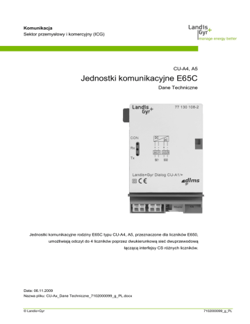 Komunikacja Sektor przemysłowy i komercyjny (ICG) CU-A4, A5 Jednostki komunikacyjne E65C Dane Techniczne Jednostki komunikacyjne rodziny E65C typu CU-A4, A5, przeznaczone dla liczników E650, umożliwiają odczyt do 4 liczników poprzez dwukierunkową sieć dwuprzewodową łączącą interfejsy CS różnych liczników. Data: 06.11.2009 Nazwa pliku: CU-Ax_Dane Techniczne_7102000099_g_PL.docx © Landis+Gyr 7102000099_g_PL 2/4 E65C CU-A4, A5 – Specyfikacja Techniczna Wykonania Interfejs CS Przegląd typów Typ CS Interfejs szeregowy, dwukierunkowy, prądowy do zastosowań w prostych systemach AMR (automatic meter reading), np. z kilkoma licznikami połączonymi razem w pętli. CU-A4 RS232 CU-A5 Obsługiwane protokoły komunikacji - IEC 62056-21 i dlms Instalacja i wykorzystanie bezpośrednio w liczniku (ZxD300/400xT lub ZxQ) Interfejs RS232 Dostępny tylko dla wersji CU-A5 Interfejs asymetryczny, szeregowy, asynchroniczny, dwukierunkowy - wersja 3-przewodowa, bazowa do użytku tylko z zewnętrznymi modemami z wbudowanym zaawansowanym sterowaniem - wersja 6-przewodowa, rozszerzona do użytku z dowolnym modemem zewnętrznym, z możliwością jego sterowania i inicjalizacji Warunki pracy Standard DIN 66256 Złącza stykowe, wersja 3-przewodowa (bazowa) - TxD (Transmisja Danych) - RxD (Odbiór Danych) - GND (Masa) Warunki pracy Standard IEC61107 / DIN 66258 Napięcie znamionowe 24 V DC Napięcie maksymalne 30 V DC Prąd nadajnika - Stan "Wł" min. 11 mA, typowo 20 mA, maks. 30 mA - Stan "Wył" maks. 2.5 mA Prąd odbiornika - Stan "Wł" min. 9 mA, typowo 20 mA, maks. 30 mA - Stan "Wył" maks. 3 mA Maks. prędkość transmisji typowo 9600 bps Maks. długość linii zależna od otoczenia i kabla Wpływ czynników zewnętrznych Ogólnie taki sam jak dla licznika bazowego Wyjątek: zakres temperatur pracy –20°C do +55°C Odporność izolacji względem licznika Wytrzymałość izolacji Odstęp izolacyjny 4 kV dla 50 Hz przez 1 min co najmniej 6.3 mm Waga i wymiary Waga około 80 g Szerokość/Wysokość/Głębokość 65 / 103 / 38 mm Złącza stykowe, wersja 6-przew. (rozszerzona) - TxD (Transmisja Danych) - RxD (Odbiór Danych) - GND (Masa) - CTS (Gotowość do transmisji) - DTR (Gotowość terminala danych) - DSR (Gotowość do pobrania danych) Napięcie znamionowe ± 12 V DC Napięcie maksymalne ± 25 V DC Maksymalna prędkość transmisji 56 kbps Maksymalna długość linii do 15 m Podłączenia Połączenie z licznikiem przez 10-stykowe złącze dla podłączenia zasilania i połączenia z wewnętrzną szyną danych licznika oraz 4-stykowy wtyk dla podłączenia uziemienia Dodatkowe funkcje (wersja 6-przewodowa) - Inicjalizacja modemu poleceniami AT - Okresowa inicjalizacja (zerowanie) modemu - Sterowanie przepływem (sygnały DTR i CTS) - Okno czasowe z możliwością współużytkowania linii telefonicznej - Odbieranie połączeń - Programowana liczba sygnałów dzwonienia © Landis+Gyr 7102000099_g_PL — Jednostki komunikacyjne E65C — Dane Techniczne 3/4 Materiał Obudowa tworzywo poliwęglanowe Schemat podłączeń RS232 (wersja podstawowa) TxD GND RxD Transmisja Danych Masa sygnału Odbiór Danych RS232/+ (wersja rozszerzona) CTS Gotowość do transmisji TxD Transmisja Danych GND Masa sygnału DTR Gotowość terminala danych RxD Odbiór Danych DSR Gotowość do pobrania danych CS CS+ CS− Modem telefoniczny z wejściem CS jest podłączony przez interfejs CS. Jeśli jest dostępny interfejs RS232, to można go użyć np. do lokalnej transmisji danych. Komunikacja przez modem GSM (np. MetcomT) podłączenie + podłączenie − Przykład CU-A4 CS + - CS 23 24 Modem GSM (np. Metcom T) jest podłączony przez interfejs RS232. Jeśli jest dostępny interfejs CS, to można go użyć np. do lokalnej transmisji danych. Typowe zastosowania (przykłady) Komunikacja przez modem telefoniczny (PSTN) Modem telefoniczny podłączony jest przez interfejs RS232. Jeśli jest dostępny interfejs CS, to można go użyć np. do lokalnej transmisji danych. 7102000099_g_PL – Jednostki komunikacyjne E65C – Dane Techniczne Modem GSM (np. Metcom T) jest podłączony przez interfejs CS. Jeśli jest dostępny interfejs RS232, to można go użyć np. do lokalnej transmisji danych. © Landis+Gyr 4/4 Odczyt sieci wielolicznikowej (do 4 liczników) Jednostki komunikacyjne typu CU-Ax pozwalają na odczyt sieci licznikowej składającej się z maks. 4 liczników przez dwukierunkową, 2-przewodową szynę, która łączy interfejsy CS poszczególnych liczników. Istnieją rozwiązania pozwalające w razie potrzeby na połączenie w jedną sieć większej liczby liczników. Wszystkie połączone ze sobą liczniki wykorzystują interfejs CS do komunikacji z modemem PSTN lub GSM. Jeśli w liczniku jest dostępny interfejs RS232, to można go użyć np. do lokalnej transmisji danych. Użycie dwukierunkowej, 2-przewodowej szyny do połączenia interfejsów CS różnych liczników ma tę zaletę, że dowolny licznik wyposażony już w interfejs CS (np. licznik Landis+Gyr serii ZxB…) można łatwo podłączyć do wielo-licznikowej sieci odczytu. Odczyt sieci wielolicznikowej przez modem (PSTN) Odczyt wielu liczników przez GSM (np. MetcomT) Pokazana tu konfiguracja jest praktycznie identyczna z przedstawioną na poprzednim rysunku, z tym że zamiast modemu PSTN użyto w tym przypadku modem GSM (np. MetcomT). Objaśnienie użytych symboli Opcjonalny kanał transmisji danych na potrzeby lokalne Modem telefoniczny PSTN (Public Service Telephone Network) sieci telefonii komutowanej MetcomT - Produkt Landis+Gyr - inteligentny modem GSM z interfejsem RS232 lub CS W przedstawionej powyżej konfiguracji wszystkie liczniki używają swój interfejs CS do komunikacji z modemem PSTN. Ponieważ interfejsy CS jednostek komunikacyjnych CU-Ax są pasywne, pętla prądowa musi być zasilana z interfejsu CS modemu PSTN. Copyright © Landis+Gyr. Wszystkie prawa zastrzeżone. Zastrzega się możliwość zmian danych technicznych bez 