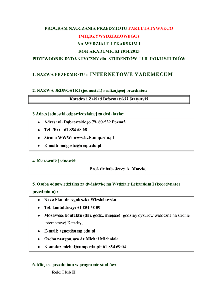 PROGRAM NAUCZANIA PRZEDMIOTU FAKULTATYWNEGO (MIĘDZYWYDZIAŁOWEGO) NA WYDZIALE LEKARSKIM I ROK AKADEMICKI 2014/2015 PRZEWODNIK DYDAKTYCZNY dla STUDENTÓW I i II ROKU STUDIÓW 1. NAZWA PRZEDMIOTU : INTERNETOWE VADEMECUM 2. NAZWA JEDNOSTKI (jednostek) realizującej przedmiot: Katedra i Zakład Informatyki i Statystyki 3 Adres jednostki odpowiedzialnej za dydaktykę: Adres: ul. Dąbrowskiego 79, 60-529 Poznań Tel. /Fax 61 854 68 08 Strona WWW: www.kzis.ump.edu.pl E-mail: [email protected] 4. Kierownik jednostki: Prof. dr hab. Jerzy A. Moczko 5. Osoba odpowiedzialna za dydaktykę na Wydziale Lekarskim I (koordynator przedmiotu) : Nazwisko: dr Agnieszka Wiesiołowska Tel. kontaktowy: 61 854 68 09 Możliwość kontaktu (dni, godz., miejsce): godziny dyżurów widoczne na stronie internetowej Katedry; E-mail: [email protected] Osoba zastępująca dr Michał Michalak Kontakt: [email protected]; 61 854 69 04 6. Miejsce przedmiotu w programie studiów: Rok: I lub II Semestr: 2 - 4 7. Liczba godzin ogółem : 15 (5spotkań*3h) Jednostki uczestniczące w nauczaniu przedmiotu liczba pkt.ECTS: 1 Semestr zimowy lub letni liczba godzin W Ć Ćwiczenia S kategoria 15 A Katedra i Zakład Informatyki i Statystyki 8. Zakres wiedzy: (zgodnie z Rozporządzeniem Ministra Nauki i Szkolnictwa Wyższego z dnia 9 maja 2012 r. w sprawie standardów kształcenia dla kierunków Studiów: lekarskiego) 9. Umiejętności: (zgodnie z Rozporządzeniem Ministra Nauki i Szkolnictwa Wyższego z dnia 9 maja 2012 r. w sprawie standardów kształcenia dla kierunków Studiów: lekarskiego) D.U15. wykazuje odpowiedzialność za podnoszenie swoich kwalifikacji i przekazywanie wiedzy innym; D.U16. rozpoznaje własne ograniczenia, dokonuje samooceny deficytów i potrzeb edukacyjnych, planuje własną aktywność edukacyjną; 10 . SYLABUS 11. Tematyka poszczególnych wykładów, ćwiczeń i seminariów Ćwiczenia - Semestr zimowy Tematyka ćwiczeń Ćwiczenie 2. Ćwiczenie 3. Sposoby dostępu do sieci, podstawowe pojęcia (klient-serwer, protokoły, …) Sprzęt i oprogramowanie niezbędne do połączenia z Internetem. Istota WWW (ang. World Wide Web). Aktualne wykorzystywane technologie internetowe. Zastosowanie podstawowych narzędzi internetowych. Zagrożenia (programowe i fizyczne) oraz ochrona przed nimi. Wady i zalety dostępu do sieci Internet. Dziesięć zasad internauty. Oprogramowanie zabezpieczające – darmowe i komercyjne (antywirusy, antyspyware), cookies, spam. Przeglądarki stron WWW – najważniejsze funkcje wyszukiwania informacji. Poczta str. 2 Pracownik dydaktyczny prowadzący zajęcia z grupą ćwiczeniową Ćwiczenie 1. Osoba odpowiedzialna elektroniczna, fora oraz listy dyskusyjne, komunikatory. Przykazywanie plików – serwery FTP, P2P. Tworzenie witryn internetowych z wykorzystaniem darmowych narzędzi do wizualizacji obiektowej – część 1. Tworzenie witryn internetowych z Ćwiczenie 4. wykorzystaniem darmowych narzędzi do wizualizacji obiektowej – część 2. Tworzenie witryn internetowych z Ćwiczenie 5. wykorzystaniem darmowych narzędzi do wizualizacji obiektowej – część 3. 11. Organizacja zajęć: Aktualny podział grupy studenckiej na stronie internetowej jednostki : www.kzis.ump.edu.pl REGULAMIN ZAJĘĆ: 1. Dla studentów I lub II roku Wydziału Lekarskiego I zajęcia odbywają się w semestrze zimowym lub letnim i obejmują: a) 15 godzin ćwiczeń w laboratorium komputerowym 2. Obecność studentów na ćwiczeniach jest obowiązkowa i kontrolowana. 3. Nieobecność na zajęciach kontrolowanych musi być usprawiedliwiona i odrobiona w terminie ustalonym indywidualnie z prowadzącym zajęcia, lecz nie później niż przed kolokwium zaliczeniowym. Nie odrobienie zajęć kontrolowanych powoduje niedopuszczenie do kolokwium, co jest jednoznaczne z otrzymaniem oceny niedostatecznej. 4. Warunkiem uzyskania zaliczenia z przedmiotu INTERNETOWE VADEMECUM jest: a) obecność i aktywność na wszystkich zajęciach kontrolowanych b) zaliczenie kolokwium obejmującego całość materiału przerobionego na ćwiczeniach. Nieusprawiedliwiona nieobecność na zaliczeniu jest równoznaczna z otrzymaniem oceny niedostatecznej. W przypadku otrzymania oceny niedostatecznej istnieje możliwość dwukrotnego jej poprawienia 5. W wyjątkowych przypadkach kierownik Katedry może wyrazić zgodę na przeprowadzenie jednego dodatkowego kolokwium z całości lub z wybranej części materiału. 6. Spóźnienia na zajęciach kontrolowanych przekraczające 15 minut traktowane są jako nieobecność 7. Z racji charakteru przerabianego materiału studentów obowiązuje bieżąca znajomość materiału przerabianego na zajęciach kontrolowanych. 8. Na ostatnich zajęciach, studenci wypełniają anonimową ankietę, dotyczącą odbytych zajęć, na stronie internetowej katedry: www.kzis.ump.edu.pl (Dydaktyka Ankieta) PROGRAM ZAJĘĆ: str. 3 Podstawowe pojęcia teoretyczne. Sposoby dostępu do sieci, podstawowe pojęcia (klient-serwer, protokoły itd.). Sprzęt i oprogramowanie niezbędne do połączenia się z Internetem. Istota WWW (ang. World Wide Web). Aktualne wykorzystywane technologie internetowe. Zastosowanie podstawowych narzędzi internetowych. Możliwości dostępu do sieci oraz sposoby umiejętnego korzystania z jego dobrodziejstw. Zagrożenia (programowe i fizyczne) oraz ochrona przed nimi. Wady i zalety dostępu do sieci Internet. Dziesięć zasad internauty. Ćwiczenia praktyczne: Przeglądarki stron WWW (najważniejsze funkcje przeglądarek, wyszukiwanie informacji w sieci na zadany temat). Tworzenie witryn internetowych z wykorzystaniem darmowych narzędzi do wizualizacji obiektowej. Poczta elektroniczna, fora oraz listy dyskusyjne, komunikatory. Przekazywanie plików – serwery FTP, P2P. Oprogramowanie zabezpieczające – darmowe i komercyjne (antywirusy, antyspyware), cookies, spam. PROGRAM NAUCZANIA Wymagania wstępne : brak Przygotowanie do zajęć: znajomość problemów poznanych na dotychczasowych