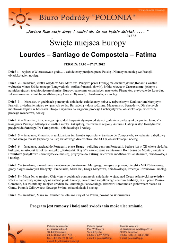„Powierz Panu swoją drogę i zaufaj Mu: On sam będzie działał.......” Ps.37,5 Święte miejsca Europy Lourdes – Santiago de Compostela – Fatima TERMIN: 29.06 – 07.07. 2012 Dzień 1 – wyjazd z Wieruszowa o godz...... całodzienny przejazd przez Polskę i Niemcy na nocleg we Francji, obiadokolacje i nocleg. Dzień 2 – śniadanie, krótka wizyta w Ars, Msza św,. Przejazd przez Francję malowniczą doliną Rodanu i wzdłuŜ wybrzeŜa Morza Śródziemnego (Langwedocja- stolica francuskich win), krótka wizyta w Carcassonne- jednym z najpiękniejszych średniowiecznych miast Europy, panorama wspaniałych masywów Pirenejów, przybycie do Lourdes, zakwaterowanie w hotelu, modlitwa przy Grocie Objawień, obiadokolacja i nocleg. Dzień 3 – Msza św. w godzinach porannych, śniadanie, całodzienny pobyt w największym Sanktuarium Maryjnym Francji, zwiedzanie miejsc związanych ze św. Bernadettą – dom rodzinny, Muzeum św. Bernadetty. Dla chętnych moŜliwość kąpieli w basenach. Droga KrzyŜowa na wzgórzu, procesja Eucharystyczna, obiadokolacja, wieczorna procesja róŜańcowa, nocleg. Dzień 4 – Msza św., śniadanie, przejazd do Hiszpanii słynnym od stuleci „szlakiem pielgrzymkowym św. Jakuba” trasą przez Pireneje Atlantyckie wzdłuŜ zatoki Biskajskiej, malownicze regiony Asturia i Galicja u stóp Kordylierów, przyjazd do Santiago De Compostela, obiadokolacja i nocleg. Dzień 5 – śniadanie, Msza św. w sanktuarium św. Jakuba Apostoła w Santiago de Compostela, zwiedzanie: zabytkowy zespół starego miasta (wpisany na listę światowego dziedzictwa UNESCO), obiadokolacja i nocleg. Dzień 6 – śniadanie, przejazd do Portugalii, przez Bragę – religijne centrum Portugalii, będące juŜ w XII wieku siedzibą biskupią, miasto jest teŜ określane jako „Portugalski Rzym” i nawiedzenie sanktuarium Bom Jesus do Monte , wizyta w Coimbrze (zabytkowe uniwersyteckie miasto), przybycie do Fatimy, wieczorna modlitwa w Sanktuarium, obiadokolacja i nocleg. Dzień 7 – śniadanie, nawiedzenie narodowego Sanktuarium Maryjnego: miejsce objawień, Bazylika MB RóŜańcowej, groby błogosławionych Hiacynty i Franciszka, Msza św., Droga KrzyŜowa, obiadokolacja, Procesja RóŜańcowa i nocleg. Dzień 8 – Msza św. w miejscu Objawień w godzinach porannych, śniadanie, wyjazd nad Ocean Atlantycki: przylądek Roca – najbardziej wysunięty na zachód punkt Europy, zwiedzanie zabytkowego centrum Lizbony, m.in. place Rossio i Comercio, łuk triumfalny, miejsce urodzin św. Antoniego Padewskiego, klasztor Hieronimos z grobowcem Vasco da Gamy, Pomnik Odkrywców Nowego Świata, obiadokolacja i nocleg. Dzień 9 – śniadanie, Msza św. transfer na lotnisko i wylot do Polski, powrót do Wieruszowa Program jest ramowy i kolejność zwiedzania moŜe ulec zmianie. W ramach ceny zapewnione są nast. świadczenia: Przejazdy klimatyzowanym autokarem, noclegi hotele, pokoje 2-os, śniadania i obiadokolacje, ubezpieczenie KL + NNW, opieka pilota na trasie, transfer z lotniska, przelot samolotem z Portugalii do Polski. Cena: 2150 PLN + 380 € dodatkowo na bilety wstępów proszę przygotować 60 € INFORMACJE I ZGŁOSZENIA: Ks. Karol Galewski oraz Biuro PodróŜy „POLONIA” tel. 062 78 41 513, 062 78 31 770, 515 602 707 e-mail:[email protected]