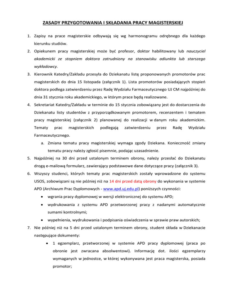ZASADY PRZYGOTOWANIA I SKŁADANIA PRACY MAGISTERSKIEJ 1. Zapisy na prace magisterskie odbywają się wg harmonogramu odrębnego dla każdego kierunku studiów. 2. Opiekunem pracy magisterskiej może byd profesor, doktor habilitowany lub nauczyciel akademicki ze stopniem doktora zatrudniony na stanowisku adiunkta lub starszego wykładowcy. 3. Kierownik Katedry/Zakładu przesyła do Dziekanatu listę proponowanych promotorów prac magisterskich do dnia 15 listopada (załącznik 1). Lista promotorów posiadających stopieo doktora podlega zatwierdzeniu przez Radę Wydziału Farmaceutycznego UJ CM najpóźniej do dnia 31 stycznia roku akademickiego, w którym prace będą realizowane. 4. Sekretariat Katedry/Zakładu w terminie do 15 stycznia zobowiązany jest do dostarczenia do Dziekanatu listy studentów z przyporządkowanym promotorem, recenzentem i tematem pracy magisterskiej (załącznik 2) planowanej do realizacji w danym roku akademickim. Tematy prac magisterskich podlegają zatwierdzeniu przez Radę Wydziału Farmaceutycznego. a. Zmiana tematu pracy magisterskiej wymaga zgody Dziekana. Koniecznośd zmiany tematu pracy należy zgłosid pisemnie, podając uzasadnienie. 5. Najpóźniej na 30 dni przed ustalonym terminem obrony, należy przesład do Dziekanatu drogą e-mailową formularz, zawierający podstawowe dane dotyczące pracy (załącznik 3). 6. Wszyscy studenci, których tematy prac magisterskich zostały wprowadzone do systemu USOS, zobowiązani są nie później niż na 14 dni przed datą obrony do wykonania w systemie APD (Archiwum Prac Dyplomowych - www.apd.uj.edu.pl) poniższych czynności: wgrania pracy dyplomowej w wersji elektronicznej do systemu APD; wydrukowania z systemu APD przetworzonej pracy z nadanymi automatycznie sumami kontrolnymi; wypełnienia, wydrukowania i podpisania oświadczenia w sprawie praw autorskich; 7. Nie później niż na 5 dni przed ustalonym terminem obrony, student składa w Dziekanacie następujące dokumenty: 1 egzemplarz, przetworzonej w systemie APD pracy dyplomowej (praca po obronie jest zwracana absolwentowi). Informację dot. ilości egzemplarzy wymaganych w jednostce, w której wykonywana jest praca magisterska, posiada promotor; oświadczenie w sprawie praw autorskich (do pobrania z systemu APD); oceny pracy magisterskiej (wypełnione przez Promotora i Recenzenta). 8. Podstawą zaliczenia dwiczeo specjalistycznych jest zatwierdzenie przez promotora: pracy magisterskiej w systemie APD oraz wpisanie w USOSWeb zaliczenia z przedmiotu Ćwiczenia specjalistyczne z metodologią badao naukowych. 9. Opiekun pracy i recenzent dokonują oceny pracy dyplomowej w systemie APD nie później niż 3 dni przed planowanym terminem obrony. STANDARDY PRACY MAGISTERSKIEJ Strona tytułowa pracy magisterskiej Na stronie tytułowej powinny znaleźd się informacje dotyczące: uczelni, kierunku studiów, jednostki w której wykonano pracę, tytułu pracy, imienia i nazwiska autora, imienia i nazwiska oraz stopnia/tytułu naukowego promotora i (opcjonalnie) kierownika naukowego pracy, miejsce i rok wykonania pracy. Na stronie tytułowej można umieścid również oficjalne godło UJ (załącznik 4). Wymogi formalne dotyczące pracy magisterskiej: I. Układ pracy magisterskiej o charakterze poglądowym lub przeglądowym: 1. Strona tytułowa 2. Streszczenie w języku polskim i angielskim 3. Objaśnienia skrótów (opcjonalnie) 4. Spis treści 5. Wstęp 6. Cel pracy 7. Częśd teoretyczna, czyli studium o charakterze teoretycznym 8. Podsumowanie i wnioski 9. Piśmiennictwo 10. Załączniki (aneksy), w tym spisy tabel, rycin, rysunków, zdjęd II. Układ pracy magisterskiej o charakterze eksperymentalnym : 1. Strona tytułowa 2. Streszczenie w języku polskim i angielskim 3. Objaśnienia skrótów (opcjonalnie) 4. Spis treści 5. Wstęp (częśd teoretyczna, określenie przesłanek) 6. Cel pracy 7. Częśd eksperymentalna (materiały, aparatura, obliczenia statystyczne itp.,metodyka badao) 8. Wyniki i dyskusja badao 9. Podsumowanie i wnioski 10. Piśmiennictwo 11. Załączniki (aneksy), w tym spisy tabel, rycin, rysunków, zdjęd III. Tekst pracy magisterskiej Tekst pracy powinien byd podzielony na: punkty i podpunkty, lub rozdziały i podrozdziały oraz akapity. Wyróżnienia tytułów (dotyczących punktów i podpunktów, lub rozdziałów i podrozdziałów) powinny byd stosowane jednolicie w całej pracy, bez stosowania jakichkolwiek skrótów. W przypadku wielostopniowego podziału tekstu, kolejnośd i hierarchię jego części można zaznaczyd numeracją wielorzędową (tzw. dziesiętną lub numeryczną, np. 5., 5.1., 5.1.1. itd.), lub numeracją cyfrowo-literową (układ alfabetyczno numeryczny, np. 5., 5a. itd.), ewentualnie mieszaną (tzn. główne punkty lub rozdziały znaczy się cyframi rzymskimi, a podpunkty lub podrozdziały cyframi arabskimi). IV. Streszczenie Streszczenie w języku polskim i angielskim powinno zawierad zwięzły opis pracy obejmujący co najmniej cel pracy, jej wyniki oraz podsumowanie i wnioski. Dopuszczalna liczba słów dla każdej z wersji językowych wynosi 250. V. Skróty Zastosowane skróty oraz terminy naukowe wymagające rozwinięcia powinny byd objaśnione w tekście przy pierwszym ich użyciu. W pracy należy zamieścid wykaz używanych skrótów (przed spisem treści). VI. Piśmiennictwo W tekście należy umieścid w nawiasach kwadratowych numer pozycji piśmiennictwa, zgodnie ze spisem umieszczanym na koocu pracy. Pozycje piśmiennictwa należy ująd w porządku alfabetycznym. W pozycji piśmiennictwa należy zawrzed następujące informacje: nazwisko autora/autorów i jego inicjały, tytuł artykułu, tytuł czasopisma (skrót), numer (volumen), strony, rok; w przypadku podręczników: nazwisko autora/autorów i jego inicjały, tytuł rozdziału/tytuł książki, imię i nazwisko redaktora/redaktorów, wydawnictwo, numer wydania, rok wydania. Przykłady: 1. George CJ., Jacobs LG.: A novel approach to teaching rational p