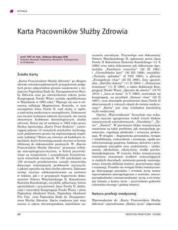 ETYKA Karta Pracowników Służby Zdrowia prof. PAT dr hab. Tadeusz Biesaga SDB Katedra Bioetyki Papieskiej Akademii Teologicznej w Krakowie Źródła Karty „Karta Pracowników Służby Zdrowia” po długim okresie interdyscyplinarnych przygotowań podjętych przez odpowiednie gremia naukowców z inicjatywy Papieskiej Rady ds. Duszpasterstwa Służby Zdrowia oraz po zatwierdzeniu tekstu przez Kongregację Nauki Wiary została opublikowana w Watykanie w 1995 roku.1 Wpisuje się ona w obszerną refleksję Magisterium Kościoła, w tym szczególnie Jana Pawła II, nad etyką w ogóle, a nad etyką medyczną w szczególności. Dokument ten nie jest wykazem zaleceń etycznych, ale raczej obszernym kodeksem deontologicznym służby zdrowia. Różni się od wydanej w 1983 roku przez Stolicę Apostolską „Karty Praw Rodziny”, zawierającej jedynie 12 zwięzłych artykułów wyliczających podstawowe prawa tej najważniejszej wspólnoty ludzkiej.2 Różni się również od kodeksów lekarskich, które formułują zasady etyczne w formie zbliżonej do dokumentów prawnych. W „Karcie Pracowników Służby Zdrowia” przeważa refleksja antropologiczno-etyczna, w której przywoływane są wyjaśnienia i uzasadnienia formułowanych stanowisk etycznych. W 150 artykułach na 130 stronach przedstawione zostały stanowiska dotyczące ważniejszych problemów etycznych, z jakimi spotyka się dziś służba zdrowia. Zalecane normy etyczne udokumentowane są zarówno w tekście, jak i w przypisach bogactwem dokumentów Soboru Watykańskiego II, Katechizmu Kościoła Katolickiego, encyklik, adhortacji, listów apostolskich i przemówień Jana Pawła II, deklaracji i instrukcji Kongregacji Nauki Wiary, i pism Papieskiej Akademii Nauk, Papieskiej Akademii Pro Vita oraz Papieskiej Rady ds. Duszpasterstwa Służby Zdrowia. Karta osadzona jest więc mocno w całym chrześcijańskim, katolickim na20 uczaniu moralnym. Przywołuje ona dokumenty Soboru Watykańskiego II, ogłoszony przez Jana Pawła II Katechizm Kościoła Katolickiego (11 X 1992) oraz takie dokumenty jak Adhortacje Apostolskie „Familiaris consortio” (22 XI 1981) i „Christifideles laici” (30 XII 1988), encykliki: „Veritatis splendor” (6 VIII 1993), a głównie „Evangelium vitae” (25 III 1995), listy apostolskie „Salvifici doloris” (11 II 1984) i „Dolentium hominum” (11 II 1985), a także deklaracje Kongregacji Nauki Wiary „Questio de abortu” (18 VI 1974) i „Iura et bona” (5 V 1980), instrukcje tej kongregacji, na przykład „Donum vitae” (22 II 1987), oraz dziesiątki przemówień Jana Pawła II skierowanych z różnych okazji do świata medycznego.3 „Karta” jest więc wykładem katolickiej etyki medycznej. Oprócz „Wprowadzenia” formułuje ona wskazania etyczne zgrupowane wokół trzech bloków tematycznych zatytułowanych: „Narodziny”, „Życie”, „Śmierć”. W pierwszym bloku tematycznym omawiane są takie problemy, jak manipulacje genetyczne, regulacja płodności i sztuczna prokreacja. W drugim – diagnostyka prenatalna, terapia i rehabilitacja, znieczulenie i anestezja, zgoda poinformowanego pacjenta, badania, dawstwo i przeszczepianie narządów oraz uzależnienia – narkomania, alkoholizm, nikotynizm, środki psycho farmakologiczne. W trzecim bloku tematycznym omówiono stosowanie środków znieczulających w ciężkich chorobach, mówienie prawdy umierającemu, kwestię definicji śmierci, przerywania ciąży i eutanazji. Ponadto na wstępie bloku tematycznego dotyczącego początku i trwania życia mamy wprowadzenie antropologiczne o wartości, nierozporządzalności i nienaruszalności życia, a we wstępie tematu o końcu życia – przywołanie godności człowieka chorego i godnej śmierci. Natura profesji medycznej Wprowadzenie do „Karty Pracowników Służby Zdrowia” zatytułowane „Słudzy życia” odpowiada MEDYCYNA PRAKTYCZNA 10/2006 ETYKA na pytanie, czym jest działalność medyczna, kim jest lekarz i chory, jakie są istotne cechy relacji lekarz-pacjent. Działalność medyczna nie jest według Karty tylko czynnością techniczną, lecz powołaniem życiowym i misją do spełnienia. „Zawód, powołanie i misja spotykają się ze sobą, a w chrześcijańskiej wizji życia i zdrowia integrują się wzajemnie” (pkt 4). Jest to służba życiu, która jest równocześnie służbą Stwórcy. „Służyć życiu oznacza służyć Bogu w człowieku, czyli stać się «współpracownikiem Boga w przywracaniu zdrowia choremu ciału»” (pkt 4). Wezwanie do podjęcia tego powołania „ukonkretnia się w cierpiącym i wzywającym obliczu pacjenta powierzonego konkretnym zabiegom” (pkt 3). W ten sposób działalność medyczna staje się realizacją miłości Boga do człowieka. „Jest ona ciągłym uobecnianiem leczącej miłości Chrystusa, który «przeszedł, dobrze czyniąc i uzdrawiając wszystkich»” (pkt 4). Wpisuje się ona w całą posługę Kościoła względem człowieka jako jedności duchowo-cielesnej, u którego „zło fizyczne więzi ducha, tak jak zło ducha zniewala ciało” (pkt 5). Dlatego też „Kościół (...) zawsze patrzył na medycynę jako na ważne wsparcie swojego odkupieńczego posłania wobec człowieka” (pkt 5). W relację z osobowym Bogiem wpisuje się relacja z cierpiącym człowiekiem. Jest to relacja międzyosobowa, spotkanie nacechowane zaufaniem i zrozumieniem. „Chory – czytamy w Karcie – nigdy nie jest dla niego [lekarza] tylko przypadkiem klinicznym – anonimową jednostką, na której stosuje posiadaną wiedzę – «ale zawsze człowiekiem chorym, do którego podchodzi ze szczerą postawą sympatii». (...) Nie wystarczy «biegłość naukowa i zawodowa», ale potrzeba «osobowego uczestnictwa w konkretnych sytuacjach poszczególnego pacjenta»” (pkt 2). Pacjent jako osoba jest traktowany integralnie. Związane z chorobą i cierpieniem pytania o kondycję i przeznaczenie człowieka wykraczają poza medycyn