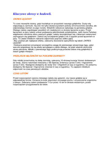 Kluczowe okresy w hodowli. OKRES LĘGOWY To czas niezwykle istotny, gdyż kształtuje on przyszłość naszego gołębnika. Dużą rolę odgrywają tu samiczki. Są one nie tylko dostarczycielami połowy chromozomów zarodka, ale odpowiadają również za jego rozwój. Składniki odżywcze wpływają na genetykę gołębia. Dlatego należy zapobiegać wszelkim ich niedoborom w okresie łączenia w pary. Przed łączeniem w pary należy unikać podawania jakichkolwiek antybiotyków. Jeśli macie Państwo wątpliwości odnośnie stanu waszych gołębi, należy skontaktować się z lekarzem weterynarii zajmującym się gołębiami. Zaleca się szczepienie gołębi 2 do 3 tygodni przed łączeniem w pary. To ułatwi młódkom nabranie odporności poprzez żółtko jajka. Aby uzyskać jak najlepsze efekty, zalecamy dozowanie specyfików wg tabeli „OKRES LĘGÓW”. Hodowca powinien przywiązać szczególna uwagę do pierwszego wiosennego lęgu, gdyż warunki pogodowe nie są wtedy sprzyjające a także dlatego, że ptaki właśnie skończyły okres pierzenia. Młódki z pierwszego lęgu podtrzymują przecież dobre imię gołębnika w lotach gołębi młodych. PRZEJŚCIE MŁÓDKÓW NA POKARM ZIARNISTY Gdy młódki przechodzą na dietę ziarnistą, zalecamy 10-dniową kurację Viorem dodawanym do wody. Ziarno natomiast mieszamy z Sb-Special, Enterocur (przez 5 dni) i Vigoramine (przez 5 dni). Następnie dodajemy do wody Vior i Oligofertil (2 razy w tygodniu). Do pokarmu dodajemy Sb-Special i Vigoramine (również 2 razy w tygodniu). To zapewni młódkom odporność na czas pierwszych oblotów. CZAS LOTÓW Przed rozpoczęciem sezonu lotowego należy się upewnić, czy nasze gołębie są w odpowiedniej formie. Oznacza to brak obecności zimowego puchu i oczyszczenie organizmu z toksyn. Zalecamy zatem podawanie T-Cur przez 10 dni w okresie wiosennym, przed rozpoczęciem przygotowania do lotów. OKRES PIERZENIA Okres pierzenia nadchodzi z końcem lata. Pióra gołębia powstają z silnie zmineralizowanych składników odżywczych. Analiza składu piór zainspirowała nas do stworzenia produktu o nazwie Vitamolt. Jego skład jest prawie identyczny jak skład pióra. Vitamolt i Vigoramine to klucz do osiągnięcia znakomitej jakości upierzenia. Podczas okresu pierzenia zalecamy następującą dawkę: 1 łyżka Vitamolt + 1 łyżka Vigoramine na kilogram ziarna, trzy razy w tygodniu. Dodatkowo 1 łyżeczka Vior na litr wody. Poniedziałek Do wody Vior + oligo-fertil 1 łyżeczka / l wody 1 łyżka / l wody Wtorek Do pokarmu Sb special Enterocur 2 łyżeczki / kg pokarmu 2 łyżeczki / kg pokarmu Do wody Vior 1 łyżeczka / l wody Środa Do wody Vitamolt 1 łyżka / l wody Czwartek Do pokarmu Vigoramine Performoil 3 łyżeczki / kg pokarmu 1 łyżka / kg pokarmu Do wody Vior + Oligofertil 1 łyżeczka / l wody 1 łyżka / l wody Do wody Vitamolt 1 łyżka / l wody Piątek OKRES PIERZENIA 1. przygotowanie i oczyszczenie organizmu gołębia: przez 7 dni: Vior: 1 łyżeczka / l wody Puravital: 2 łyżeczki / l wody T-cur: 2 łyżeczki / l wody 2. zmiana upierzenia OKRES LĘGÓW Poniedziałek Do pokarmu Vigoramine Enterocur 3 łyżeczki / kg pokarmu 2 łyżeczki / kg pokarmu Do pokarmu Sb Special Cckuur 2 łyżeczki / kg pokarmu 30 kropli / kg pokarmu Do wody Vior Oligofertil 1 łyżeczka / l wody 1 łyżka / l wody Do wody Wtorek Środa Czwartek ---- ---- Do pokarmu Sb Special Cckuur 2 łyżeczki / kg pokarmu 30 kropli / kg pokarmu Do wody Vior Oligofertil 1 łyżeczka / l wody 1 łyżka / l wody ---- Piątek ---- ---- Sobota Do pokarmu Sb Special Cckuur 2 łyżeczki / kg pokarmu 30 kropli / kg pokarmu Do wody Vior 1 łyżeczka / l wodu Niedziela ---- ---- ---- ---- OKRES LOTÓW Poniedziałek Do pokarmu Do wody Wtorek Do pokarmu Do wody Środa Do pokarmu Do wody Czwartek Piątek ---- Do pokarmu Do wody Sobota Niedziela (przylot) Vigoramine Enterocur Performoil Vior 3 łyżeczki / kg pokarmu 2 łyżeczki / kg pokarmu 1 łyżka / kg pokarmu 1 łyżeczka / l wody Sb Special Cckuur Vior 2 łyżeczki / kg pokarmu 30 kropli / kg pokarmu 1 łyżeczka / l wody Sb Special Cckuur Oligofertil 2 łyżeczki / kg pokarmu 30 kropli / kg pokarmu 1 łyżka / l wody ---- Vigoramine Enterocur Performoil Vior ---- ---- Do pokarmu Do wody Enterocur Vior T-cur ---- 3 łyżeczki / kg pokarmu 2 łyżeczki / kg pokarmu 1 łyżka / kg pokarmu 1 łyżeczka / l wody ---- 2 łyżeczki / kg pokarmu 1 łyżeczka / l wody 1 łyżeczka / l wody ŚREDNI DYSTANS – tydzień pierwszy Poniedziałek Do pokarmu Do wody Wtorek Do pokarmu Do wody Środa Do pokarmu Do wody Vigoramine Enterocur Performoil Vior T-cur 3 łyżeczki / kg pokarmu 2 łyżeczki / kg pokarmu 1 łyżka / kg pokarmu 1 łyżeczka / l wody 1 łyżeczka / l wody Sb Special Cckuur Vior T-cur 2 łyżeczki / kg pokarmu 30 kropli / kg pokarmu 1 łyżeczka / l wody 1 łyżeczka / l wody Sb Special Cckuur Oligofertil 2 łyżeczki / kg pokarmu 30 kropli / kg pokarmu 1 łyżka / l wody Vigoramine Enterocur Performoil Vior 3 łyżeczki / kg pokarmu 2 łyżeczki / kg pokarmu 1 łyżka / kg pokarmu 1 łyżeczka / l wody Vichol Powergamma 1 łyżka / kg pokarmu 2 łyżeczki / kg pokarmu Czwartek Piątek Do pokarmu Do wody Sobota Niedziela Do pokarmu ŚREDNI DYSTANS – tydzień drugi Poniedziałek Do pokarmu Do wody Wtorek Do pokarmu Do wody Środa Do pokarmu Do wody Czwartek Do pokarmu Do wody Vigoramine Enterocur Performoil Vior 3 łyżeczki / kg pokarmu 2 łyżeczki / kg pokarmu 1 łyżka / kg pokarmu 1 łyżeczka / l wody Sb Special Cckuur Protovit Vior 2 łyżeczki / kg pokarmu 30 kropli / kg pokarmu 4 łyżki / kg pokarmu 1 łyżeczka / l wody Sb Special Cckuur Protovit Oligofertil 2 łyżeczki / kg pokarmu 30 kropli / kg pokarmu 4 łyżki / kg pokarmu 1 łyżka / l wody Vigoramine Enterocur Performoil vior 3 łyżeczki / kg pokarmu 2 łyżeczki / kg pokarmu 1 łyżka / kg pokarmu 1 łyżeczka / l wody Enterocur Vichol Powergamma Vior Puravital 2 łyżeczki / kg pokarmu 1 ły
