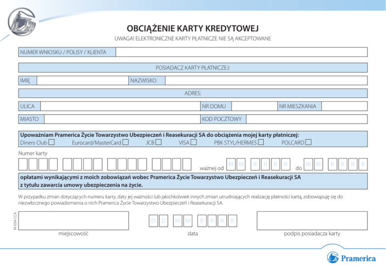OBCIĄŻENIE KARTY KREDYTOWEJ UWAGA! ELEKTRONICZNE KARTY PŁATNICZE NIE SĄ AKCEPTOWANE NUMER WNIOSKU / POLISY / KLIENTA POSIADACZ KARTY PŁATNICZEJ: IMIĘ NAZWISKO ADRES: ULICA NR DOMU NR MIESZKANIA MIASTO KOD POCZTOWY Upoważniam Pramerica Życie Towarzystwo Ubezpieczeń i Reasekuracji SA do obciążenia mojej karty płatniczej: Diners Club Eurocard/MasterCard JCB VISA PBK STYL/HERMES POLCARD Numer karty ważnej od M M R R R R do M M R R opłatami wynikającymi z moich zobowiązań wobec Pramerica Życie Towarzystwo Ubezpieczeń i Reasekuracji SA z tytułu zawarcia umowy ubezpieczenia na życie. M-004-CCA W przypadku zmian dotyczących numeru karty, daty jej ważności lub jakichkolwiek innych zmian utrudniających realizację płatności kartą, zobowiązuję się do niezwłocznego powiadomienia o nich Pramerica Życie Towarzystwo Ubezpieczeń i Reasekuracji SA. D D miejscowość M M data R R R R podpis posiadacza karty R R