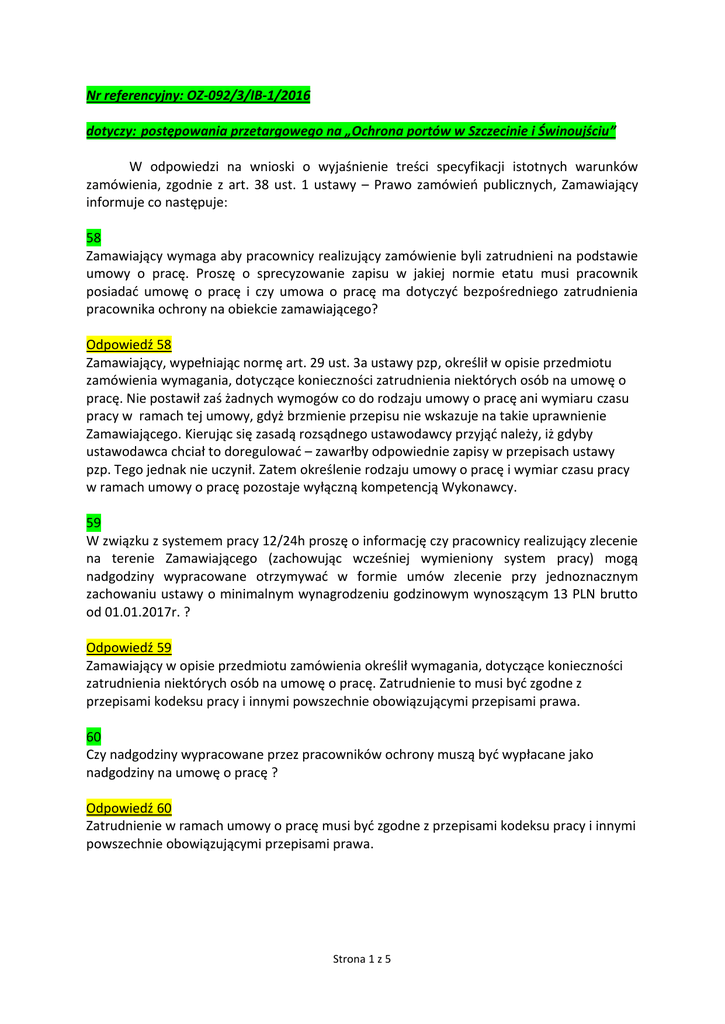 Nr referencyjny: OZ-092/3/IB-1/2016 dotyczy: postępowania przetargowego na „Ochrona portów w Szczecinie i Świnoujściu” W odpowiedzi na wnioski o wyjaśnienie treści specyfikacji istotnych warunków zamówienia, zgodnie z art. 38 ust. 1 ustawy – Prawo zamówień publicznych, Zamawiający informuje co następuje: 58 Zamawiający wymaga aby pracownicy realizujący zamówienie byli zatrudnieni na podstawie umowy o pracę. Proszę o sprecyzowanie zapisu w jakiej normie etatu musi pracownik posiadać umowę o pracę i czy umowa o pracę ma dotyczyć bezpośredniego zatrudnienia pracownika ochrony na obiekcie zamawiającego? Odpowiedź 58 Zamawiający, wypełniając normę art. 29 ust. 3a ustawy pzp, określił w opisie przedmiotu zamówienia wymagania, dotyczące konieczności zatrudnienia niektórych osób na umowę o pracę. Nie postawił zaś żadnych wymogów co do rodzaju umowy o pracę ani wymiaru czasu pracy w ramach tej umowy, gdyż brzmienie przepisu nie wskazuje na takie uprawnienie Zamawiającego. Kierując się zasadą rozsądnego ustawodawcy przyjąć należy, iż gdyby ustawodawca chciał to doregulować – zawarłby odpowiednie zapisy w przepisach ustawy pzp. Tego jednak nie uczynił. Zatem określenie rodzaju umowy o pracę i wymiar czasu pracy w ramach umowy o pracę pozostaje wyłączną kompetencją Wykonawcy. 59 W związku z systemem pracy 12/24h proszę o informację czy pracownicy realizujący zlecenie na terenie Zamawiającego (zachowując wcześniej wymieniony system pracy) mogą nadgodziny wypracowane otrzymywać w formie umów zlecenie przy jednoznacznym zachowaniu ustawy o minimalnym wynagrodzeniu godzinowym wynoszącym 13 PLN brutto od 01.01.2017r. ? Odpowiedź 59 Zamawiający w opisie przedmiotu zamówienia określił wymagania, dotyczące konieczności zatrudnienia niektórych osób na umowę o pracę. Zatrudnienie to musi być zgodne z przepisami kodeksu pracy i innymi powszechnie obowiązującymi przepisami prawa. 60 Czy nadgodziny wypracowane przez pracowników ochrony muszą być wypłacane jako nadgodziny na umowę o pracę ? Odpowiedź 60 Zatrudnienie w ramach umowy o pracę musi być zgodne z przepisami kodeksu pracy i innymi powszechnie obowiązującymi przepisami prawa. Strona 1 z 5 61 Zamawiający w SIWZ w pkt. 4.2. zobowiązuje Wykonawcę do zapewnienia interwencji patrolu miejskiej grupy interwencyjnej. Czy ta część zamówienia może być powierzona podwykonawcy ? Odpowiedź 61 Zamawiający nie zastrzegł do osobistego wykonania żadnej części zamówienia wobec tego każda jego część może być powierzona podwykonawcy. 62 Zamawiający w SIWZ w pkt. 4.4 zobowiązuje wykonawcę do zapewnienia WŁASNEJ miejskiej grupy interwencyjnej. Proszę o wykreślenie z SIWZ wyrazu własnej, gdyż ta część zamówienia można powierzyć podwykonawcy. Odpowiedź 62 Słowo „własnej” użyte w pkt 4.4. siwz nie świadczy o tym, że Wykonawca nie może powierzyć części zamówienia, związanej z zapewnieniem miejskiej grupy interwencyjnej podwykonawcy. Własna grupa interwencyjna Wykonawcy , to również grupa podwykonawcy, gdyż Wykonawca odpowiada za wykonanie części zamówienia powierzonej podwykonawcom jak za swoje własne. 63 Czy Zamawiający wymaga, aby wszyscy pracownicy byli zatrudnieni na umowę o pracę również pracownicy z grupy interwencyjnej? Pragniemy zwrócić uwagę, że według art. 22 ust. 1 umowy z dnia 26 czerwca 1974 roku - Kodeks Pracy stosunek pracy jest wtedy, gdy praca jest określonego rodzaju na rzecz pracodawcy i pod kierownictwem oraz w miejscu i czasie wyznaczonym przez pracodawcę. Trudno jest więc stwierdzić, że pracownik z grupy interwencyjnej pracuje w określonym miejscu i czasie, gdyż wsparcie grupy interwencyjnej jest usługą doraźną. Odpowiedź 63 Zamawiający nie żądał zatrudnienia na umowę o pracę wszystkich pracowników Wykonawcy i podwykonawcy. Zamawiający zapisał w pkt 4.23 siwz, że żąda zatrudnienia na umowę o pracę osób wykonujących czynności przy realizacji zamówienia (następnie wymienił o jakie czynności chodzi) oraz podlegających przy realizacji zadań, stanowiących przedmiot niniejszego zamówienia, nadzorowi Dowódcy Zmiany lub Szefa Ochrony. Jednoznacznie Zamawiający więc przesądził, że zatrudnienie na umowę o pracę jest wymagane wyłącznie w warunkach wykonywania pracy w sposób określony w art. 22 § 1 ustawy – kodeks pracy. 64 W dniu 17 sierpnia 2016 r. wszedł w życie art. 7 ustawy o zmianie ustawy o minimalnym wynagrodzeniu za pracę oraz niektórych innych ustaw (Dz. U. 2016 poz 1265). Zgodnie z tym przepisem, podmioty zatrudniające osoby w oparciu o umowy zlecenie od 17 sierpnia 2016 r. mają obowiązek ustalania od 1 stycznia 2017 r. minimalnej płacy za 1 roboczogodzinę pracy na poziomie 13 zł. Mając powyższe na uwadze proszę o odpowiedź, czy Zamawiający zobowiązuje się do odpowiedniej zmiany wynagrodzenia umownego o wartość dodatkowych Strona 2 z 5 kosztów poniesionych przez Wykonawcę w związku z wprowadzeniem minimalnej stawki godzinowej, do czego zobowiązuje art. 7-11 w/w Ustawy? Odpowiedź 64 Wykonawca ma obowiązek ustalić cenę jednej roboczogodziny z uwzględnieniem czasu wykonywania zamówienia (23 miesiące) oraz wszystkich okoliczności związanych z wykonywaniem tego zamówienia. Wykonawca ma obowiązek tak skalkulować cenę jednej roboczogodziny, by uwzględniała ona wszystkie koszty związane z realizacją zamówienia od dnia 1 stycznia 2017 r., z uwzględnieniem wszystkich przepisów prawa, które są ogólnodostępne i znane już w dniu składania ofert, jak np. akt wykonawczy do ustawy o minimalnym wynagrodzeniu za pracę, podwyższający od dnia 1 stycznia 2017 roku minimalne wynagrodzenie o pracę do kwoty 2.000,00 zł, czy obwieszczenie w sprawie wysokości minimalnej stawki godzinowej w 2017 r. podwyższające tą stawkę do kwoty 13 zł. Waloryzację wynagrodzenia, następującą na skutek zmiany przep