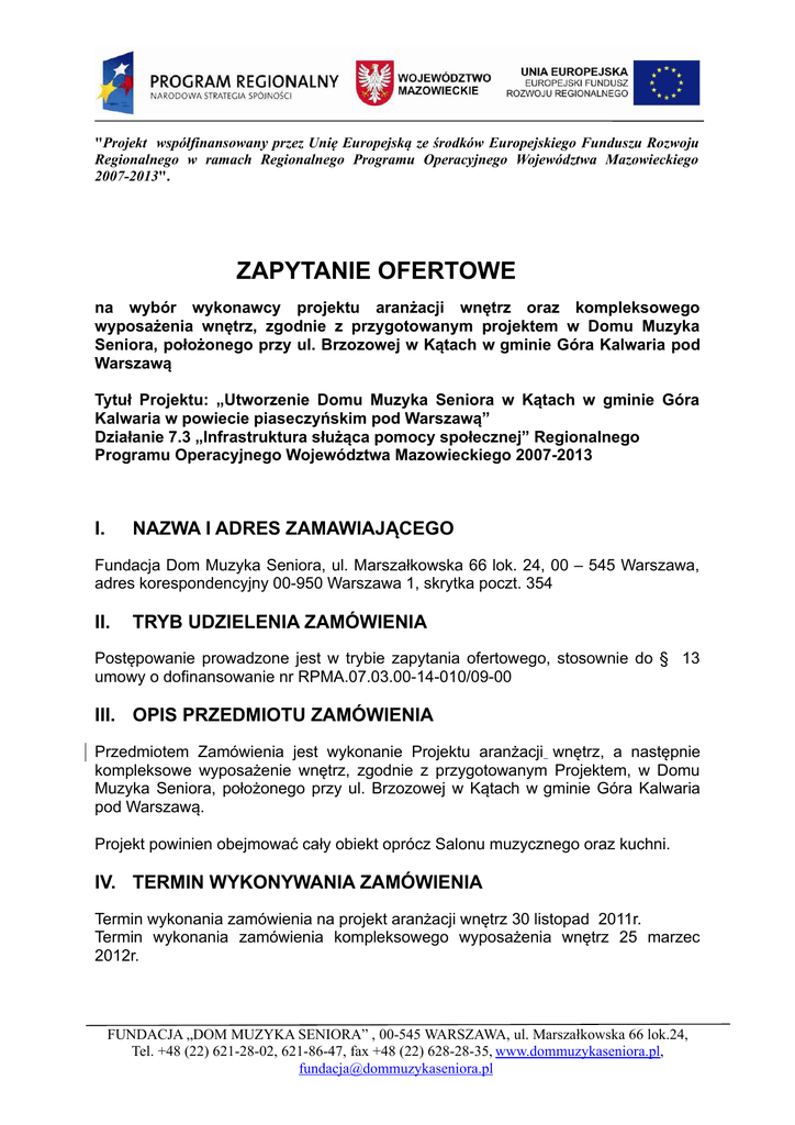 "Projekt współfinansowany przez Unię Europejską ze środków Europejskiego Funduszu Rozwoju Regionalnego w ramach Regionalnego Programu Operacyjnego Województwa Mazowieckiego 2007-2013". ZAPYTANIE OFERTOWE na wybór wykonawcy projektu aranżacji wnętrz oraz kompleksowego wyposażenia wnętrz, zgodnie z przygotowanym projektem w Domu Muzyka Seniora, położonego przy ul. Brzozowej w Kątach w gminie Góra Kalwaria pod Warszawą Tytuł Projektu: „Utworzenie Domu Muzyka Seniora w Kątach w gminie Góra Kalwaria w powiecie piaseczyńskim pod Warszawą” Działanie 7.3 „Infrastruktura służąca pomocy społecznej” Regionalnego Programu Operacyjnego Województwa Mazowieckiego 2007-2013 I. NAZWA I ADRES ZAMAWIAJĄCEGO Fundacja Dom Muzyka Seniora, ul. Marszałkowska 66 lok. 24, 00 – 545 Warszawa, adres korespondencyjny 00-950 Warszawa 1, skrytka poczt. 354 II. TRYB UDZIELENIA ZAMÓWIENIA Postępowanie prowadzone jest w trybie zapytania ofertowego, stosownie do § 13 umowy o dofinansowanie nr RPMA.07.03.00-14-010/09-00 III. OPIS PRZEDMIOTU ZAMÓWIENIA Przedmiotem Zamówienia jest wykonanie Projektu aranżacji wnętrz, a następnie kompleksowe wyposażenie wnętrz, zgodnie z przygotowanym Projektem, w Domu Muzyka Seniora, położonego przy ul. Brzozowej w Kątach w gminie Góra Kalwaria pod Warszawą. Projekt powinien obejmować cały obiekt oprócz Salonu muzycznego oraz kuchni. IV. TERMIN WYKONYWANIA ZAMÓWIENIA Termin wykonania zamówienia na projekt aranżacji wnętrz 30 listopad 2011r. Termin wykonania zamówienia kompleksowego wyposażenia wnętrz 25 marzec 2012r. FUNDACJA „DOM MUZYKA SENIORA” , 00-545 WARSZAWA, ul. Marszałkowska 66 lok.24, Tel. +48 (22) 621-28-02, 621-86-47, fax +48 (22) 628-28-35, www.dommuzykaseniora.pl, [email protected] "Projekt współfinansowany przez Unię Europejską ze środków Europejskiego Funduszu Rozwoju Regionalnego w ramach Regionalnego Programu Operacyjnego Województwa Mazowieckiego 2007-2013". V. INFORMACJE DOTYCZĄCE WARUNKÓW WYMAGANYCH OD WYKONAWCY 1. O zamówienie mogą ubiegać się podmioty, które spełniają określone warunki, tj.: a. Posiadają niezbędną wiedzę i doświadczenie oraz dysponują potencjałem technicznym i osobami zdolnymi do wykonania świadczenia b. Przedstawią ofertę zgodną z wymaganiami niniejszego Zapytania; c. Złożą tylko jedną ofertę dotyczącą przedmiotu zamówienia; 2. Zamawiający nie dopuszcza możliwości składania ofert częściowych i wariantowych. VI. TERMIN ZWIĄZANIA OFERTĄ: 1. Wykonawca pozostaje związany ofertą 30 dni; 2. Bieg terminu, o którym mowa w ust. 1 rozpoczyna się wraz z upływem terminu składania ofert. VII. OPIS SPOSOBU PRZYGOTOWANIA OFERTY: 1. Wykonawca ma prawo złożyć tylko jedną ofertę, zawierającą jednoznacznie opisaną propozycję. Złożenie większej ilości ofert lub złożenie oferty wariantowej spowoduje odrzucenie wszystkich ofert złożonych przez Przedsiębiorcę. 2. Ofertę należy sporządzić w formie pisemnej, w języku polskim pod rygorem nieważności, na maszynie lub komputerze. 3. Oferta musi być podpisana zgodnie z zasadami reprezentacji wskazanymi we właściwym rejestrze lub ewidencji działalności gospodarczej. 4. Przedsiębiorca może wprowadzić zmiany lub wycofać złożoną przez siebie ofertę, pod warunkiem, że Zamawiający otrzyma pisemne powiadomienie o wprowadzeniu zmian lub wycofaniu oferty, przed upływem terminu składania ofert. Powiadomienie o wprowadzeniu zmian lub wycofaniu ofert musi być oznaczone jak w punkcie 7 oraz dodatkowo opisane „zmiana” lub „wycofanie”. FUNDACJA „DOM MUZYKA SENIORA” , 00-545 WARSZAWA, ul. Marszałkowska 66 lok.24, Tel. +48 (22) 621-28-02, 621-86-47, fax +48 (22) 628-28-35, www.dommuzykaseniora.pl, [email protected] "Projekt współfinansowany przez Unię Europejską ze środków Europejskiego Funduszu Rozwoju Regionalnego w ramach Regionalnego Programu Operacyjnego Województwa Mazowieckiego 2007-2013". 5. Przedsiębiorca nie może wycofać oferty ani wprowadzić zmian w treści oferty po upływie terminu składania ofert. 6. Przedsiębiorcy ponoszą wszelkie koszty związane z przygotowaniem i złożeniem oferty. 7. Oferty powinny być przesyłane listownie na adres Zamawiającego: Fundacja Dom Muzyka Seniora 00-950 Warszawa 1 skrytka poczt. 354 z dopiskiem: „Projekt aranżacji wnętrz i kompleksowe wyposażenie Domu Muzyka Seniora, położonego przy ul. Brzozowej w Kątach w gminie Góra Kalwaria pod Warszawą” - „nie otwierać przed dniem otwarcia ofert tj. do dn. 07.11.2011r., godz. 10:00” oraz opatrzone nazwą i dokładnym adresem Oferenta. VIII. MIEJSCE ORAZ TERMIN SKŁADANIA OFERT: 1. Termin składania ofert w siedzibie Zamawiającego upływa dnia 07.11.2011 roku, o godz. 10:00 2. Wszystkie oferty otrzymane po wymienionym wyżej terminie zostaną odrzucone, przy czym decydujące znaczenie dla oceny zachowania powyższego terminu ma data oraz godzina wpływu oferty do Zamawiającego, a nie data wysłania. IX. KRYTERIA OCENY I WYBÓR OFERT: 1. Formalnej i merytorycznej oceny dokona powołana przez Zarząd Fundacji Komisja. 2. Do oceny merytorycznej zostaną zakwalifikowane jedynie te oferty, które spełnią wszystkie kryteria oceny formalnej: a. Forma i termin złożenia oferty; b. Podpisanie oferty przez uprawnioną osobę (zaparafowana każda strona, a ostatnia z podpisem i pieczątką firmową); 3. Ocenie merytorycznej będzie podlegała: FUNDACJA „DOM MUZYKA SENIORA” , 00-545 WARSZAWA, ul. Marszałkowska 66 lok.24, Tel. +48 (22) 621-28-02, 621-86-47, fax +48 (22) 628-28-35, www.dommuzykaseniora.pl, [email protected] "Projekt współfinansowany przez Unię Europejską ze środków Europejskiego Funduszu Rozwoju Regionalnego w ramach Regionalnego Programu Operacyjnego Województwa Mazowieckiego 2007-2013". a. Cena…………………………………………………………..max. 40 pkt b. Doświadczenie i potencjał techniczny do wykonania zamówien