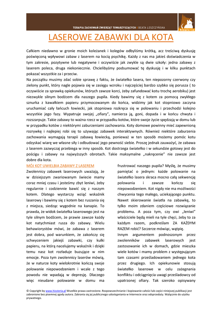 LASEROWE ZABAWKI DLA KOTA Całkiem niedawno w gronie moich koleżanek i kolegów odbyliśmy krótką, acz treściwą dyskusję poświęconą wpływowi zabaw z laserem na kocią psychikę. Każdy z nas ma jakieś doświadczenia w tym zakresie, pozytywne lub negatywne i oczywiście jak zwykle są dwie szkoły: jedna zabawy z laserem poleca, druga niekoniecznie. Chcielibyśmy podsumować tę dyskusję i w kilku punktach pokazać wszystkie za i przeciw. Na początku musimy zdać sobie sprawę z faktu, że światełko lasera, ten niepozorny czerwony czy zielony punkt, który nagle pojawia się w zasięgu wzroku i najczęściej bardzo szybko się porusza ( to oczywiście za sprawką opiekunów, których zawsze korci, żeby zafundować kotu trochę aerobiku) jest niezwykle silnym bodźcem dla naszego pupila. Kiedy bawimy się z kotem za pomocą zwykłego sznurka z kawałkiem papieru przymocowanym do końca, widzimy jak kot stopniowo zaczyna uruchamiać cały łańcuch łowiecki, jak stopniowa rozkręca się w polowaniu i przechodzi kolejno wszystkie jego fazy. Wypatruje swojej „ofiary”, namierza ją, goni, dopada i w końcu chwyta i rozszarpuje. Takie zabawy to ważna rzecz w przypadku kotów, które swoje życie spędzają w domu lub w przypadku kotów z niektórymi zaburzeniami zachowania. Koty domowe powinny mieć zapewnioną rozrywkę i najlepiej robi się to używając zabawek interaktywnych. Również niektóre zaburzenia zachowania wymagają terapii zabawą łowiecką, ponieważ w ten sposób możemy pomóc kotu odzyskać wiarę we własne siły i odbudować jego pewność siebie. Proszę jednak zauważyć, że zabawa z laserem zazwyczaj przebiega w inny sposób. Kot dostrzega światełko i w sekundzie gotowy jest do pościgu i zabawy na najwyższych obrotach. Takie maksymalne „nakręcenie” nie zawsze jest dobre dla kota. MÓJ KOT UWIELBIA ZABAWY Z LASEREM frustrować naszego pupila? Myślę, że musimy Zwolennicy zabawek laserowych uważają, że pamiętać o jednym: każde polowanie na w dzisiejszym zwariowanym świecie mamy światełko lasera skraca mocno całą sekwencję coraz mniej czasu i jesteśmy zbyt leniwi, żeby polowania i zawsze kończy się regularnie i codziennie bawić się z naszym niepowodzeniem. Kot nigdy nie ma możliwości kotem. Dlatego wystarczy wziąć wskaźnik chwycenia tego małego, uciekającego punktu. laserowy i bawimy się z kotem bez ruszania się Nawet skierowanie światła na zabawkę, to z miejsca, siedząc wygodnie na kanapie. To tylko moim zdaniem częściowe rozwiązanie prawda, że widok światełka laserowego jest na problemu. A poza tym, czy owi „leniwi” tyle silnym bodźcem, że prawie zawsze każdy właściciele będą mieli na tyle chęci, żeby to za kot natychmiast rusza do zabawy. Wielu każdym razem, podkreślam ZA KAŻDYM behawiorystów mówi, że zabawa z laserem RAZEM robić? Szczerze mówiąc, wątpię. jest dobra, pod warunkiem, że zakończy się Innym argumentem podnoszonym przez schwyceniem jakiejś zabawki, czy kulki zwolenników zabawek laserowych jest papieru, na którą nacelujemy wskaźnik i dzięki zastosowanie ich w domach, gdzie mieszka temu nasz kot rozładuje buzujące w nim wiele kotów i mamy problem z występującym emocje. Poza tym zwolennicy laserów mówią, tam czasami prześladowaniem jednego kota że w naturze koty wielokrotnie kończą swoje przez drugiego. Ich opiekunowie stosują polowanie niepowodzeniem i wcale z tego światełko laserowe w celu zażegnania powodu nie wpadają w depresję. Dlaczego konfliktu i odciągnięcia uwagi prześladowcy od więc nieudane polowanie w domu ma upatrzonej ofiary. Tak szeroko opisywany © Copyright by www.hissteria.pl Wszelkie prawa zastrzeżone. Rozpowszechnianie i kopiowanie całości lub części niniejszej publikacji jest zabronione bez pisemnej zgody autora. Zabrania się jej publicznego udostępniania w Internecie oraz odsprzedaży. Wyłącznie do użytku prywatnego. obecnie wśród ludzi stalking jest częstym problemem, z jakim zgłaszają się do nas klienci, którzy chcąc zapewnić swojemu kotu towarzystwo, nieświadomie fundują mu „śmiertelnego” wroga. Stalking wśród kotów przybiera formę prześladowania jednego osobnika przez drugiego i może prowadzić do głębokiej frustracji, agresji i innych problemów behawioralnych. Chcąc uprzedzić atak, często stosujemy technikę odwracania uwagi i przekierowujemy uwagę prześladowcy na coś innego. Światełko lasera dobrze się sprawdza w takiej sytuacji, ale oprócz wskaźnika laserowego możemy również wykorzystać zabawki interaktywne i osiągniemy dokładnie ten sam efekt. Poza tym w przypadku używania lasera ryzykujemy, że nagły ruch w nieodpowiednim kierunku sprawi, że skierujemy światło prosto w kocie oko. NIE ZAWSZE ZABAWA Z LASEREM JEST BEZPIECZNA Jakie argumenty wysuwają przeciwnicy zabawek z laserem? Najczęściej mówią oni o dwóch głównych powodach, dla których nie powinno się używać tych zabawek. Pierwszy to względy bezpieczeństwa. Musimy pamiętać, że wiązka laserowa skierowana bezpośrednio w oko lub odbita od lśniących powierzchni może w sposób trwały uszkodzić wzrok. Producenci zabawek zalecają, żeby wskaźniki używane do zabawy z kotem nie przekraczały mocy 5 mW. Każdy szanujący się producent powinien podać informację o mocy lasera na opakowaniu lub w instrukcji obsługi. Tam też powinny znaleźć szczegółowe informacje i ostrzeżenie, żeby nie kierować promienia bezpośrednio w stronę oka oraz, że patrzenie w wiązkę przez około 10 s. może trwale uszkodzić wzrok. Ciekawostką jest fakt, że niektóre stany w USA, pod groźbą sankcji, zakazują używania wskaźników osobom poniżej 18 roku życia. Oczywiście wszyscy zwolennicy laserów powiedzą, że są odpowiedzialni i nigdy nie kierują strumienia w oko, itp. Mało tego, rynek się rozwija i obecnie reklamuje się laserowe zabawki dla kotów (np. FroliCat BOLT lub Froli