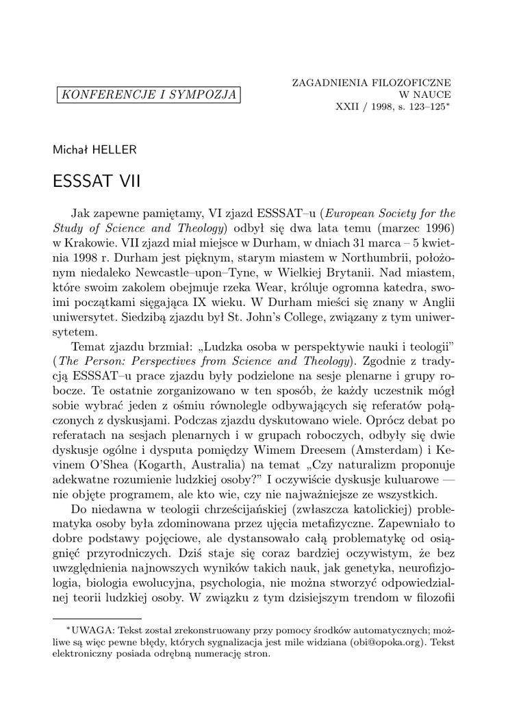 KONFERENCJE I SYMPOZJA ZAGADNIENIA FILOZOFICZNE W NAUCE XXII / 1998, s. 123–125∗ Michał HELLER ESSSAT VII Jak zapewne pamiętamy, VI zjazd ESSSAT–u (European Society for the Study of Science and Theology) odbył się dwa lata temu (marzec 1996) w Krakowie. VII zjazd miał miejsce w Durham, w dniach 31 marca – 5 kwietnia 1998 r. Durham jest pięknym, starym miastem w Northumbrii, położonym niedaleko Newcastle–upon–Tyne, w Wielkiej Brytanii. Nad miastem, które swoim zakolem obejmuje rzeka Wear, króluje ogromna katedra, swoimi początkami sięgająca IX wieku. W Durham mieści się znany w Anglii uniwersytet. Siedzibą zjazdu był St. John’s College, związany z tym uniwersytetem. Temat zjazdu brzmiał: „Ludzka osoba w perspektywie nauki i teologii” (The Person: Perspectives from Science and Theology). Zgodnie z tradycją ESSSAT–u prace zjazdu były podzielone na sesje plenarne i grupy robocze. Te ostatnie zorganizowano w ten sposób, że każdy uczestnik mógł sobie wybrać jeden z ośmiu równolegle odbywających się referatów połączonych z dyskusjami. Podczas zjazdu dyskutowano wiele. Oprócz debat po referatach na sesjach plenarnych i w grupach roboczych, odbyły się dwie dyskusje ogólne i dysputa pomiędzy Wimem Dreesem (Amsterdam) i Kevinem O’Shea (Kogarth, Australia) na temat „Czy naturalizm proponuje adekwatne rozumienie ludzkiej osoby?” I oczywiście dyskusje kuluarowe — nie objęte programem, ale kto wie, czy nie najważniejsze ze wszystkich. Do niedawna w teologii chrześcijańskiej (zwłaszcza katolickiej) problematyka osoby była zdominowana przez ujęcia metafizyczne. Zapewniało to dobre podstawy pojęciowe, ale dystansowało całą problematykę od osiągnięć przyrodniczych. Dziś staje się coraz bardziej oczywistym, że bez uwzględnienia najnowszych wyników takich nauk, jak genetyka, neurofizjologia, biologia ewolucyjna, psychologia, nie można stworzyć odpowiedzialnej teorii ludzkiej osoby. W związku z tym dzisiejszym trendom w filozofii ∗ UWAGA: Tekst został zrekonstruowany przy pomocy środków automatycznych; możliwe są więc pewne błędy, których sygnalizacja jest mile widziana ([email protected]). Tekst elektroniczny posiada odrębną numerację stron. 2 Michał HELLER i teologii grozi druga skrajność — gromadzenie wyników nauk przyrodniczych, łączenie ich ze sobą przy pomocy jakichś mniej lub bardziej luźnych refleksji z pominięciem solidnej analizy metodologicznej i metafizycznej. Poszukiwanie czegoś pośredniego pomiędzy tymi skrajnościami cechowało większość toczonych dyskusji. Referaty plenarne należałoby umieścić bliżej „przyrodniczo–empirycznego krańca” spektrum możliwych stanowisk. Świadczą o tym ich tytuły: „Psychologiczne i religijne pojęcie osoby” (Fraser Watts, Cambridge), „Czy nowożytną, europejską koncepcję osoby można utrzymać jako model osobowości?” (Michael Welker, Heidelberg), „świadomość, fatalizm i konieczność ludzkiej osoby” (Philip Hefner, Chicago), „Mózg dziecka: o neurologicznym determinizmie i wolnej woli” (Hugo Lagercrantz, Stockholm). Oczywiście nie można oczekiwać, że jeden zjazd naukowy będzie w stanie rozstrzygnąć kwestię nabrzmiałą przez dziesięciolecia. Ale na pewno zadaniem zjazdu jest taki problem postawić w całej jego ostrości i skłonić ludzi do myślenia o nim. To zadanie zjazd w Durham spełnił na pewno. Praca w grupach roboczych jest mniej uchwytna i trudniejsza do zreferowania niż praca podczas sesji plenarnych. Choćby z tego względu, że grupy robocze pracowały równolegle i nie dało się brać udziału we wszystkich. Wprawdzie każdy uczestnik zjazdu dysponował abstraktami wszystkich referatów, ale nawet ich dokładne przestudiowanie nie dawało wyobrażenia o całości. Prelegent w każdej grupie miał 10–15 min. na przedstawienie swoich tez, potem następowała trwająca 40 min. dyskusja, która niekiedy bywała bardziej interesująca od samego referatu. Warto może tylko przytoczyć przynajmniej niektóre tytuły grup roboczych: „Filozofia, fizyka i pojęcie osoby”, „Umysł i ciało” (Mind and body), „Identyczność osoby”, „Biologiczne i teologiczne implikacje pojęcia osoby”, „Czas i pojęcie osoby”. Podczas zjazdów ESSSAT–u odbywają się również posiedzenia Rady tego Towarzystwa i jego zebrania plenarne. W czasie tych posiedzeń i zebrań decyduje się przyszła polityka ESSSAT–u. W tym roku mocno podkreślano jeden z celów Towarzystwa, jakim jest propagowanie dialogu między nauką a teologią jako dyscypliny akademickiej. W tym roku niżej podpisany zakończył swoją 8–letnia kadencję członka Rady ESSSAT–u; na jego miejsce Plenarne Zgromadzenie wybrało ks. dra Zbigniewa Lianę z Krakowa. Na zebraniu plenarnym wręczono także nagrodę ESSSAT–u. Przypadła ona w udziale Nicholasowi Saundersowi z Uniwersytetu w Cambridge za pracę „Divine Action In the Context of Modern Science”. ESSSAT VII 3 Za dwa lata, a więc równo w roku 2000, odbędzie się następny zjazd ESSSAT–u. Rada Towarzystwa przyjęła zaproszenie Katolickiego Uniwersytetu w Lyonie. Ustalono, że temat zjazdu będzie związany z problematyką przyczynowości i celowości w nauce i teologii. Michał Heller