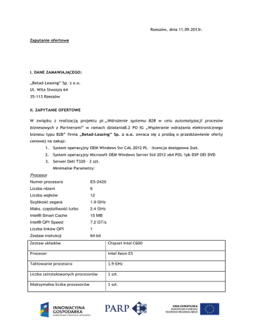 Rzeszów, dnia 11.09.2013r. Zapytanie ofertowe I. DANE ZAMAWIAJĄCEGO: „Betad-Leasing” Sp. z o.o. Ul. Wita Stwosza 64 35-113 Rzeszów II. ZAPYTANIE OFERTOWE W związku z realizacją projektu pt.„Wdrożenie systemu B2B w celu automatyzacji procesów biznesowych z Partnerami” w ramach działania8.2 PO IG „Wspieranie wdrażania elektronicznego biznesu typu B2B” firma „Betad-Leasing” Sp. z o.o. zwraca się z prośbą o przedstawienie oferty cenowej na zakup: 1. System operacyjny OEM Windows Svr CAL 2012 PL – licencja dostępowa 2szt. 2. System operacyjny Microsoft OEM Windows Server Std 2012 x64 POL 1pk DSP OEI DVD 3. Serwer Dell T320 – 2 szt. Minimalne Parametry: Procesor Numer procesora E5-2420 Liczba rdzeni 6 Liczba wątków 12 Szybkość zegara 1.9 GHz Maks. częstotliwość turbo 2.4 GHz Intel® Smart Cache 15 MB Intel® QPI Speed 7.2 GT/s Liczba linków QPI 1 Zestaw instrukcji 64-bit Zestaw układów Chipset Intel C600 Procesor Intel Xeon E5 Taktowanie procesora 1.9 GHz Liczba zainstalowanych procesorów 1 szt. Maksymalna liczba procesorów 1 szt. Pozostałe informacje o procesorze Intel Xeon E5-2420 (1,9GHz, 6C, 15MB, 7,2 GT/s QPI, 95W) Typ pamięci DDR3 Rodzaj pamięci • • ECC Registered Zainstalowana pamięć RAM 8 GB Max. wielkość pamięci 96 GB Liczba obsadzonych gniazd pamięci 1 Liczba wszystkich gniazd pamięci 6 Interfejs dysku SAS 2.0 Format szerokości 3,5 cala Prędkość obrotowa 10000 obr/min Obsługa hot-swap dysków Tak Liczba zainstalowanych dysków tw. 3 Maks. liczba dysków w obecnej konfiguracji 8 Maks. liczba dysków po rozbudowie serwera 8 Pojemność wszystkich zainstalowanych dysków 900 GB Możliwość instalacji dysków SSD Tak Kontroler dysków Karta Poziomy RAID • • • • • 0 1 5 10 (1+0) 50 (5+0) Pamięć kontrolera 0 MB Pozostałe informacje o kontrolerze Kontroler SAS/SATA PERC H310 RAID sprzętowy 0,1,10,5,50 Matrox G200 z 16 MB pamięci Typ zintegrowanej karty graficznej Napęd optyczny DVD±RW Gniazda rozszerzeń 5 slotów PCI-E: Interfejs sieciowy 1x PCI-Ex16 Gen3 (elektrycznie x16) pełnej wysokości i długości 1x PCI-Ex8 Gen3 (elektrycznie x4) pełnej wysokości i połówkowej długości 1x PCI-Ex8 Gen3 (elektrycznie x4) pełnej wysokości i długości 1x PCI-Ex8 Gen2 (elektrycznie x4) pełnej wysokości i połówkowej długości 1x PCI-Ex8 Gen2 (elektrycznie x1) pełnej wysokości i długości Dwuportowa gigabitowa karta sieciowa Broadcom® 5720 Zewnętrzne porty we-wy Zarządzanie, monitorowanie, konfiguracja Szeregowy - 1 Sieciowy - 2 RJ45 Grafika - 2 (1 tył, 1 przód) USB - 8 (6 tył, 2 przód,) Karta zarządzania iDrac7 Express Obudowa Tower Liczba zamontowanych zasilaczy 1 Maksymalna liczba zasilaczy 2 Moc zasilacza (zasilaczy) 750 W Obsługa hot-plug zasilaczy Tak Wymiary 44,3(wys) x 30,4(szer) x 54,2(gł) cm Waga 16 kg Informacje o gwarancji 3 lata NBD III. TERMIN WYKONANIA ZAMÓWIENIA Termin realizacji przedmiotu zamówienia zostanie uzgodniony indywidualnie z Oferentem którego oferta zostanie uznana za najkorzystniejszą. IV. OPIS SPOSOBU PRZYGOTOWANIA OFERTY Oferent powinien stworzyć ofertę na formularzu załączonym do niniejszego zapytania. Oferent powinien wskazać parametry oferowanego sprzętu lub załączyć specyfikację. Oferta powinna: • zawierać dane oferenta • posiadać datę sporządzenia • termin ważności oferty V. MIEJSCE ORAZ TERMIN SKŁADANIA OFERT Oferta powinna być przesłana za pośrednictwem poczty elektronicznej na adres email: [email protected] lub dostarczona do biura na adres: BETAD – LEASING Sp. z o.o., ul. Wita Stwosza 64,35-113 Rzeszów W razie dodatkowych pytań proszę o kontakt z : Krzysztof Przybyło, 502 305 978 Termin nadsyłania ofert 13.09.2013r. Oferty złożone po terminie nie będą rozpatrywane. Oferent może przed upływem terminu składania ofert zmienić lub wycofać swoją ofertę. Zamawiający nie dopuszcza możliwości składania ofert częściowych. Kryterium oceny ofert stanowi: Cena 100% Załączniki: Wzór formularza ofertowego FORMULARZ OFERTOWY ……………………………… Miejscowość, data Nazwa Wykonawcy:………………………………………………………………………………………………………………… Adres:……………………………………………………………………………………………………………………………………… … …………………………………………………………………………………………………………………………………………… Tel/Fax/e-mail:……………………………………………………………………………………………………………………… NIP ……………………………………… Regon:……………………………………………………………………………………… Osoba kontaktowa: ………………………………………………………………………………………………………………… Odpowiadając na zapytanie ofertowe firmy „Betad-Leasing” Sp. z o.o. składamy następującą ofertę: Opis Cena netto Wartość netto VAT 1. System operacyjny OEM Windows Svr CAL 2012 PL – licencja dostępowa 2szt. 2. System operacyjny Microsoft OEM Windows Server Std 2012 x64 POL 1pk DSP OEI DVD 2CPU/2VM P73-05335 – 2 szt. 3. Serwer Dell T320 – 2 szt. Minimalne parametry: ............................................. ............................................. ............................................. Razem: Oferta ważna …………………………………… ……………………………… Podpis i pieczęć Wartość brutto
