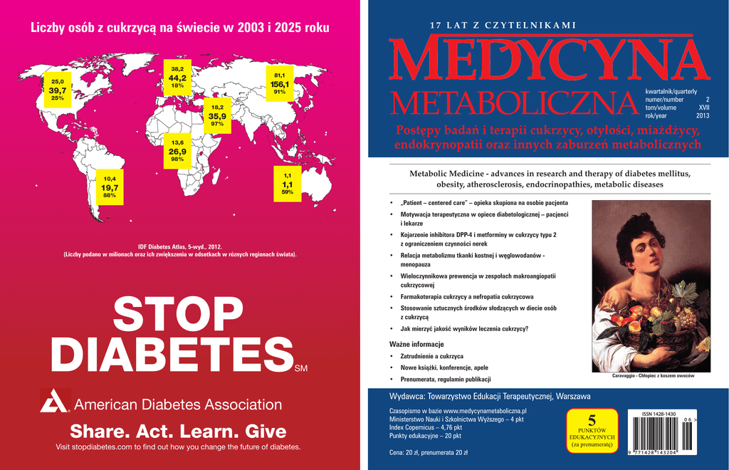 Liczbyosóbzcukrzycąnaświeciew2003i2025roku 38,2 81,1 44,2 25,0 156,1 18% 39,7 1 7 L AT Z C Z Y T E L N I K A M I kwartalnik/quarterly numer/number 2 tom/volume XVII rok/year 2013 91% 25% 18,2 35,9 97% 13,6 26,9 98% 10,4 19,7 88% Metabolic Medicine - advances in research and therapy of diabetes mellitus, obesity, atherosclerosis, endocrinopathies, metabolic diseases 1,1 1,1 59% • „Patient–centeredcare”–opiekaskupionanaosobiepacjenta • Motywacjaterapeutycznawopiecediabetologicznej–pacjenci ilekarze IDFDiabetesAtlas,5-wyd.,2012. (Liczbypodanowmilionachorazichzwiększeniawodsetkachwróznychregionachświata). STOP DIABETES SM American Diabetes Association Share. Act. Learn. Give Visit stopdiabetes.com to find out how you change the future of diabetes. • KojarzenieinhibitoraDPP-4imetforminywcukrzycytypu2 zograniczeniemczynnościnerek • Relacjametabolizmutkankikostnejiwęglowodanów- menopauza • Wieloczynnikowaprewencjawzespołachmakroangiopatii cukrzycowej • Farmakoterapiacukrzycyanefropatiacukrzycowa • Stosowaniesztucznychśrodkówsłodzącychwdiecieosób zcukrzycą • Jakmierzyćjakośćwynikówleczeniacukrzycy? Ważneinformacje • Zatrudnienieacukrzyca • Noweksiążki,konferencje,apele • Prenumerata,regulaminpublikacji Wydawca: Towarzystwo Edukacji Terapeutycznej, Warszawa Czasopismo w bazie www.medycynametaboliczna.pl Ministerstwo Nauki i Szkolnictwa Wyższego – 4 pkt Index Copernicus – 4,76 pkt Punkty edukacyjne – 20 pkt Cena: 20 zł, prenumerata 20 zł Caravaggio-Chłopieczkoszemowoców Nowaksiążka Przedstawienie Wydawnictwa Polskiego Towarzystwa Kardiodiabetologicznego, Towarzystwa Edukacji Terapeutycznej opracowanego przez Grupę Roboczą Specjalistów diabetologów, kardiologów i angiologów pod kierownictwem prof. zw dr. hab. n. med. Jana Tatonia i prof. dr hab. n. med. Anny Czech z Warszawskiego Uniwersytetu Medycznego pt. „Podręcznik opieki angiometabolicznej”. ważna dla Twojej kompleksowej praktyki lekarskiej! Jantatoń,AnnaCzech,Małgorzatabernas ZofiaSzczeklik-Kumala,ewabiernacka Monografia naukowo-zawodowa „Socjologiacukrzycy” opiekamedycznaskupionanaosobiepacjenta Czytajcie innowacyjną dla praktyki diabetologicznej książkę„Socjologiacukrzycy” (J.tatoń,A.Czech,M.bernas,Z.Szczeklik-Kumala,e.biernacka, wyd.esculap,Łódź,2013,str.1-406). Zgodnie z międzynarodową rekomendacją (ADA, EASD, IDF, PTD) „patient-centered care” - opieki diabetologicznej skupionej na osobie pacjenta. Książka wskazuje jak wbudować socjologię do codziennej praktyki opieki diabetologicznej. Wydano pod patronatem Towarzystwa Edukacji Terapeutycznej, Warszawa oraz Sekcji Spolecznej Polskiego Towarzystwa Diabetologicznego. Do nabycia – wyd. Esculap, 90-361 Łódź, ul. Piotrkowska 276, tel. 42/665 03 50, [email protected] lub korespondencyjnie pod adresem redakcji „Medycyny Metabolicznej” - ul. Płocka 15C/73, 01-231 Warszawa, (e-mail: j.taton@ interia.pl), cena 40 zł. PoDRęCZNIKoPIeKI ANgIoMetAboLICZNeJ Prewencjamiażdżycyijejpowikłańwsubpopulacjiosób zcukrzycą,stanemprzedcukrzycowym izespołemmetabolicznym Standardypostępowaniadlalekarzypraktyków wydano pod patronatem Polskiego Towarzystwa Kardiodiabetologicznego oraz Towarzystwa Edukacji Terapeutycznej, Warszawa, Medycyna Metaboliczna nr 3/2013 (2) „Przegląd Kardiodiabetologiczny”, Supl. 1/2013 (1). Opracowanie obejmuje patofizjologiczne ujęte systematycznie standardy postępowania prewencyjnego i leczniczego, w tym farmakologicznego w zakresie wszystkich znaczących czynników ryzyka chorób sercowo-naczyniowych i chorób naczyniowych innych narządów. Zasługuje na upowszechnienie i uzyskanie dodatkowych, nowych informacji od farmakologów i producentów odpowiednich leków. (Wyd. Termedia (1) i Towarzystwo Edukacji Terapeutycznej (2). Medycyna Metaboliczna Rok 2013 Tom XVII RADA NAUKOWA I PROGRAMOWA REDAKCJA Redaktorzy Naczelni: Członkowie Redakcji: Adres Redakcji i Wydawcy WARUNKI PRENUMERAty Nr 2 prof. dr hab. med. Jean-Philippe ASSAL (Szwajcaria) doc. dr Rudolf CHLUP (Czechy) prof. dr hab. med. Barbara CYBULSKA (Warszawa) prof. dr med. John DAY (Anglia) prof. dr hab. Aldona DEMBIŃSKA-KlEĆ (Kraków) prof. dr med. Marek GRZYWA (Rzeszów) prof. dr med. Markolf HANEFELD (Niemcy) prof. dr hab. med. Franciszek KOKOT (Katowice) prof. dr Ingrid MÜLHAUSER (Niemcy) prof. dr med. Arne MELANDER (Szwecja) prof. dr hab. med. Kazimierz OSTROWSKI (Warszawa) prof. dr hab. med. Daniel POMETTA (Genewa) prof. dr hab. med. Danuta PUPEK-MUSIALIK (Poznań) prof. dr med. Jan SKRHA (Czechy) prof. dr hab. med. Jan Tatoń prof. dr hah. med. Anna Czech prof. dr hab. med. Elżbieta Bandurska-Stankiewicz dr med. Małgorzata Bernas dr hab. med. Mariusz Jasik prof. dr hab. med. Waldemar Karnafel dr med. Marek Kowrach dr med Zofia Szczeklik-Kumala ul. Płocka 15C/73, 01-237 Warszawa Towarzystwo Edukacji Terapeutycznej (c/o J. Tatoń) [email protected] tel. kom. 506-203-860 Prenumerata: ul. Płocka 15C/73, 01-231 Warszawa cena pojedynczego numeru – 20 zł. Koszty wysyłki pisma do prenumeratora ponosi Wydawca. Wpłaty na prenumeratę należy dokonywać na konto TET: 04 1020 1013 0000 0202 0128 2748. Zastrzegamy prawo redagowania i skracania nadesłanych tekstów. Nie ponosimy odpowiedzialności za treść zamieszczonych reklam i ogłoszeń. Medycyna Metaboliczna, 2013, tom XVII, nr 2 www.medycynametaboliczna.pl 3 OD REDAKCJI EDItORIAls ORyGINAlNE PRACE bADAWCzE Jan Tatoń: Personalization of diabetes mellitus care as the way to better patients quality of therapeutic out-comes and quality of life � � � � � � � � � � � � � � � � � � � � � � � � � � � � � � � � � � � � � � � � � � � � � � � � � � � 8 Anna Czech: How to create and increase the therapeutic motivation (empowerment) for pro-health behavior and actions of persons with diabetes mellitus? � � � � � � � � � � 