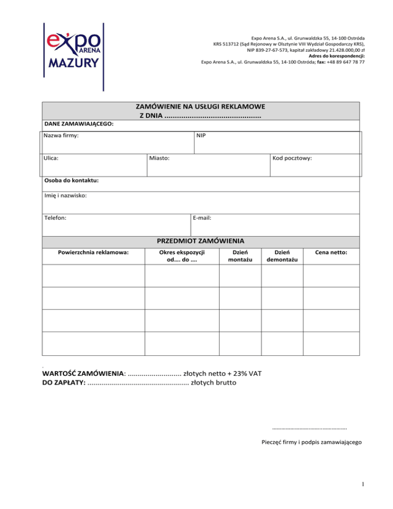 Expo Arena S.A., ul. Grunwaldzka 55, 14-100 Ostróda KRS 513712 (Sąd Rejonowy w Olsztynie VIII Wydział Gospodarczy KRS), NIP 839-27-67-573, kapitał zakładowy 21.428.000,00 zł Adres do korespondencji: Expo Arena S.A., ul. Grunwaldzka 55, 14-100 Ostróda; fax: +48 89 647 78 77 ZAMÓWIENIE NA USŁUGI REKLAMOWE Z DNIA .............................................. DANE ZAMAWIAJĄCEGO: Nazwa firmy: Ulica: NIP Miasto: Kod pocztowy: Osoba do kontaktu: Imię i nazwisko: Telefon: E-mail: PRZEDMIOT ZAMÓWIENIA Powierzchnia reklamowa: Okres ekspozycji od…. do …. Dzień montażu Dzień demontażu Cena netto: . WARTOŚĆ ZAMÓWIENIA: ........................... złotych netto + 23% VAT DO ZAPŁATY: ................................................... złotych brutto …………………….……..……………. Pieczęć firmy i podpis zamawiającego 1