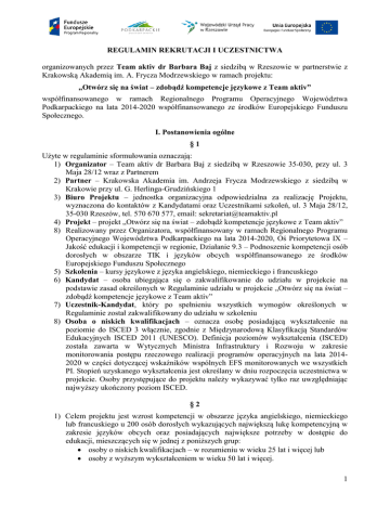 REGULAMIN REKRUTACJI I UCZESTNICTWA organizowanych przez Team aktiv dr Barbara Baj z siedzibą w Rzeszowie w partnerstwie z Krakowską Akademią im. A. Frycza Modrzewskiego w ramach projektu: „Otwórz się na świat – zdobądź kompetencje językowe z Team aktiv” współfinansowanego w ramach Regionalnego Programu Operacyjnego Województwa Podkarpackiego na lata 2014-2020 współfinansowanego ze środków Europejskiego Funduszu Społecznego. I. Postanowienia ogólne §1 Użyte w regulaminie sformułowania oznaczają: 1) Organizator – Team aktiv dr Barbara Baj z siedzibą w Rzeszowie 35-030, przy ul. 3 Maja 28/12 wraz z Partnerem 2) Partner – Krakowska Akademia im. Andrzeja Frycza Modrzewskiego z siedzibą w Krakowie przy ul. G. Herlinga-Grudzińskiego 1 3) Biuro Projektu – jednostka organizacyjna odpowiedzialna za realizację Projektu, wyznaczona do kontaktów z Kandydatami oraz Uczestnikami szkoleń, ul. 3 Maja 28/12, 35-030 Rzeszów, tel. 570 670 577, email: [email protected] 4) Projekt – projekt „Otwórz się na świat – zdobądź kompetencje językowe z Team aktiv” 8) Realizowany przez Organizatora, współfinansowany w ramach Regionalnego Programu Operacyjnego Województwa Podkarpackiego na lata 2014-2020, Oś Priorytetowa IX – Jakość edukacji i kompetencji w regionie, Działanie 9.3 – Podnoszenie kompetencji osób dorosłych w obszarze TIK i języków obcych współfinansowanego ze środków Europejskiego Funduszu Społecznego 5) Szkolenia – kursy językowe z języka angielskiego, niemieckiego i francuskiego 6) Kandydat – osoba ubiegająca się o zakwalifikowanie do udziału w projekcie na podstawie zasad określonych w Regulaminie udziału w projekcie „Otwórz się na świat – zdobądź kompetencje językowe z Team aktiv” 7) Uczestnik-Kandydat, który po spełnieniu wszystkich wymogów określonych w Regulaminie został zakwalifikowany do udziału w szkoleniu 8) Osoba o niskich kwalifikacjach – oznacza osobę posiadającą wykształcenie na poziomie do ISCED 3 włącznie, zgodnie z Międzynarodową Klasyfikacją Standardów Edukacyjnych ISCED 2011 (UNESCO). Definicja poziomów wykształcenia (ISCED) została zawarta w Wytycznych Ministra Infrastruktury i Rozwoju w zakresie monitorowania postępu rzeczowego realizacji programów operacyjnych na lata 20142020 w części dotyczącej wskaźników wspólnych EFS monitorowanych we wszystkich PI. Stopień uzyskanego wykształcenia jest określany w dniu rozpoczęcia uczestnictwa w projekcie. Osoby przystępujące do projektu należy wykazywać tylko raz uwzględniając najwyższy ukończony poziom ISCED. §2 1) Celem projektu jest wzrost kompetencji w obszarze języka angielskiego, niemieckiego lub francuskiego u 200 osób dorosłych wykazujących największą lukę kompetencyjną w zakresie języków obcych oraz posiadających największe potrzeby w dostępie do edukacji, mieszczących się w jednej z poniższych grup: osoby o niskich kwalifikacjach – w rozumieniu w wieku 25 lat i więcej lub osoby z wyższym wykształceniem w wieku 50 lat i więcej. 1 2) Wsparciem w ramach projektu zostaną objęte wyłącznie osoby, które uczą się, pracują lub zamieszkują na obszarze woj. podkarpackiego, są z własnej inicjatywy zainteresowane zdobyciem, podniesieniem lub uzupełnieniem umiejętności i kompetencji językowych. 3) Projekt jest realizowany w okresie od 01.01.2017 r. do 30.09.2018 r. 4) Realizowane kursy będą obejmować poziomy od A1 do B2 i zakończą się egzaminem zewnętrznym potwierdzającym zdobyte kwalifikacje i otrzymaniem certyfikatu (powszechnie uznawany certyfikat międzynarodowy). 5) Liczba uczestników w grupie wynosić będzie maksymalnie 12 osób. 6) Projekt przewiduje przeprowadzenie po 9 edycji kursów z języka angielskiego i niemieckiego oraz dwie edycje kursów języka francuskiego przygotowujących do zewnętrznych egzaminów certyfikacyjnych. 7) Zajęcia będą odbywały się 2 razy w tygodniu w dni powszednie w godzinach popołudniowych, bądź raz w tygodniu w soboty (lub inny dzień) w miejscach ustalonych przez Organizatora. 8) O terminach i miejscach odbywania się zajęć Organizator będzie informował na stronie internetowej projekt www.teamaktiv.pl 9) Kurs językowy trwa 120 godzin szkoleniowych, a zajęcia prowadzone będą na czterech poziomach znajomości języka angielskiego, niemieckiego i francuskiego A1, A2, B1 i B2 wg klasyfikacji Europejskiego Systemu Opisu Kształcenia Językowego. 10) O przynależności do konkretnego poziomu kursu decydować będą wyniki testu kwalifikacyjnego. 11) Udział w kursach wymaga opłacenia opłaty wpisowej w wysokości 100 zł od każdego uczestnika. Pozostałe koszty współfinansowane są z Europejskiego Funduszu Społecznego i budżetu państwa. 12) Każdy kurs kończy się testem sprawdzającym wiedzę i umiejętności Uczestników oraz egzaminem zewnętrznym. 13) Każdy uczestnik po zakończeniu kursu ma obowiązek podejścia do zewnętrznego egzaminu certyfikującego (poziom biegłości zgodny z Europejskim Systemem Opisu Kształcenia Językowego). Egzamin będzie przeprowadzony w Studium Języków Obcych Politechniki Rzeszowskiej. 14) W przypadku negatywnej oceny z egzaminów Uczestnik nie zwraca Organizatorowi kosztów egzaminacyjnych ani innych kosztów związanych z uczestnictwem w kursie. 15) Każdy Uczestnik kursu otrzyma podręcznik. 16) Organizator pokrywa następujące koszty związane ze szkoleniem: wynagrodzenie trenerów, koszty wynajmu sal szkoleniowych, koszty materiałów szkoleniowych i dydaktycznych, koszty egzaminów zewnętrznych. 17) Zajęcia odbywać się będą w salach bez utrudnień architektonicznych, z dostępem dla osób niepełnosprawnych. 18) Kursy odbywać się będą według określonych standardów – poziomów biegłości językowej Rady Europy, a każdy uczestnik otrzyma informacje o procesie nauczania i umiejętnościach jakie powinien uzyskać po zakończeniu kursu. 19) Dla ka