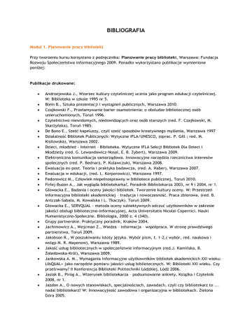 BIBLIOGRAFIA Moduł 1. Planowanie pracy biblioteki Przy tworzeniu kursu korzystano z podręcznika: Planowanie pracy biblioteki, Warszawa: Fundacja Rozwoju Społeczeństwa informacyjnego 2009. Ponadto wykorzystano publikacje wymienione poniżej: Publikacje drukowane: Andrzejewska J., Wzorzec kultury czytelniczej ucznia jako program edukacji czytelniczej. W: Biblioteka w szkole 1995 nr 5. Blein B., Sztuka prezentacji i wystąpień publicznych, Warszawa 2010. Czajkowski F., Przełamywanie barier osamotnienia: o obsłudze bibliotecznej osób unieruchomionych, Toruń 1996. Czytelnictwo niewidomych, niedowidzących oraz osób starszych (red. F. Czajkowski, M. Skarżyńska), Toruń 1985. De Bono E., Sześć kapeluszy, czyli sześć sposobów kreatywnego myślenia, Warszawa 1997 Działalność Bibliotek Publicznych: Wytyczne IFLA/UNESCO, (oprac. P. Gill ; red. M. Kisilowska), Warszawa 2002. Dzieci, młodzież - Internet - Biblioteka. Wytyczne IFLA Sekcji Bibliotek Dla Dzieci i Młodzieży (red. G. Lewandowicz-Nosal, E. B. Zybert), Warszawa 2009. Elektroniczna komunikacja samorządowa. Innowacyjne narzędzia rzecznictwa interesów społecznych (red. P. Bednarz, P. Kulawczuk), Warszawa 2008. Ewaluacja ex-post. Teoria i praktyka badawcza, (red. A. Haber), Warszawa 2007. Ewaluacja w edukacji, (red. L. Korporowicz), Warszawa 1997. Fedorowicz M., Człowiek niepełnosprawny w bibliotece publicznej, Toruń 2010. Firlej-Buzon A., Jak wygląda bibliotekarka?, Poradnik Bibliotekarza 2003, nr 9 i 2004, nr 1. Głowacka E., Badania i oceny jakości bibliotek. Tworzenie kultury oceny. W: Przestrzeń informacyjna biblioteki akademickiej – tradycja i nowoczesność. Praca zbiorowa. (red. B. Antczak-Sabala, M. Kowalska i L. Tkaczyk). Toruń 2009. Głowacka E., SERVQUAL - metoda oceny subiektywnych odczuć użytkowników w zakresie jakości obsługi biblioteczno-informacyjnej, Acta Universitatis Nicolai Copernici. Nauki Humanistyczno-Społeczne. Bibliologia, 2000 z. 4 (340). Grupy partnerskie. Praktyczny poradnik, Kraków 2004. Jachimowicz A., Wejcman Z., Wiedza – informacja – współpraca. W stronę prawdziwego partnerstwa, Toruń 2009. Jakobson R., W poszukiwaniu istoty języka. Wybór pism, t. 1-2,( wybór, red. naukowa i wstęp M. R. Mayenow), Warszawa 1989. Jakość usług bibliotecznych w społeczeństwie informacyjnym (red.J. Kamińska, B. Żołedowska-Król), Warszawa 2009. Jankowska A. M., Wymagania informacyjne użytkowników bibliotek akademickich XXI wieku: LibQUAL+ jako narzędzie pomiaru jakości usług bibliotecznych. W: Biblioteki XXI wieku. Czy przetrwamy? II Konferencja Biblioteki Politechniki Łódzkiej, Łódź 2006. Jasiak B., Piróg A., Wizerunek bibliotekarza – podsumowanie ankiety, Książka i Czytelnik 2008, nr 1. Jazdon A., O nowych stanowiskach, specjalnościach, zawodach, czyli czy bibliotekarz to ... nadal bibliotekarz? W: Innowacyjność zawodowa i organizacyjna w bibliotekach. Zielona Góra 2005. Kanczak A., Szołtysik K., Czy w bibliotece XXI wieku jest miejsce dla bibliotekarza? W: Biblioteki XXI wieku. Czy przetrwamy? II Konferencja Biblioteki Politechniki Łódzkiej, Łódź 2006. Kruszewski T., Wizerunek bibliotekarzy w opiniach ich następców, Bibliotekarz 2005, nr 10. Kształtowanie wizerunku biblioteki (red. M. Czyżewska), Białystok 2007. Lemmermann H., Szkoła dyskutowania: techniki argumentacji, dyskusje, dialogi, Wrocław [2007]. Majewska M., Kompetencje bibliotekarza wobec zmian społecznych i edukacyjnych. W: Biblioteka w społeczeństwie informacyjnym: edukacja – informacja – media (red. M. Drzewiecki i M. Majewska). Warszawa 2005. Morreale S. P., Spitzberg B. H., Barge K. J., Komunikacja między ludźmi: motywacja, wiedza i umiejętności, Warszawa 2008. Nęcki Z., Komunikacja międzyludzka, Kraków 1996. Nikodemska-Wołowik A. M. Górski T. II P., Wołowik M., Nie tylko logotyp: wyróżnienie i przynależność w biznesie, Bydgoszcz-Gdańsk 2004. Nowoczesna biblioteka. Materiały z ogólnopolskiej, przedzjazdowej konferencji Stowarzyszenia Bibliotekarzy Polskich, Konstancin-Jeziorna, 29 – 30 maja 2009 r., Warszawa 2009. Pawełczyńska A., Studia nad czytelnictwem, Warszawa 1969. Pease A., Język ciała: jak czytać myśli ludzi z ich gestów, Kraków 1998. Pioterek P., Budowanie efektywnego zespołu w bibliotece, Warszawa 2008. Radlińska H., Książka wśród ludzi, Warszawa 1961. Rzecznictwo krok po kroku, Warszawa 2007. Seiwert L. J., Zarządzanie czasem: bądź panem własnego czasu, Warszawa 2005. Sekutowicz K., Monitorowanie i ewaluacja. W: Ewaluacja funduszy strukturalnych, Ministerstwo Gospodarki, Pracy i Polityki Społecznej, Warszawa 2004. Skrobiszewska H., Książki naszych dzieci, Warszawa 1997. Słońska J., Dzieci i książki, Warszawa 1958. Stuart C., Sztuka przemawiania i prezentacji, Warszawa 2006. Świerczyńska-Jelonek D., Wybory czytelnicze dzieci i młodzieży. Poradnik bibliotekarza 2002, nr 4. Wajda A., Metodyka i organizacja czytelnictwa, Warszawa,1983. Wizerunek bibliotekarza (red. J. Czyrek, B. Górna), Wrocław 2006. Wojciechowski J., Czytelnictwo, Kraków 1989. Wojciechowski J., Praca z użytkownikiem w bibliotece, Warszawa 2000 Wolff K., Badania czytelnictwa wobec potrzeb nowoczesnej biblioteki w społeczeństwie wiedzy, Biuletyn Informacyjny Biblioteki Narodowej 2005, nr 2. Wolff K., Po co badania czytelnictwa? Kilka refleksji bibliotekarzom pod rozwagę. W: Wokół biblioteki. Forum Czytelnicze III, Warszawa 1996. Wolff K., Potrzeby i oczekiwania czytelników wobec bibliotek - w świetle badań. W: Sieć bibliotek publicznych wobec potrzeb społeczeństwa informacyjnego, Warszawa 2006. Woźniczka-Paruzel B., Osoby z niesprawnościami czytelniczymi w bibliotece – sygnalizacja problemu, Acta Universitatis Nicolai Copernici. Bibliologia IV, Toruń 2000. Zybert E. B., Praca w środowisku niepełnosprawnych W: Biblioteka w otoczeniu społecznym (red. E. B. Zybert), Warszawa 2000. Bibliotekarstwo (red. Z. Żmigrodzki), Warsz