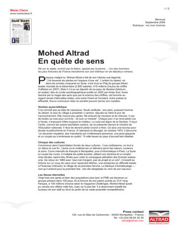 1/2 Marie Claire www.marieclaire.fr Mensuel Septembre 2008 Rubrique : mc mon homme Mohed Altrad En quête de sens Né sur le sable, enrichi par le béton, apaisé par la plume… l’un des hommes les plus fortunés de France transforme son exil intérieur en de fabuleux romans. P resque malgré lui, Mohed Altrad a fait de son histoire une légende. “J’ai traversé les siècles en l’espace d’une vie”. L’enfant du désert, né dans les années cinquante en Syrie, s’est mué en Pdg de groupe Altrad, leader mondial de la bétonnière (2 800 salariés, 419 millions d’euros de chiffre d’affaires en 2007). Mais il n’a pu se départir de sa peau de Badawi (bédouin, en arabe), titre du conte autobiographique publié en 2002 par Actes Sud. Aussi fasciné par la magie des sens que par la science des chiffres, cet homme au regard rempli d’étincelles tristes, erre entre Orient et Occident, entre poésie et efficacité. Aucun curriculum vitae ne semble pouvoir percer son mystère. Genèse quasi-biblique Il ne connaît pas sa date de naissance. Seule certitude : son père, puissant homme du désert, le seul du village à posséder u camion, répudia sa mère le jour de l’accouchement. Elle mourut peu après. Né entouré de moutons et de chèvres, il use de toutes sa ruse pour survivre. “Je suis un miracle”. Chaque jour, il se rend pieds nus à l’école, s’imposant d’être toujours le meilleur. La suite est digne de la Genèse. Il reçut l’ordre, comme les autres bacheliers syriens, de se présenter devant le ministre de l’Éducation nationale. Il rêve de devenir pilote d’avion à Kiev. Ce sera une bourse pour étudier la pétrochimie en France. À l’aéroport du Bourget, en octobre 1970, il découvre “un douanier impatient, des mendiants qui n’intéressent personne, une pluie glaçante et un couple qui s’embrasse en public”. À mille lieues du pays d’accueil tant idéalisé. Choque des cultures Commence alors l’assimilation forcée de deux cultures : l’une cartésienne, où tout a un début et une fin ; l’autre où le matériel est un élément parmi les odeurs, couleurs et sons. Cours intensifs de français à Montpellier, puis d’informatique à Paris. La Syrie lui coupe les vivres. Il multiplie les petits boulots, obtient son doctorat et un emploi chez Alcatel, rejoint Abu Dhabi pour créer la compagnie pétrolière des Emirats arabes unis. De retour en 1985 avec “pas mal d’argent, pas de projet et un ami”, il investit sa fortune sur un coup de cœur pour reprendre Mefran, une entreprise en difficulté basée à Florensac (Hérault), le village de sa première femme. La fabrique d’échafaudage — mot qu’il entend pour la première fois - est vite rebaptisée du nom de son sauveur. Les Noces éternelles Vingt trois ans après et bien des acquisitions plus tard, la PME est devenue un groupe présent dans 100 pays. Et la fortune de son patron pointe au 313e rang français, à 105 millions d’euros selon le magazine Challenges. Mohed Altrad aurait pu vendre son affaire mille fois, mais ne l’a pas fait. Il a récemment installé les bureaux de son staff au fond du jardin de sa vaste propriété montpelliéraine. Press contact 125, rue du Mas de Carbonnier - 34000 Montpellier - France Tel. +33 (0)4 99 64 30 39 [email protected] www.altrad.com/ 2/2 Marie Claire www.marieclaire.fr Mensuel Septembre 2008 Rubrique : mc mon homme Car pour lui, l’essentiel est ailleurs. “Tellement de choses ici nous ramènent au concret. alors, je m’évade dans la culture. Je rêve beaucoup”. Et il écrit, dans les avions et hôtels. Après Badawi, réel succès de librairie, il publie L’Hypothèse de Dieu en 2006. “Un livre un peu mystique sur l’exil. Le public a moins adhéré”. Depuis un an, il travaille à l’écriture d’une œuvre ambitieuse de 700 pages dont le titre provisoire est Les Noces éternelles. Qui se veut une synthèse de l’amour à travers les siècles en sept chapitres. Et devrait l’accaparer pendant encore une année. Press contact 125, rue du Mas de Carbonnier - 34000 Montpellier - France Tel. +33 (0)4 99 64 30 39 [email protected] www.altrad.com/