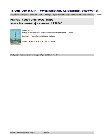 Utworzono Antykwariat : 02 marzec 2017 BARBARA H.U.P. - Wydawnictwo, Księgarnia, Antykwariat > Przyroda i turystyka > Mapy > Francja. Część ołudniowa, mapa samochodowo-krajoznawcza, 1:750000 Francja. Część ołudniowa, mapa samochodowo-krajoznawcza, 1:750000 Model : 131211 Francja. Część ołudniowa, mapa samochodowo-krajoznawcza, 1:750000 Producent : Polskie Przedsiębiorstwo Wydawni Cena : 2,00 zł Brutto ( 1,63 zł Netto) Dostępność: Produkt dostępny w naszym sklepie od 10 kwiecień 2015 kontakt : - [email protected] Strona 1