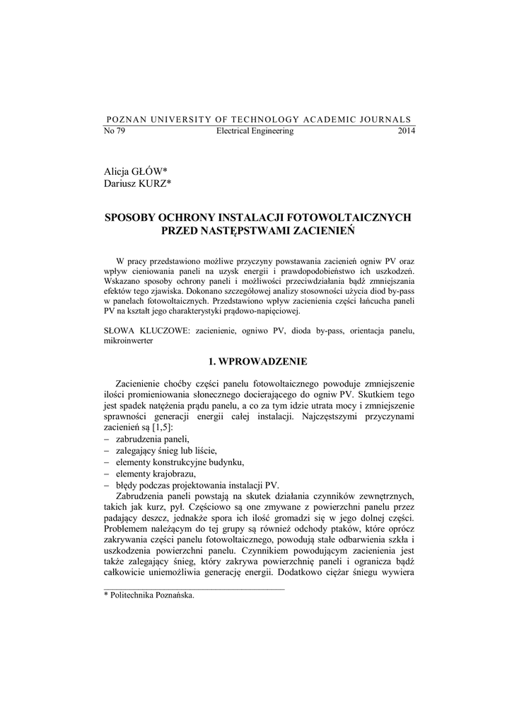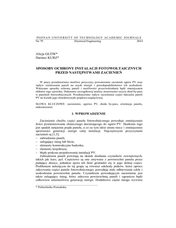 P O Z N A N UN I VE RS I T Y O F T E C HN O L O G Y ACA D E MI C J O URN A L S No 79 Electrical Engineering 2014 Alicja GŁÓW* Dariusz KURZ* SPOSOBY OCHRONY INSTALACJI FOTOWOLTAICZNYCH PRZED NASTĘPSTWAMI ZACIENIEŃ W pracy przedstawiono możliwe przyczyny powstawania zacienień ogniw PV oraz wpływ cieniowania paneli na uzysk energii i prawdopodobieństwo ich uszkodzeń. Wskazano sposoby ochrony paneli i możliwości przeciwdziałania bądź zmniejszania efektów tego zjawiska. Dokonano szczegółowej analizy stosowności użycia diod by-pass w panelach fotowoltaicznych. Przedstawiono wpływ zacienienia części łańcucha paneli PV na kształt jego charakterystyki prądowo-napięciowej. SŁOWA KLUCZOWE: zacienienie, ogniwo PV, dioda by-pass, orientacja panelu, mikroinwerter 1. WPROWADZENIE Zacienienie choćby części panelu fotowoltaicznego powoduje zmniejszenie ilości promieniowania słonecznego docierającego do ogniw PV. Skutkiem tego jest spadek natężenia prądu panelu, a co za tym idzie utrata mocy i zmniejszenie sprawności generacji energii całej instalacji. Najczęstszymi przyczynami zacienień są [1,5]: zabrudzenia paneli, zalegający śnieg lub liście, elementy konstrukcyjne budynku, elementy krajobrazu, błędy podczas projektowania instalacji PV. Zabrudzenia paneli powstają na skutek działania czynników zewnętrznych, takich jak kurz, pył. Częściowo są one zmywane z powierzchni panelu przez padający deszcz, jednakże spora ich ilość gromadzi się w jego dolnej części. Problemem należącym do tej grupy są również odchody ptaków, które oprócz zakrywania części panelu fotowoltaicznego, powodują stałe odbarwienia szkła i uszkodzenia powierzchni panelu. Czynnikiem powodującym zacienienia jest także zalegający śnieg, który zakrywa powierzchnię paneli i ogranicza bądź całkowicie uniemożliwia generację energii. Dodatkowo ciężar śniegu wywiera __________________________________________ * Politechnika Poznańska. 114 Alicja Głów, Dariusz Kurz nacisk na panele i konstrukcję wsporczą, co może prowadzić do uszkodzeń mechanicznych instalacji. Kolejną grupą, wpływającą na obecność zacienień, są błędy podczas projektowania instalacji, polegające na nieuwzględnieniu istniejących stałych elementów konstrukcyjnych budynku, takich jak: kominy, jaskółki, wykusze czy elementy najbliższego otoczenia (inne budynki, słupy, drzewa itp.) [5]. Eliminacja wszystkich szkodliwych czynników, powodujących ograniczenie powierzchni światłoprzepuszczalnej paneli, nie jest możliwa, dlatego można zastosować pewne rozwiązania, mające na celu całkowite bądź częściowe niwelowanie skutków zacienień. Można w tej grupie wyróżnić m.in.: cykliczne czyszczenie paneli, umieszczenie w konstrukcji panelu fotowoltaicznego diod by-pass, odpowiedni projekt instalacji uwzględniający stałe elementy otoczenia, prawidłowe ustawienie paneli (pionowe/poziome), właściwa konfiguracja połączeń paneli w tzw. stringi, stosowanie inwerterów z wieloma trackerami MPP bądź mikroinwerterów. Zastosowanie się do przedstawionych wytycznych wyeliminuje wiele sytuacji, mogących powodować zacienienia ogniw i straty w procesie generacji energii. Wpłynie to na podwyższenie sprawności pracy instalacji PV, co wiąże się z ograniczeniem strat ekonomicznych. 2. DIODY BY-PASS Obecnie jedną z możliwości przeciwdziałania efektom zacienienia ogniwa jest zastosowanie diod by-pass w konstrukcji panelu, przy połączeniach ogniw fotowoltaicznych już na etapie produkcji paneli. Diodę tę, zwaną inaczej bocznikującą, umieszcza się równolegle do łańcucha ogniw tak, aby kierunek jej polaryzacji był do nich przeciwny. Dioda zaczyna działać w panelu wówczas, gdy jedna z jego partii zostanie przysłonięta. Głównym zadaniem diody by-pass jest umożliwienie przepływu prądu, pochodzącego z pozostałych niezacienionych ogniw fotowoltaicznych panelu [2, 5]. Zasada działania diody by-pass została przedstawiona na rysunku 1, ilustrującym przepływ prądu przez ogniwa fotowoltaiczne (oznaczonym linią ciągłą) w przypadku pracy normalnej (rys. 1 a) oraz zacienienia jednego z ogniw (rys. 1 b). W układzie z rysunku 1a wszystkie diody spolaryzowane są w kierunku zaporowym, a prąd przepływa przez ogniwa spolaryzowane w kierunku przewodzenia. W drugim przypadku (rys. 1b) zasłonięte zostało czwarte ogniwo, które nie jest w stanie wygenerować takiej samej ilości prądu, co ogniwa niezacienione. Ponieważ ogniwa połączone są ze sobą szeregowo, to zacienione ogniwo dla całego układu staje się opornikiem, a przepływający przez nie z Sposoby ochrony instalacji fotowoltaicznych przed następstwami zacienień 115 pozostałych ogniw prąd jest tracony w postaci wydzielanego ciepła. Obecność prądu wstecznego w tym ogniwie powoduje zmianę jego polaryzacji, a co za tym idzie pojawienie się ujemnego napięcia, które zmienia polaryzację diody by-pass. Kiedy dioda zaczyna przewodzić, prąd pochodzący z niezacienionych ogniw, przepływa przez nią, wyłączając w ten sposób z układu zacieniony fragment panelu i eliminując straty mocy w całej instalacji fotowoltaicznej. Rys. 1. Przepływ prądu przez ogniwa fotowoltaiczne w panelu podczas [5]: a) pracy normalnej, b) zacienienia czwartego ogniwa (łańcucha ogniw) Oprócz tej najważniejszej funkcji dioda chroni także zacienione ogniwo przed uszkodzeniami powstałymi wskutek przepływu prądu wstecznego, powodującego jego bardzo mocne nagrzewanie się i powstawanie gorących punktów panelu, tzw. hot spot’ów [5, 7]. W efekcie, po ustąpieniu czasowego zacienienia, uszkodzone ogniwo nadal powodowałoby straty mocy w instalacji PV. Warto zaznaczyć, że w najpopularniejszych panelach dostępnych obecnie na rynku, składających się z trzech łańcuchów po 20-24 ogniw, stosuje się trzy diody bypass (rys. 2) [1, 3, 4, 5]. Rys. 2. Schemat ideowy panelu fotowoltaicznego z 