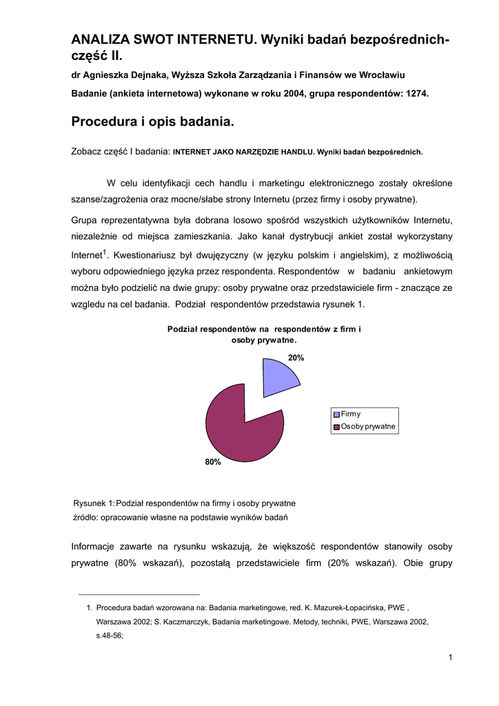 ANALIZA SWOT INTERNETU. Wyniki badań bezpośrednichczęść II. dr Agnieszka Dejnaka, Wyższa Szkoła Zarządzania i Finansów we Wrocławiu Badanie (ankieta internetowa) wykonane w roku 2004, grupa respondentów: 1274. Procedura i opis badania. Zobacz część I badania: INTERNET JAKO NARZĘDZIE HANDLU. Wyniki badań bezpośrednich. W celu identyfikacji cech handlu i marketingu elektronicznego zostały określone szanse/zagrożenia oraz mocne/słabe strony Internetu (przez firmy i osoby prywatne). Grupa reprezentatywna była dobrana losowo spośród wszystkich użytkowników Internetu, niezależnie od miejsca zamieszkania. Jako kanał dystrybucji ankiet został wykorzystany Internet1. Kwestionariusz był dwujęzyczny (w języku polskim i angielskim), z możliwością wyboru odpowiedniego języka przez respondenta. Respondentów w badaniu ankietowym można było podzielić na dwie grupy: osoby prywatne oraz przedstawiciele firm - znaczące ze wzgledu na cel badania. Podział respondentów przedstawia rysunek 1. Podział respondentów na respondentów z firm i osoby prywatne. 20% Firmy Osoby prywatne 80% Rysunek 1: Podział respondentów na firmy i osoby prywatne źródło: opracowanie własne na podstawie wyników badań Informacje zawarte na rysunku wskazują, że większość respondentów stanowiły osoby prywatne (80% wskazań), pozostałą przedstawiciele firm (20% wskazań). Obie grupy 1. Procedura badań wzorowana na: Badania marketingowe, red. K. Mazurek-Łopacińska, PWE , Warszawa 2002; S. Kaczmarczyk, Badania marketingowe. Metody, techniki, PWE, Warszawa 2002, s.48-56; 1 badanych będą analizowane pod względem udzielanych w kwestionariuszu odpowiedzi na temat preferencji działań handlu i marketingu na rynku elektronicznym. Identyfikacja cech Internetu i uzyskanie opinii respondentów o Internecie było kolejnym celem badania ankietowego. Respondenci w trakcie badania poszczególne działania na rynku elektronicznym określali jako szansę lub zagrożenia rozwoju Internetu. Badanymi cechami były: wprowadzenie opłat za korzystanie z serwisów informacyjnych oraz internetowych baz danych, podpis elektroniczny wymagany od każdego użytkownika Internetu, rezerwacja działań w Internecie wyłącznie dla firm oraz wprowadzenie precyzyjnych przepisów prawnych regulujących działanie Internetu. Rozkład wskazań respondentów przedstawia rysunek 2. Szanse i zagrożenia rozwoju Internetu według wskazań respondentów Wprowadzenie opłat za korzystanie z serwisów informacyjnych i internetowych baz danych Podpis elektroniczny wymagany od każdego użytkownika Internetu Rezerwacje działań w Internecie wyłącznie dla firm Wprowadzenie precyzyjnych przepisów prawnych regulujących działanie Internetu 0% 10% 20% 30% szansa 40% 50% zagrożenie 60% 70% 80% 90% 100% jest mi obojętne Rysunek 2: Szanse i zagrożenia rozwoju Internetu według wskazań respondentów źródło: opracowanie własne na podstawie wyników badań Na przedstawionym rysunku widoczne jest, iż wprowadzenie opłat za korzystanie z serwisów informacyjnych i internetowych baz danych zostało uznane za zagrożenie rozwoju Internetu przez 43% respondentów. Zagrożeniami zostały także uznane przez respondentów: rezerwacja działań w Internecie wyłącznie dla firm (59% wskazań) oraz podpis elektroniczny wymagany od każdego użytkownika Internetu (66% wskazań). Szansą rozwoju Internetu okazało się wprowadzenie precyzyjnych przepisów prawnych regulujących jego działanie (60% wskazań). 2 Respondenci w trakcie badania określali także podane cechy jako mocną lub słabą stronę Internetu. Badanymi cechami były: obsługa klienta bez bezpośredniego kontaktu ze sprzedawcą, anonimowość w Internecie, płatność kartami kredytowymi oraz duża ilość informacji pozyskiwanych z Internetu. Rozkład wskazań respondentów przedstawia rysunek 3. Mocne i słabe strony Internetu według wskazań respondentów Obsługa klienta bez bezpośredniego kontaktu ze sprzedawcą. Anonimowość w Internecie Płatność kartami kredytowymi Duża ilość informacji pozyskiwanych z Internetu 0% 10% 20% 30% mocna strona 40% 50% 60% słaba strona 70% 80% 90% 100% jest mi obojętne Rysunek 3: Mocne i słabe strony Internetu wskazane przez respondentów źródło: opracowanie własne na podstawie wyników badań Z przedstawionego wykresu wynika, że mocne strony Internetu, na które wskazali respondenci, to duża ilość informacji pozyskiwanych z Internetu (76% wskazań) oraz anonimowość w Internecie (46% wskazań). Słabą stroną Internetu okazała się płatność kartami kredytowymi (78% wskazań). Obsługa klienta bez bezpośredniego kontaktu ze sprzedawcą okazała się dla 88% respondentów bez znaczenia. Ogólny rozkład analizy SWOT Internetu przedstawia się następująco (tabela 1). 3 SZANSE ZAGROŻENIA - wprowadzenie precyzyjnych przepisów - podpis elektroniczny wymagany od każdego prawnych regulujących działanie Internetu (60% użytkownika Internetu (66% wskazań wskazań respondentów), respopndentów), - rezerwacja działań w Internecie wyłącznie dla firm (59% wskazań respondentów), - wprowadzenie opłat za korzystnie z serwisów informacyjnych oraz interentowych baz danych (43% wskazań respondentów), MOCNE STRONY SŁABE STRONY - duża ilość informacji pozyskiwanych z Internetu - płatności kartami kredytowymi (78% wskazań (76% wskazań respondentow), respondentów), - anonimowość w Internecie (46% wskazań respondentów), Tabela 1: Analiza SWOT Internetu według wskazań respondentów źródło: opracowanie własne na podstawie wyników badań Podsumowując można stwierdzić, że szansą rozwoju Internetu jest wprowadzenie przepisów regulujących jego działanie. Zagrożeniem jest podpis elektroniczny wymagany od każdego użytkownika Internetu i rezerwacja działań wyłącznie dla firm. Możliwościami rozwoju Internetu jest duża ilość informacji pozyskiwanych z Internetu i info