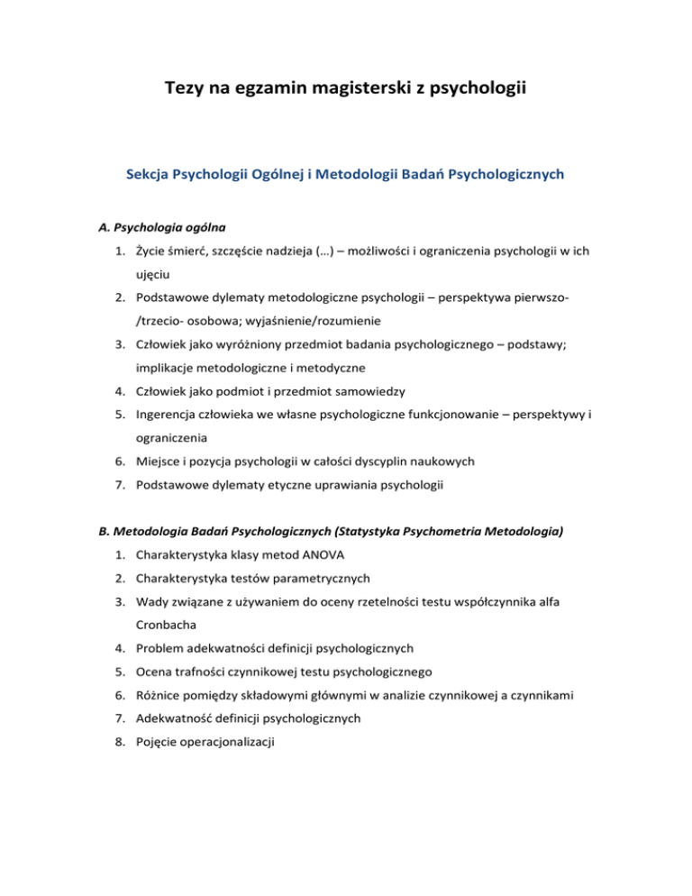 Tezy na egzamin magisterski z psychologii Sekcja Psychologii Ogólnej i Metodologii Badań Psychologicznych A. Psychologia ogólna 1. Życie śmierć, szczęście nadzieja (…) – możliwości i ograniczenia psychologii w ich ujęciu 2. Podstawowe dylematy metodologiczne psychologii – perspektywa pierwszo/trzecio- osobowa; wyjaśnienie/rozumienie 3. Człowiek jako wyróżniony przedmiot badania psychologicznego – podstawy; implikacje metodologiczne i metodyczne 4. Człowiek jako podmiot i przedmiot samowiedzy 5. Ingerencja człowieka we własne psychologiczne funkcjonowanie – perspektywy i ograniczenia 6. Miejsce i pozycja psychologii w całości dyscyplin naukowych 7. Podstawowe dylematy etyczne uprawiania psychologii B. Metodologia Badań Psychologicznych (Statystyka Psychometria Metodologia) 1. Charakterystyka klasy metod ANOVA 2. Charakterystyka testów parametrycznych 3. Wady związane z używaniem do oceny rzetelności testu współczynnika alfa Cronbacha 4. Problem adekwatności definicji psychologicznych 5. Ocena trafności czynnikowej testu psychologicznego 6. Różnice pomiędzy składowymi głównymi w analizie czynnikowej a czynnikami 7. Adekwatność definicji psychologicznych 8. Pojęcie operacjonalizacji Sekcja Psychologii Klinicznej i Osobowości A. Psychologia osobowości, emocji i motywacji 1. Główne nurty interpretacyjne w psychologii osobowości 2. Sposoby analizy cech osobowości (podejścia, teorie, kontrowersje) 3. Kultura a osobowość 4. Współczesne teorie emocji – teorie oszacowania 5. Teorie „wartość – oczekiwanie” (teorie motywacji) B. Psychologia różnic indywidualnych 1. Poglądy na strukturę inteligencji w koncepcjach psychometrycznych 2. Styl poznawczy jako wymiar różnic indywidualnych 3. Uwarunkowania kompetencji społecznych 4. Osobowościowe uwarunkowania twórczości 5. Regulacyjne funkcje temperamentu C. Psychologia kliniczna 1. Przedmiot, zadania i cele psychologii klinicznej oraz obszar problemów, którymi zajmuje się psychologia kliniczna 2. Kryteria zaburzeń psychicznych, ich podział 3. Sposoby diagnozy stosowane w psychologii klinicznej 4. Obraz kliniczny i kryteria diagnostyczne zaburzeń odżywiania, zaburzeń związanych z uzależnieniem, zaburzeń tożsamości, zaburzeń okresu dzieciństwa i adolescencji 5. Zaburzenia świadomości i funkcji poznawczych Sekcja Psychologii Pracy i Stresu A. Psychologia pracy 1. Regulacyjna funkcja pracy z perspektywy psychologii idei: punitywna, instrumentalna, autoteliczna 2. Człowiek w środowisku pracy w modelu: technocentrycznym, antropocentrycznym i systemowym. 3. Zadania psychologa pracy: diagnostyczne, eksperckie, psychoterapeutyczne 4. Podobieństwa i różnice między doborem psychologicznym na stanowisko pracy selekcją z perspektywy modelowej i metodycznej 5. Pozytywne i negatywne wpływy relacji: „praca-rodzina” i „rodzina-praca” B. Psychologia organizacji i zarządzania 1. Rola czynników biograficzno-profesjonalnych (biodate) w diagnozie zdolności kierowniczych 2. Kompetencje kierownicze: techniczne, intelektualne, interpersonalne 3. Czynniki utrudniające restrukturyzację firmy: indywidualne, organizacyjne, procesualne 4. Konflikt „kultura narodowa” versus „kultura organizacyjna” 5. Czynniki psychologiczne ograniczające procesy globalizacji w okresie ponowoczesności na przykładzie nasilających się ruchów migracyjnych C. Psychologia stresu 1. Mechanizm psychologiczny zagrożenia w Transakcyjnej Teorii Stresu R. Lazarusa i S. Folkman 2. Fizjologiczne, intelektualne, emocjonalne i behawioralne reakcje na stres 3. Naukowy status pojęć: "resistance to stress" oraz "coping stress" 4. Radzenie sobie ze stresem jako: proces, strategia i styl. Różnice teoretyczne i metodyczne 5. Rodzaje i rola wsparcia społecznego w sytuacji stresu Sekcja Psychologii Rozwojowej, Wychowawczej i Rodziny A. Psychologia rozwoju człowieka 1. Stadia rozwoju myślenia ujęciu J. Piageta 2. Rozwój moralny w ujęciu J. Piageta 3. Kryzys tożsamości w okresie dorastania według E. H. Eriksona 4. Fazy w rozwoju rozumowania moralnego według L. Kohlberga 5. Kryzys przełomu połowy życia. Cechy charakterystyczne 6. Psychologiczne koncepcje mądrości 7. Starzenie się w wymiarze funkcjonowania psychicznego B. Psychologia rodziny i małżeństwa 1. Podstawowe pojęcia w systemowym ujęciu rodziny 2. Typologia systemów rodzinnych 3. Wpływ systemu rodzinnego na rozwój wzrastających w nim dzieci 4. Dojrzałość do zawarcia małżeństwa 5. Różnice psychiczne pomiędzy kobietami i mężczyznami 6. Miłość i więź małżeńska 7. Komunikacja i konflikty w małżeństwie i w rodzinie 8. Postawy rodzicielskie i style wychowania Sekcja Psychologii Sądowej i Penitencjarnej A. Psychologia społeczna 1. Źródła samowiedzy 2. Podstawowe zniekształcenia percepcji społecznej 3. Techniki manipulacji 4. Motywy zachowań prospołecznych 5. Sytuacyjne uwarunkowania agresji 6. Sposoby redukcji dysonansu poznawczego 7. Błędy atrybucji B. Psychologia sądowa i penitencjarna 1. Nieletni sprawcy odpowiadający na zasadach kodeksu karnego dla dorosłych (art. 10, par. 2) 2. Świadek w procesie sądowym – wiarygodność zeznań 3. Teorie agresji 4. Proces prizonizacji 5. Osobowość a uzależnienie od alkoholu 6. Teorie wyjaśniające zachowania przestępcze (socjologiczne, kryminologiczne, psychologiczne) 7. Nowe rodzaje przestępczości w Internecie 8. Psychologiczne opiniowanie o poczytalności (problemy, zawartość ekspertyzy) Sekcja Psychologii Zdrowia i Niepełnosprawności A. Psychologia niepełnosprawności 1. Rehabilitacja, rewalidacja, rodzaje i metody oddziaływania 2. Psychologiczna sytuacja osoby niepełnosprawnej: sytuacja trudna i sytuacja stresu 3. Kształtowanie odporności emocjonalnej u dziecka niepełnosprawnego 4. Kształtowanie optymizmu u dziecka niepełnosprawnego 5. Rola asertywności w życiu dziecka niepełnosprawnego B. Psychologia zdrowia i psych