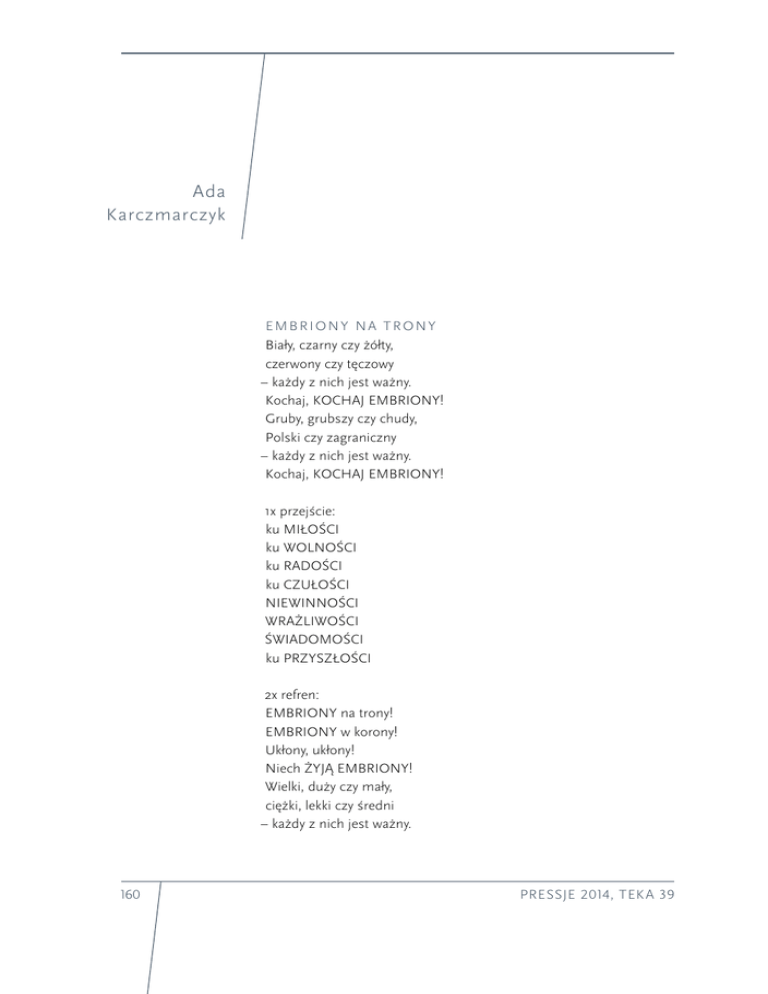 Ada Karczmarczyk EMBRIONY NA TRONY Biały, czarny czy żółty, czerwony czy tęczowy – każdy z nich jest ważny. Kochaj, KOCHAJ EMBRIONY! Gruby, grubszy czy chudy, Polski czy zagraniczny – każdy z nich jest ważny. Kochaj, KOCHAJ EMBRIONY! 1x przejście: ku MIŁOŚCI ku WOLNOŚCI ku RADOŚCI ku CZUŁOŚCI NIEWINNOŚCI WRAŻLIWOŚCI ŚWIADOMOŚCI ku PRZYSZŁOŚCI 2x refren: EMBRIONY na trony! EMBRIONY w korony! Ukłony, ukłony! Niech ŻYJĄ EMBRIONY! Wielki, duży czy mały, ciężki, lekki czy średni – każdy z nich jest ważny. 160 PRESSJE 2014, TEKA 39 Kochaj, KOCHAJ EMBRIONY! CZŁOWIECZY czy marsjański, z MIŁOŚCI czy z MIŁOŚCI – każdy z nich jest ważny. Kochaj, KOCHAJ EMBRIONY! 2x refren: EMBRIONY NA TRONY!… Eneduelikefake niech EMBRIONY zniszczą czachę, niech zdetronizują kakę demona i jego pakę. Anse banse i kabanse niech przygniotą czachę TAŃCEM, rozprują jej twardy pancerz i wygrają o TRON walkę! 1x przejście: ku MIŁOŚCI… I D Ź D O Ś W I AT Ł A I N I E P I E R D O L ! Noś się fajnie w PRAWDZIE, pindrz się w samo DOBRO, trzaskaj banię PIĘKNEM woź się z MATKĄ BOSKĄ, chlej do dna NADZIEJĘ, jaraj TRANSCENDENCJĘ, spuść cieniowi łomot i nawal się SERCEM. Chodź tu! Nie stój i się nie bój! Wszystko wokół/W OKU na maxa MIŁUJ! Nie truj! Nie pluj! Nie panikuj! Podaj RĘCE, otwórz SERCE i już/chuj! refren: Idź do ŚWIATŁA i nie pierdol! Daj się ponieść z nim w jedność! Kieruj się na KRZYŻ I Z OKIEM TRÓJKĄT! WIERSZE • ADA KARCZMARCZYK 161 Zostaw w tyle cały mrok! Idź do ŚWIATŁA i nie pierdol! Idź do ŚWIATŁA i nie pierdol! Lęki gnieć NADZIEJĄ, czachy niszcz KOLOREM, i strzelaj złym duchom niewidzialne GOLE. Jaraj się POWIETRZEM, wkręć się w JASNĄ PRZESTRZEŃ, bełtaj rzadkim grzechem, z BOGA mniej tabletę. Przejście: Chodź tu! Nie stój i się nie bój!… refren: Idź do ŚWIATŁA i nie pierdol!… Idź do ŚWIATŁA i nie pierdol Idź do ŚWIATŁA i nie pierdol AaaaaaaaaaAaaaaaaaAaaaaaa! AaaaaaaaAaaaaaaaAaaaaaaaa! JARAJ SIĘ MARIĄ MARIA cię ZASŁONI przed gnojem na dzielni. Kiedy pustka w głowie MARIA ją WYPEŁNI. MARIA nie wystawia, zawsze WYRATUJE, MARIA to jest klasa, z NIĄ się wyluzujesz. 2x refren: Jaraj się MARIĄ, jaraj się MARIĄ za darmo! 162 PRESSJE 2014, TEKA 39 Jaraj się MARIĄ, jaraj się MARIĄ! MARIA trzyma POZIOM i na wszelki ból daje RADĘ. Z MARIĄ chodź do klubu i z MARIĄ chodź też plażę, na plażę, na plażę. MARIA NIE UDAJE, zawsze zdrapie cię z chodnika. Z MARIĄ chodź na spacer z psem, z MARIĄ nakarm chomika, chomika, chomika. 2x refren: Jaraj się MARIĄ… To prawdziwa lekkość, to prawdziwa WOLNOŚĆ kiedy się potrafi zajarać MADONNĄ. To dla DUSZY NIEBO, to dla DUSZY rozkosz kiedy się potrafi jarać MATKĄ BOSKĄ. 4x chór: uuuooooooooouuuooo 2x refren: Jaraj się MARIĄ… 2x chór: uuuooooooooouuuooo WIERSZE • ADA KARCZMARCZYK 163 CO TY WIESZ O MARII (kiss-DISS na Tede, odpowiedź na Najaraj się marią) Kiedy Ty pieluchy miałeś w gaciach ja z MARIĄ kręciłam bata na cierpienie, ego, przemoc, na problemy tego świata. Kiedy byłeś przedszkolakiem ja z MARIĄ wciągałam papier, ze ŚWIĘTEGO PISMA napęd by TRENOWAĆ SWÓJ CHARAKTER. Kiedy kupę w spodniach miałeś ja z MARIĄ łykałam białe opłatki/OPŁATKI w liturgii/LITURGII szale by ułożyć sobie banie. Gdy byłeś małym pozerem ja wdychałam z MODLITW kleje wiążąc duszę moją z NIEBEM na tripie w moim KOŚCIELE. Refren: Co Ty wiesz, co ty wiesz, co Ty wiesz o MARII wiesz?! Co Ty chcesz, co ty chcesz, co Ty chcesz od MARII chcesz?! Gdy w czapie miałeś pompona ja z MARIĄ chlałam PLATONA. Gdy dmuchałeś se balona z TRANSCENDENCJI ćpałam glona. Kiedy gile w nosie miałeś ja z MARIĄ trzymałam sztamę, trenowałam patrząc na nią MIŁOŚĆ, TROSKĘ, CZUŁOŚĆ, WIARĘ! Kiedy byłeś w podstawówie ja wcinałam KSIĘGI grube, zajarzyłam, że ŁZY MARII robią z bólu cukier puder. Kiedy byłeś małym gnojkiem, gdy lazłeś do szkoły z workiem, gdy bawiłeś się rozporkiem 164 PRESSJE 2014, TEKA 39 MARIA była dla mnie WZORCEM! Refren: Co Ty wiesz, co Ty wiesz… Zanim najarasz się MARIĄ lepiej zrzuć lanserstwa sadło. Sprawdź JEJ JAKOŚĆ, CZYSTOŚĆ, WARTOŚĆ. Dzielić się nią zawsze warto. Zanim najarasz się MARIĄ, wyrzuć egoizmu hardkor bo MARIA którą się jaram to ta która jest ZA DARMO. Refren 2: Co Ty wiesz, co Ty, co Ty wiesz, co Ty wiesz o MARII, MARII wiesz?! Co Ty chcesz, co Ty, co Ty chcesz, co Ty chcesz od MARII, MARII chcesz?! Nie mam nic do Ciebie Tede lecz w twej marii widzę biedę. Weź chłopaku SIĘ OGARNIJ I zasmakuj w mojej MARII. BIT Z SERCA JEZUSA 4x chór: ALLELUJA! ALLELUJA! ALLELUJA!ALLELUJA! 2x refren: Mocny bit, mocny bit, bit z SERCA JEZUSA! Gruby bass, gruby bass, bass ze SŁÓW CHRYSTUSA! Na zatrucia – bit z SERCA JEZUSA Na oplucia – bit z SERCA JEZUSA Na złe przeczucia – bit z Z SERCA JEZUSA Na brak współczucia – bit z Z SERCA JEZUSA WIERSZE • ADA KARCZMARCZYK 165 Na nakłucia – bit z SERCA JEZUSA Na kaktusa – bit z SERCA JEZUSA Na złe knucia – bit z SERCA JEZUSA Na minusa – bit z SERCA JEZUSA 2x refren: Mocny bit, mocny bit, bit z SERCA JEZUSA! Gruby bass, gruby bass, bass ze SŁÓW CHRYSTUSA! 8x chór: ALLELUJA ALLELUJA ALLELUJA ALLELUJA SENSUALNA (Cover utworu Sexualna zespołu Mirami) Przejście: y a aayaaaaa y a aayaaaaa y a aayaaaaa y a aayaaaaa SENSUALNA jestem sobie, że aż nie wiesz co robić. Modlisz się co noc byś mógł o numer mój mnie poprosić. Dla takich jak ja trzeba się zawsze nieźle napocić, by mnie zgiąć i wziąć na spacer, by SERCE moje zdobyć. Nie działają na mnie drinki i nie działa na mnie sex, opowieści i malinki i romansów pustych dreszcz. Nie nabieram się na fury ani w mętnych oczu żar bo nie działa na mnie ściema tylko DUSZY CZYSTEJ CZAR! Refren: SENSUALNA, pożyteczna – KATOLICZKA zawsze jest STATECZNA. Jeśli kiedyś takiej chciałeś POŚWIĘĆ 