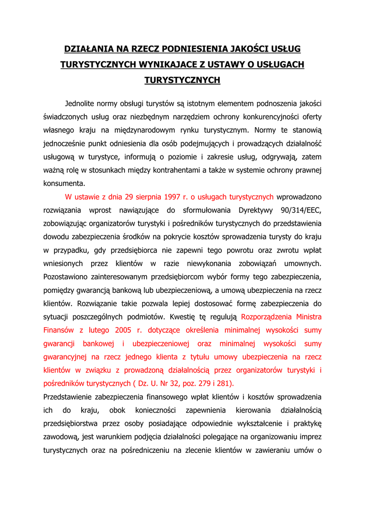 DZIAŁANIA NA RZECZ PODNIESIENIA JAKOŚCI USŁUG TURYSTYCZNYCH WYNIKAJACE Z USTAWY O USŁUGACH TURYSTYCZNYCH Jednolite normy obsługi turystów są istotnym elementem podnoszenia jakości świadczonych usług oraz niezbędnym narzędziem ochrony konkurencyjności oferty własnego kraju na międzynarodowym rynku turystycznym. Normy te stanowią jednocześnie punkt odniesienia dla osób podejmujących i prowadzących działalność usługową w turystyce, informują o poziomie i zakresie usług, odgrywają, zatem waŜną rolę w stosunkach między kontrahentami a takŜe w systemie ochrony prawnej konsumenta. W ustawie z dnia 29 sierpnia 1997 r. o usługach turystycznych wprowadzono rozwiązania wprost nawiązujące do sformułowania Dyrektywy 90/314/EEC, zobowiązując organizatorów turystyki i pośredników turystycznych do przedstawienia dowodu zabezpieczenia środków na pokrycie kosztów sprowadzenia turysty do kraju w przypadku, gdy przedsiębiorca nie zapewni tego powrotu oraz zwrotu wpłat wniesionych przez klientów w razie niewykonania zobowiązań umownych. Pozostawiono zainteresowanym przedsiębiorcom wybór formy tego zabezpieczenia, pomiędzy gwarancją bankową lub ubezpieczeniową, a umową ubezpieczenia na rzecz klientów. Rozwiązanie takie pozwala lepiej dostosować formę zabezpieczenia do sytuacji poszczególnych podmiotów. Kwestię tę regulują Rozporządzenia Ministra Finansów z lutego 2005 r. dotyczące określenia minimalnej wysokości sumy gwarancji bankowej i ubezpieczeniowej oraz minimalnej wysokości sumy gwarancyjnej na rzecz jednego klienta z tytułu umowy ubezpieczenia na rzecz klientów w związku z prowadzoną działalnością przez organizatorów turystyki i pośredników turystycznych ( Dz. U. Nr 32, poz. 279 i 281). Przedstawienie zabezpieczenia finansowego wpłat klientów i kosztów sprowadzenia ich do kraju, obok konieczności zapewnienia kierowania działalnością przedsiębiorstwa przez osoby posiadające odpowiednie wykształcenie i praktykę zawodową, jest warunkiem podjęcia działalności polegające na organizowaniu imprez turystycznych oraz na pośredniczeniu na zlecenie klientów w zawieraniu umów o świadczenie usług turystycznych oraz uzyskania wpisu do rejestru działalności regulowanej zgodnie z zapisami ustawy o swobodzie działalności regulowanej. Obligatoryjnym elementem stosunku prawnego łączącego organizatora turystyki i klienta, w przypadku imprez odbywających się za granicą, jest istniejący po stronie organizatora obowiązek zawarcia na rzecz osób uczestniczących w tych imprezach umów ubezpieczenia od następstw nieszczęśliwych wypadków i kosztów leczenia. Istotnym elementem jakości usług turystycznych wprowadzonym przedmiotową ustawą jest system klasyfikacji i kategoryzacji turystycznej bazy noclegowej, który powinien zapewnić: • zgodność ze standardami europejskimi, • wyznaczenie podstawowego poziomu jakości, poniŜej którego świadczenie usług nie jest dopuszczalne, zarówno ze względu na wymagania sanitarne, jak teŜ szerzej rozumianą ochronę interesów konsumenta. Bardzo waŜnym mechanizmem działania na rzecz poprawy jakości usług noclegowych w turystyce jest wprowadzenie w ustawie o usługach turystycznych ochrony prawnej nazwy rodzajowej dla obiektów hotelarskich. Ustawa jest teŜ podstawą do wprowadzenia systemu uzyskiwania uprawnień pilota wycieczek i przewodnika turystycznego, opartego o jednolite wymagania kwalifikacyjne wobec tych kadr. Nadawanie uprawnień pilotom wycieczek i przewodnikom turystycznym powierzono początkowo wojewodom a obecnie znajdują się w kompetencjach marszałków województw. To właśnie od jakości pracy tych ludzi zaleŜy w duŜej mierze zadowolenie i spełnienie oczekiwań klienta, mierzone między innymi poczuciem bezpieczeństwa, a tym samym osiągnięcie sukcesu organizatora turystyki. Istotnym elementem związanym z jakością jest dostarczenie nabywcom /klientom/ usług turystycznych pełnych i obiektywnych informacji o organizatorach imprez turystycznych i pośrednikach turystycznych działających na rynku. Na mocy ustawy z dnia 29 sierpnia 1997 r. o usługach turystycznych utworzono centralną ewidencję organizatorów turystyki i pośredników turystycznych. Centralna ewidencja zapewnia wszystkim zainteresowanym moŜliwość łatwego uzyskania informacji o legalności działania przedsiębiorców turystycznych prowadzących organizację imprez turystycznych i pośrednictwa turystycznego oraz o wysokości posiadanych przez nich zabezpieczeń finansowych. Ewidencja ta umoŜliwia uzyskanie tych informacji zarówno klientom jak i przedsiębiorcom, bez względu na siedzibę przedsiębiorcy posiadającego odpowiednie zezwolenie wydane w Polsce. Szczegółowe zasady i tryb prowadzenia Centralnej ewidencji oraz dokumenty i dane, na podstawie których dokonuje się wpisu do rejestru określa Rozporządzenie Ministra Gospodarki z dnia 30 grudnia 2005 r. w sprawie Centralnej Ewidencji Organizatorów Turystyki i Pośredników Turystycznych ( Dz. U. z 2006 Nr 5, poz. 28). Istotnym uregulowaniem z punktu widzenia konieczności ograniczania tzw. "szarej strefy" w świadczeniu usług turystycznych oraz zapewnienie odpowiedniej ich jakości było wyposaŜenie marszałka województwa oraz ministra właściwego do spraw turystyki w uprawnienia kontrolne w stosunku do przedsiębiorców, w zakresie prowadzenia przez nich działalności gospodarczej polegającej na świadczeniu usług turystycznych zgodnie z wymogami ustawy. Uprawnienia te dotyczą upowaŜnienia w zakresie: • kontroli organizatorów turystyki i pośredników turystycznych, pod kątem spełniania wymagań niezbędnych do uzyskania zezwolenia, zgodności prowadzonej działalności z wydanym zezwoleniem, przestrzegania warunków wykonywania działalności gospodarczej określonych ustawą; • kontroli działalności prowadzonej agentów działalności z turystycznych zawartymi w umowami zak