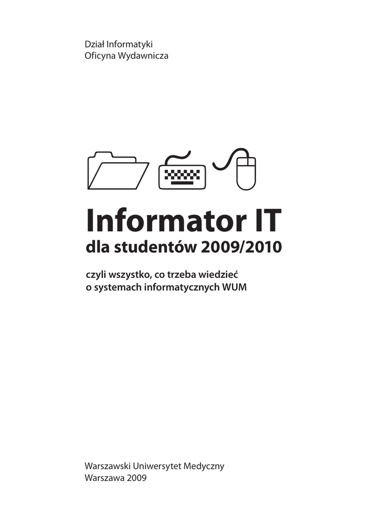 Dział Informatyki Oficyna Wydawnicza 178 Informator IT dla studentów 2009/2010 czyli wszystko, co trzeba wiedzieć o systemach informatycznych WUM Warszawski Uniwersytet Medyczny Warszawa 2009 UWAGA zapisywanie adresu witryny internetowej w formacie www.witryna.pl jest konwencją w komunikacji marketingowej, jednak istnieją witryny nieposiadające prefiksu www. Należą do nich niektóre witryny i serwisy na serwerach WUM. Dlatego prosimy nie dopisywać www na początku adresów, jeśli w Informatorze adres witryny podany jest bez niego. Spis treści Elektroniczna Legitymacja Studencka................................................................. 4 Konto w Centralnym Systemie Autoryzacji...................................................... 5 Portal SSL-VPN............................................................................................................................ 6 Poczta elektroniczna............................................................................................................ 6 Stanowiska komputerowe z dostępem do internetu............................. 7 WiFi – bezprzewodowy dostęp do internetu.................................................. 8 System Centralnego Wydruku...................................................................................10 Instalacja drukarki Systemu Centralnego Wydruku.....................11 Centrum Pobierania Oprogramowania.............................................................14 Witryny SKN-ów......................................................................................................................15 Witryny wydarzeń.................................................................................................................15 Adresy e-mail SKN-ów i wydarzeń.........................................................................15 System biblioteczny SOWA...........................................................................................15 Kontakt i zgłaszanie problemów.............................................................................16 Informator IT dla studentów 2009/2010 080 01234567 Nr albumu: 012345 Numer albumu (indeksu), poprzedzony literką s, jest loginem w Centralnym Systemie Autoryzacji (str. 5) Numer wydrukowany na rewersie ELS, zapisany bez spacji, stanowi hasło startowe w Centralnym Systemie Autoryzacji (str. 5) Elektroniczna Legitymacja Studencka Elektroniczna Legitymacja Studencka (ELS) to dokument potwierdzający status studenta WUM. Zawiera dane osobowe i zdjęcie studenta oraz miejsce na przyklejenie hologramów informujących o kolejnych semestrach nauki. Wyposażona jest w chip, który pozwala na zakodowanie dodatkowych funkcji: • B ilet komunikacji miejskiej. ELS są zintegrowane z systemem Warszawskiej Karty Miejskiej i umożliwiają identyfikację zniżki studenckiej, można korzystać z nich jak z biletu okresowego w środkach transportu miejskiego. • Karta do Systemu Centralnego Wydruku. Umożliwia kopiowanie i drukowanie na urządzeniach Systemu (str. 10). • Karta biblioteczna. Umożliwia korzystanie z wypożyczalni biblioteki WUM. • K arta wstępu (do niektórych sal WUM). ELS są drukowane na specjalnej drukarce przez Dział Informatyki i przekazywane dziekanatom, które aktywują je i wydają studentom. Opłata za ELS wynosi 17 zł. Data ważności ELS określana jest dwojako: przez elektroniczne zapisanie danych oraz naklejenie na rewersie karty hologramu. Co semestr należy przedłużyć ważność ELS w swoim dziekanacie. Każdy student otrzymuje jedną ELS, niezależnie od tego, na ilu kierunkach studiuje. UWAGA ważność ELS przedłuża wyłącznie dziekanat danego wydziału. Nieprzedłużenie ważności legitymacji skutkuje zablokowaniem konta w Centralnym Systemie Autoryzacji (str. 5), co oznacza utratę dostępu do systemów informatycznych WUM. W przypadku zagubienia ELS należy zgłosić się do dziekanatu. Opłata za wydanie duplikatu (wyrabiany w ciągu ok. 3 dni) wynosi 25,50 zł. W takim przypadku hasło studenta w Centralnym Systemie Autoryzacji jest resetowane i ustawiane na numer wydrukowany na rewersie nowej ELS. ELS są drukowane na blankietach, których wzór został wprowadzony Rozporządzeniem Ministerstwa Edukacji Narodowej i Sportu z dnia 2.11.2006 r. w sprawie dokumentacji przebiegu studiów (Dz. U. 2006, Nr 224, poz. 1634). Konto w Centralnym Systemie Autoryzacji Centralny System Autoryzacji to centralna baza danych o użytkownikach systemów informatycznych WUM. Konto w Centralnym Systemie Autoryzacji (tzw. konto domenowe) pozwala studentowi na dostęp za pomocą tego samego loginu i hasła do wszystkich zasobów informatycznych WUM udostępnianych studentom. Są to: • P ortal SSL-VPN (str. 6). Bramka do zasobów sieci wewnętrznej WUM (intranetu) oraz do medycznych baz danych. • Poczta elektroniczna (str. 6). • WiFi – sieć bezprzewodowa (str. 8). • W ebkioski i pracownie komputerowe (str. 7). Logowanie do komputera. Konta studentów w Centralnym Systemie Autoryzacji są uruchamiane w ciągu ok. 3 dni od przekazania dziekanatom ELS. Dane konta studenta w Centralnym Systemie Autoryzacji (konta domenowego): Login: sXXXXXX (mała literka s i sześć cyfr numeru albumu pisane ciągiem, np. s012345). Hasło startowe: ciąg cyfr wydrukowany na rewersie ELS pisany bez spacji. UWAGA hasło startowe należy ze względów bezpieczeństwa zmienić w zakładce Zmiana hasła w Centralnym Systemie Autoryzacji w Portalu SSL-VPN (ssl.wum.edu.pl ) przy pierwszym logowaniu. W przypadku zapomnienia własnego hasła należy zgłosić na adres [email protected] wniosek o przywrócenie hasła startowego. Hasło startowe należy zmienić na własne przy pierwszym logowaniu do Portalu SSL-VPN w zakładce Zmiana hasła w Centralnym Systemie Autoryzacji Informator IT dla studentów 2009/2010 Portal SSL-VPN Portal ssl.wum.edu.pl umożliwia dostęp z dowolnego miejsca na świecie do: • Intranetu uczelni – wewnęt