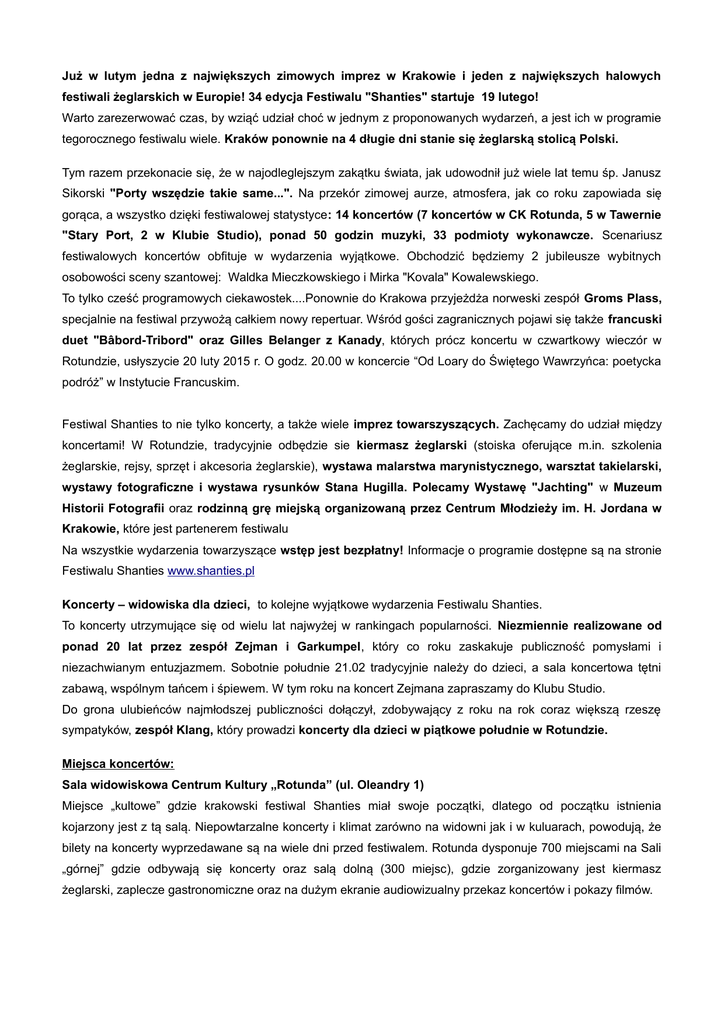 Już w lutym jedna z największych zimowych imprez w Krakowie i jeden z największych halowych festiwali żeglarskich w Europie! 34 edycja Festiwalu "Shanties" startuje 19 lutego! Warto zarezerwować czas, by wziąć udział choć w jednym z proponowanych wydarzeń, a jest ich w programie tegorocznego festiwalu wiele. Kraków ponownie na 4 długie dni stanie się żeglarską stolicą Polski. Tym razem przekonacie się, że w najodleglejszym zakątku świata, jak udowodnił już wiele lat temu śp. Janusz Sikorski "Porty wszędzie takie same...". Na przekór zimowej aurze, atmosfera, jak co roku zapowiada się gorąca, a wszystko dzięki festiwalowej statystyce: 14 koncertów (7 koncertów w CK Rotunda, 5 w Tawernie "Stary Port, 2 w Klubie Studio), ponad 50 godzin muzyki, 33 podmioty wykonawcze. Scenariusz festiwalowych koncertów obfituje w wydarzenia wyjątkowe. Obchodzić będziemy 2 jubileusze wybitnych osobowości sceny szantowej: Waldka Mieczkowskiego i Mirka "Kovala" Kowalewskiego. To tylko cześć programowych ciekawostek....Ponownie do Krakowa przyjeżdża norweski zespół Groms Plass, specjalnie na festiwal przywożą całkiem nowy repertuar. Wśród gości zagranicznych pojawi się także francuski duet "Bâbord-Tribord" oraz Gilles Belanger z Kanady, których prócz koncertu w czwartkowy wieczór w Rotundzie, usłyszycie 20 luty 2015 r. O godz. 20.00 w koncercie “Od Loary do Świętego Wawrzyńca: poetycka podróż” w Instytucie Francuskim. Festiwal Shanties to nie tylko koncerty, a także wiele imprez towarszyszących. Zachęcamy do udział między koncertami! W Rotundzie, tradycyjnie odbędzie sie kiermasz żeglarski (stoiska oferujące m.in. szkolenia żeglarskie, rejsy, sprzęt i akcesoria żeglarskie), wystawa malarstwa marynistycznego, warsztat takielarski, wystawy fotograficzne i wystawa rysunków Stana Hugilla. Polecamy Wystawę "Jachting" w Muzeum Historii Fotografii oraz rodzinną grę miejską organizowaną przez Centrum Młodzieży im. H. Jordana w Krakowie, które jest partenerem festiwalu Na wszystkie wydarzenia towarzyszące wstęp jest bezpłatny! Informacje o programie dostępne są na stronie Festiwalu Shanties www.shanties.pl Koncerty – widowiska dla dzieci, to kolejne wyjątkowe wydarzenia Festiwalu Shanties. To koncerty utrzymujące się od wielu lat najwyżej w rankingach popularności. Niezmiennie realizowane od ponad 20 lat przez zespół Zejman i Garkumpel, który co roku zaskakuje publiczność pomysłami i niezachwianym entuzjazmem. Sobotnie południe 21.02 tradycyjnie należy do dzieci, a sala koncertowa tętni zabawą, wspólnym tańcem i śpiewem. W tym roku na koncert Zejmana zapraszamy do Klubu Studio. Do grona ulubieńców najmłodszej publiczności dołączył, zdobywający z roku na rok coraz większą rzeszę sympatyków, zespół Klang, który prowadzi koncerty dla dzieci w piątkowe południe w Rotundzie. Miejsca koncertów: Sala widowiskowa Centrum Kultury „Rotunda” (ul. Oleandry 1) Miejsce „kultowe” gdzie krakowski festiwal Shanties miał swoje początki, dlatego od początku istnienia kojarzony jest z tą salą. Niepowtarzalne koncerty i klimat zarówno na widowni jak i w kuluarach, powodują, że bilety na koncerty wyprzedawane są na wiele dni przed festiwalem. Rotunda dysponuje 700 miejscami na Sali „górnej” gdzie odbywają się koncerty oraz salą dolną (300 miejsc), gdzie zorganizowany jest kiermasz żeglarski, zaplecze gastronomiczne oraz na dużym ekranie audiowizualny przekaz koncertów i pokazy filmów. Tawerna Festiwalowa – Tawerna Żeglarska „Stary Port” (ul. Straszewskiego 27) To miejsce od początku swego istnienia towarzyszące koncertom festiwalowym, stało się "mekką" festiwalowej publiczności, w której koncerty mają już swoją naturalną kuluarową kontynuację. Wspólne śpiewanie szant i spotkania z wykonawcami trwają do białego rana. W tawernie w każdy festiwalowy wieczór spotyka się ponad 400 osób. Klub „Studio” Sala koncertowa na 1300 osób usytuowana w samym centrum miasteczka akademickiego AGH, na co dzień klub studencki i muzyczny z ambitnym programem koncertów i wydarzeń artystycznych. Kontynuując ideę organizowania Shanties w różnych miejscach Krakowa i wykorzystując możliwości widowni na ponad 1300 miejsc 2 koncerty Shanties 2015 odbędą się właśnie w Klubie Studio. Honorowy Patronat nad Festiwalem Shanties 2015 przyjęli: Prezydent Miasta Krakowa Jacek Majchrowski Marszałek Województwa Małopolskiego Marek Sowa Prezes Polskiego Związku Żeglarskiego Wiesław Kaczmarek 19 lutego (czwartek) CK Rotunda godz. 19.00 „Port to jest poezja…” - koncert żeglarzy-poetów (R1) reż. i prow.: Paweł Jędrzejko, Jerzy Porębski i Piotr Zadrożny Wystąpią: Wojciech "Biesiad" Besiadecki, Krzysztof Jurkiewicz, Andrzej Korycki, Mirosław Kowalewski Jerzy Porębski, Piotr Zadrożny, Daniel Grall i Nico Brung (Francja), Gilles Belanger (Kanada) 20 lutego (piątek) CK Rotunda godz. 12.00 "Z żeglarzami w świat" - koncert dla dzieci (R2) reż. i prow.: zespół Klang CK Rotunda godz. 19.00 „Pańskie zdrowie, Kapitanie!”, czyli wieczór kapitański z okazji Jubileuszu 35-lecia pracy scenicznej Kapitana Waldemara Mieczkowskiego (R3) reż. i prow.: oficer k-owiec Jacek Jakubowski i Krzysztof Jurkiewicz Wystąpią: EKT Gdynia, Formacja, Klang, Andrzej Korycki i Dominika Żukowska, Waldemar Mieczkowski, Jerzy Porębski oraz goście Klub Studio godz. 22.00 „Na statku bunt …”, czyli szantowa noc piratów (S4) reż. i prow.: zespół Mietek Folk Olsztyn Wystąpią: EKT Gdynia, Groms Plass (Norwegia), Mietek Folk Olsztyn, Orkiestra Samanta, Trzy Maszty, Zejman i Garkumpel 21 lutego (sobota) Klub Studio godz.12.00 "Uroczyste i bajkowe urodziny Zejmanowe" - koncert dla dzieci (S5) reż. i prow.: zespół Zejman i Garkumpel CK Rotunda godz. 17.00 „Co się zdarzyło jeden raz …” - koncert nie tylko portowych opowieści (R6) reż. i prow.: zespół Klang Wyst