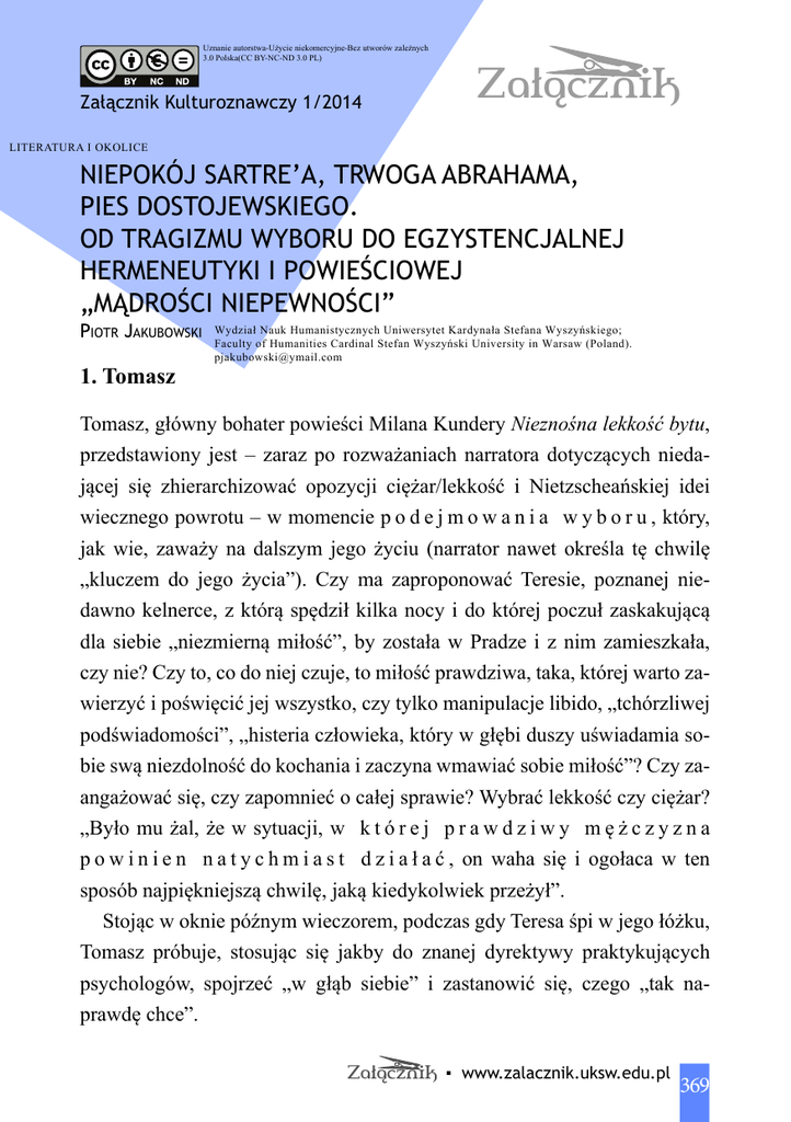Uznanie autorstwa-Użycie niekomercyjne-Bez utworów zależnych 3.0 Polska(CC BY-NC-ND 3.0 PL) Załącznik Kulturoznawczy 1/2014 Załącznik LITERATURA I OKOLICE NIEPOKÓJ SARTRE’A, TRWOGA ABRAHAMA, PIES DOSTOJEWSKIEGO. OD TRAGIZMU WYBORU DO EGZYSTENCJALNEJ HERMENEUTYKI I POWIEŚCIOWEJ „MĄDROŚCI NIEPEWNOŚCI” Piotr Jakubowski 1. Tomasz Wydział Nauk Humanistycznych Uniwersytet Kardynała Stefana Wyszyńskiego; Faculty of Humanities Cardinal Stefan Wyszyński University in Warsaw (Poland). [email protected] Tomasz, główny bohater powieści Milana Kundery Nieznośna lekkość bytu, przedstawiony jest – zaraz po rozważaniach narratora dotyczących niedającej się zhierarchizować opozycji ciężar/lekkość i Nietzscheańskiej idei wiecznego powrotu – w momencie p o d e j m o w a n i a w y b o r u , który, jak wie, zaważy na dalszym jego życiu (narrator nawet określa tę chwilę „kluczem do jego życia”). Czy ma zaproponować Teresie, poznanej niedawno kelnerce, z którą spędził kilka nocy i do której poczuł zaskakującą dla siebie „niezmierną miłość”, by została w Pradze i z nim zamieszkała, czy nie? Czy to, co do niej czuje, to miłość prawdziwa, taka, której warto zawierzyć i poświęcić jej wszystko, czy tylko manipulacje libido, „tchórzliwej podświadomości”, „histeria człowieka, który w głębi duszy uświadamia sobie swą niezdolność do kochania i zaczyna wmawiać sobie miłość”? Czy zaangażować się, czy zapomnieć o całej sprawie? Wybrać lekkość czy ciężar? „Było mu żal, że w sytuacji, w k t ó r e j p r a w d z i w y m ę ż c z y z n a p o w i n i e n n a t y c h m i a s t d z i a ł a ć , on waha się i ogołaca w ten sposób najpiękniejszą chwilę, jaką kiedykolwiek przeżył”. Stojąc w oknie późnym wieczorem, podczas gdy Teresa śpi w jego łóżku, Tomasz próbuje, stosując się jakby do znanej dyrektywy praktykujących psychologów, spojrzeć „w głąb siebie” i zastanowić się, czego „tak naprawdę chce”. Załącznik ▪ www.zalacznik.uksw.edu.pl 369 PIOTR JAKUBOWSKI Złościł się na siebie, a potem przyszło mu do głowy, iż to, że nie wie, czego chce, jest właściwie zupełnie naturalne. C z ł o w i e k n i g d y n i e może wiedzieć, czego ma chcieć, ponieważ dane mu jest tylko jedno życie i nie może go w żaden sposób porównać ze swymi poprzednimi życiami ani s k o r y g o w a ć w n a s t ę p n y c h . [ … ] N i e m a ż a d n e j m o ż liwości, by sprawdzić, która decyzja jest lepsza, bo nie istnieje możliwość porównania. Człowiek przeżywa wszystko po raz pierwszy i bez przygot o w a n i a . To tak, jakby aktor grał przedstawienie bez żadnej próby. Cóż może być warte życie, jeśli pierwsza próba już jest życiem ostatecznym?1 Intencje, cele, pragnienia są więc niczym wobec prostego i dobitnego w swej prostocie faktu nieznajomości przyszłości, dalekosiężnych konsekwencji własnych decyzji i działań, które to konsekwencje nie poddają się kalkulacji. Nie znam siebie z przyszłości, jak więc mogę, dokonując teraz wyboru, decydować o sobie, o swoim losie? Wiem przy tym, że ten „ja”, który teraz podejmuje decyzję, będzie odpowiedzialny wobec „ja” z przyszłości za jego położenie. Czyż nie mówi się, że „trzeba ponosić konsekwencje swoich wyborów”, „wypijać piwo, które się nawarzyło”? Tyle tylko, zdaje się mówić Kundera, że nie wybieramy konsekwencji swoich wyborów, następują one w znacznym stopniu poza naszą kontrolą i mocą stanowienia. Dlatego też w autotematycznym komentarzu do Nieznośnej lekkości bytu powie on o „n i e d o ś w i a d c z e n i u j a k o w ł a ś c i w o ś c i k o n d y c j i l u d z k i e j ”2. Wszystkie powyższe cytaty pochodzą z: M. Kundera, Nieznośna lekkość bytu, tłum. A. Holland, Warszawa 2001, s. 4-5; podkreślenia P.J. 2 M. Kundera, Sześćdziesiąt pięć słów, [w:] tegoż, Sztuka powieści, tłum. M. Bieńczyk, Warszawa 2004, s. 121. 1 370 2014 Załącznik Kulturoznawczy ▪ nr1 NIEPOKÓJ SARTRE’A... 2. Jean-Paul W wykładzie Egzystencjalizm jest humanizmem – w którym Jean-Paul Sartre podejmuje się zrekapitulowania podstawowych tez swego traktatu Byt i nicość, a także obrony filozofii egzystencjalistycznej przed krytyką marksistowskich towarzyszy – filozof podaje analogiczny wobec „kazusu Tomasza” przykład swojego ucznia, który przyszedł do niego po radę. Uczeń ów zastanawiał się, czy powinien przyłączyć się do ruchu oporu i w trosce o swoją ojczyznę walczyć z nazistami, czy raczej pozostać ze swoją samotną i schorowaną matką, jest bowiem jedynym jej dzieckiem. Sartre nie udzielił mu żadnej porady, a jedynie zasugerował, że wybierając jako doradcę swego nauczyciela (i znając jego poglądy), nie zaś na przykład spowiednika czy samą matkę, uczeń ów już sam zdecydował, co ma czynić, i właściwie nie porady, a potwierdzenia swojej decyzji poszukiwał. Historia ta stanowi niejako wprowadzenie do rozwinięcia przez Sartre’a jego słynnego twierdzenia „egzystencja poprzedza esencję” (czy „istnienie poprzedza istotę”): Człowiek najpierw istnieje, zdarza się, powstaje w świecie, a dopiero później się definiuje. Człowieka w pojęciu egzystencjalisty nie można zdefiniować dlatego, że jest on przede wszystkim niczym. Będzie on czymś dopiero później, i to będzie takim, jakim sam się uczynił. […] Człowiek jest tylko tym, czym siebie uczyni. […] Człowiek jest przede wszystkim projektem przeżywanym subiektywnie3. To e g z y s t e n c j a l n e o s a m o t n i e n i e [la delaissement] przybiera u Sartre’a wymiar: odpowiedzialności własnej, odpowiedzialności powszechnej, niepokoju i beznadziei. Ta pierwsza opiera się na tym, że nie sposób podjąć decyzji, a następnie usprawiedliwić ewentualnych konsekwencji J.-P. Sartre, Egzystencjalizm jest humanizmem, tłum. 