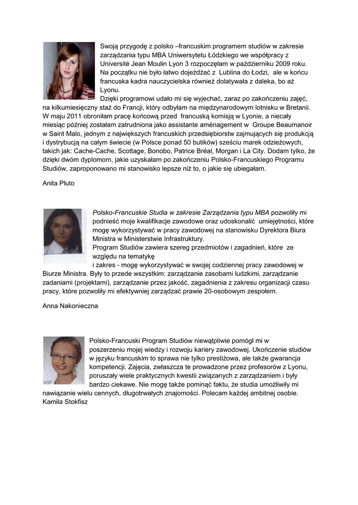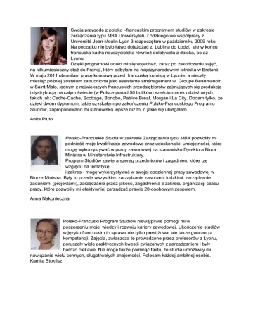Swoją przygodę z polsko –francuskim programem studiów w zakresie zarządzania typu MBA Uniwersytetu Łódzkiego we współpracy z Université Jean Moulin Lyon 3 rozpoczęłam w październiku 2009 roku. Na początku nie było łatwo dojeżdżać z Lublina do Łodzi, ale w końcu francuska kadra nauczycielska również dolatywała z daleka, bo aż Lyonu. Dzięki programowi udało mi się wyjechać, zaraz po zakończeniu zajęć, na kilkumiesięczny staż do Francji, który odbyłam na międzynarodowym lotnisku w Bretanii. W maju 2011 obroniłam pracę końcową przed francuską komisją w Lyonie, a niecały miesiąc później zostałam zatrudniona jako assistante aménagement w Groupe Beaumanoir w Saint Malo, jednym z największych francuskich przedsiębiorstw zajmujących się produkcją i dystrybucją na całym świecie (w Polsce ponad 50 butików) sześciu marek odzieżowych, takich jak: Cache-Cache, Scottage, Bonobo, Patrice Bréal, Morgan i La City. Dodam tylko, że dzięki dwóm dyplomom, jakie uzyskałam po zakończeniu Polsko-Francuskiego Programu Studiów, zaproponowano mi stanowisko lepsze niż to, o jakie się ubiegałam. Anita Pluto Polsko-Francuskie Studia w zakresie Zarządzania typu MBA pozwoliły mi podnieść moje kwalifikacje zawodowe oraz udoskonalić umiejętności, które mogę wykorzystywać w pracy zawodowej na stanowisku Dyrektora Biura Ministra w Ministerstwie Infrastruktury. Program Studiów zawiera szereg przedmiotów i zagadnień, które ze względu na tematykę i zakres - mogę wykorzystywać w swojej codziennej pracy zawodowej w Biurze Ministra. Były to przede wszystkim: zarządzanie zasobami ludzkimi, zarządzanie zadaniami (projektami), zarządzanie przez jakość, zagadnienia z zakresu organizacji czasu pracy, które pozwoliły mi efektywniej zarządzać prawie 20-osobowym zespołem. Anna Nakonieczna Polsko-Francuski Program Studiów niewątpliwie pomógł mi w poszerzeniu mojej wiedzy i rozwoju kariery zawodowej. Ukończenie studiów w języku francuskim to sprawa nie tylko prestiżowa, ale także gwarancja kompetencji. Zajęcia, zwłaszcza te prowadzone przez profesorów z Lyonu, poruszały wiele praktycznych kwestii związanych z zarządzaniem i były bardzo ciekawe. Nie mogę także pominąć faktu, że studia umożliwiły mi nawiązanie wielu cennych, długotrwałych znajomości. Polecam każdej ambitnej osobie. Kamila Stokfisz Szansa na międzynarodową karierę Na ostatnim roku Filologii Romańskiej UŁ rozpoczęłam naukę na PolskoFrancuskich Studiach z Zakresu Zarządzania typu MBA. To był strzał w dziesiątkę, ponieważ program studiów zawiera sporą dawkę wiedzy teoretycznej, ale także co cenne dostarcza również wiedzę praktyczną. Takie unikalne połączenie gwarantuje dodatkowe atuty na rynku pracy oraz łatwość rozpoczęcia kariery w międzynarodowych strukturach, o czym przekonałam się na własnym przykładzie. Dzięki Programowi rozpoczęłam pracę w znanej francuskiej korporacji, gdzie zajmowałam się migracją procesów księgowych, a obecnie jestem stypendystką Rządu Francuskiego i odbywam staż w firmie usytuowanej w biznesowej dzielnicy La Défense w Paryżu. Ponadto, podczas studiów poznałam wiele wartościowych osób, z którymi pozostaję w stałym kontakcie. Ada Bochenek Nie bez powodu zdecydowałam się na podyplomowe Polsko-Francuskie Studia z Zakresu Zarządzania typu MBA zorganizowane przez Uniwersytet Łódzki i Uniwersytet Lyon III. Dają one szansę na poznanie wielu dziedzin i ćwiczenia umiejętności niezbędnych dla pracy menedżera: rachunkowości, zarządzania kadrami, zarządzania strategią firmy, księgowości, handlu zagranicznego, zarządzania sprzedażą i marketingu. Uczą twórczego, samodzielnego podejścia do zarządzania. I co bardzo ważne – większość zajęć prowadzona jest po francusku, a ich absolwenci dostaną dyplomy obu uczelni. Spodziewam się, że te studia wpłyną pozytywnie na mój osobisty projekt zawodowy i pozwolą mi korzystać ze zdobytych doświadczeń w pracy oraz nowych wyzwaniach życiowych. Dominika Ostrowska-Augustyniak Studia MBA pomogły mi w zdobyciu mojej pierwszej pracy w firmie zajmującej się handlem zagranicznym (pracuję w dziale francuskim). Pracy zaczęłam szukać w czasie trwania pierwszego semestru zajęć na MBA i fakt, że oprócz ukończenia romanistyki na UW kształcę się w dziedzinie zarządzania biznesem miał dla moich pracodawców duże znaczenie o czym powiedzieli mi wprost podczas rozmowy kwalifikacyjnej. Efekty nauki widzę w pracy, przekonałam się nie raz, że dzięki studiom lepiej rozumiem procesy zachodzące w przedsiębiorstwie, poznaję obszary biznesu z którymi nie miałam do tej pory styczności, czuję się bardziej pewna podczas dyskusji z kontrahentami francuskimi. Na początku, do podjęcia tych studiów głównie motywowała mnie chęć pogłębienia znajomości języka francuskiego w dziedzinie biznesu oraz prawa, ponieważ chciałam zostać tłumaczem biznesowym. Studia MBA zawsze kojarzyły mi się z pewnym prestiżem, jednocześnie zdawałam sobie sprawę, że będę musiała ciężko pracować, ale dają one konkretne narzędzia do pracy, co mnie satysfakcjonuje. Maria Bombińska Polsko-Francuski Program Studiów w Zakresie Zarządzania typu MBA rozpoczęłam w październiku 2010 roku i uważam, że jest to bardzo dobry wybór dla ludzi chcących uzupełnić swoje wykształcenie, poszerzyć wiedzę z zakresu zarzązania przedsiębiorstwem bądź dla tych, którzy chcą się przebranżowić czy założyć swoją własną działalność. Dodatkowym atutem studiów jest to, że zajęcia odbywają się w języku francuskim i w języku polskim, co pozwala na rozwinięcie swoich umiejętności językowych i poznanie wielu obszarów zarządzania w kulturze francuskiej, jak i polskiej. Uważam, że studia te są bardzo pomocne w rozwoju zawodowym, a konsultacje z wykładowcami, którzy swoją wiedzę teoretyczną ł